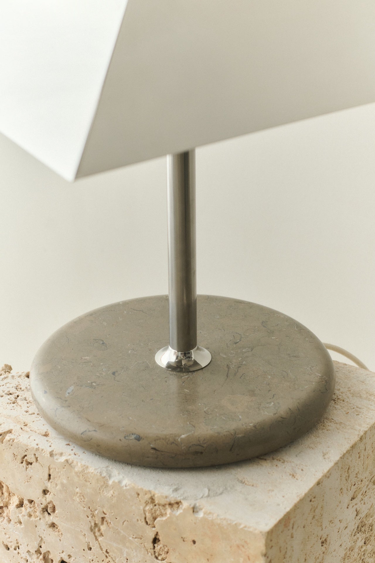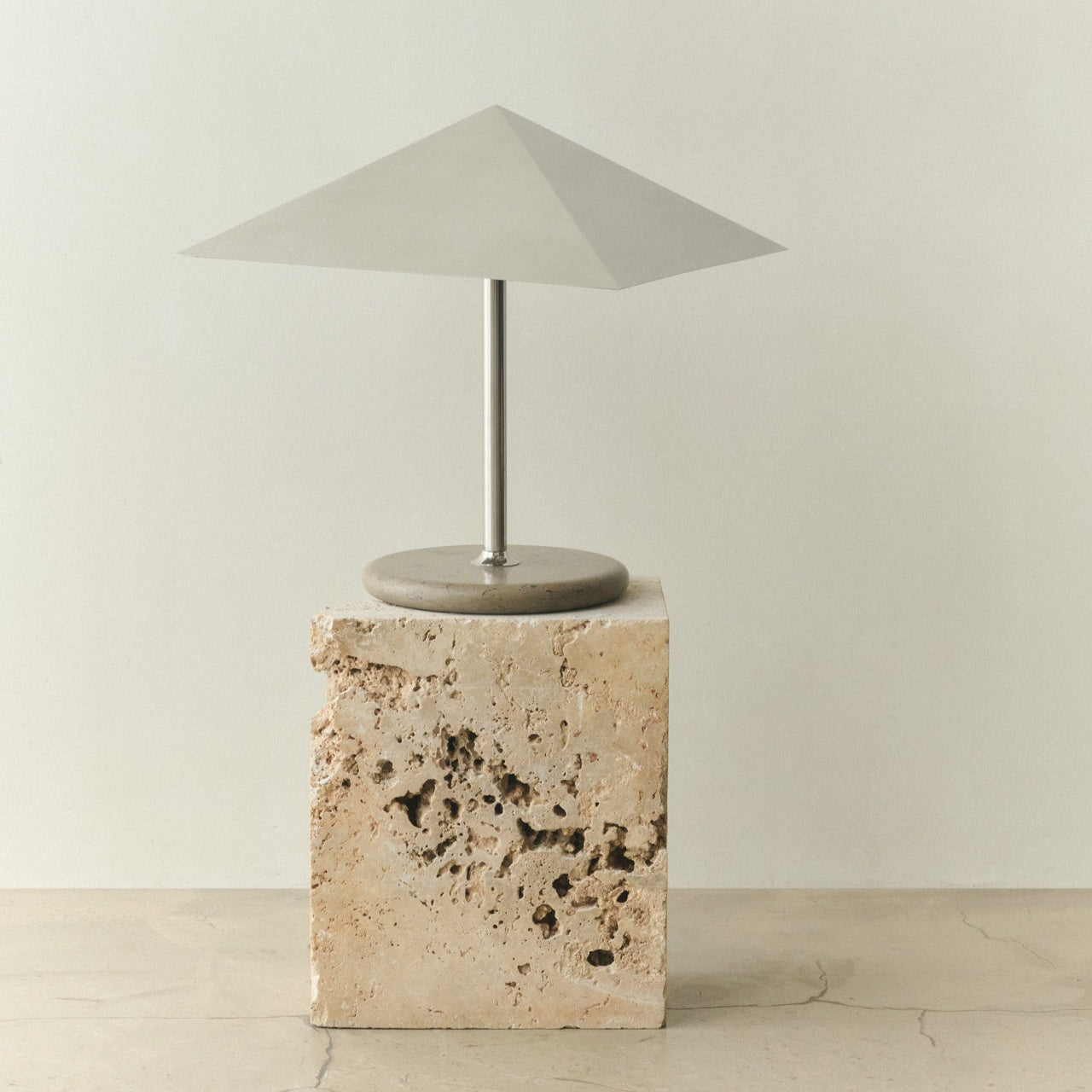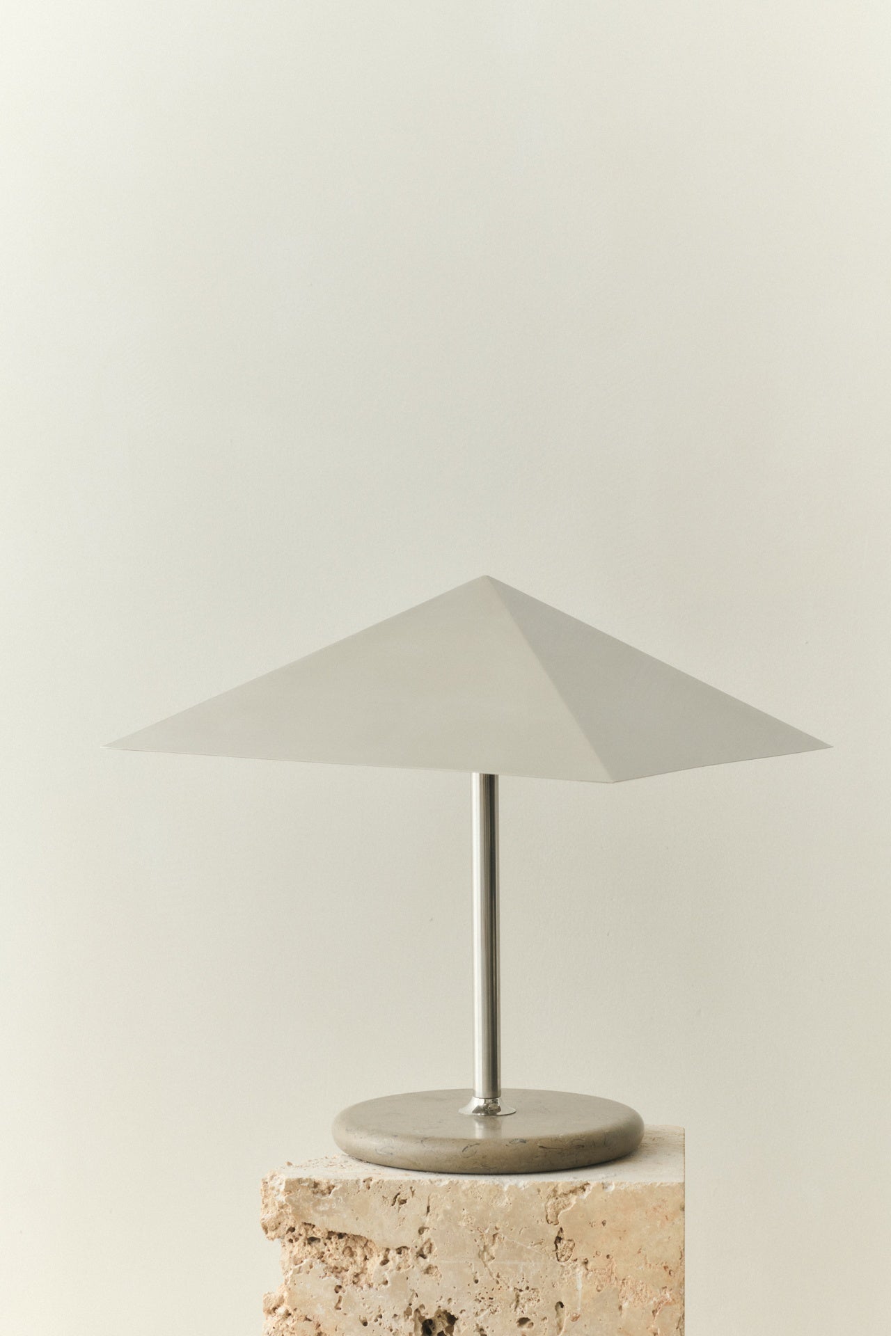 Den nye lampen til Louise Roe har en harmonisk og leken blanding av materialer. Stående høyt på en solid marmorbase, slank lampefot,og den reflekterende metallskjermen. Denne skyggen omfavner lyskilden som et loft, og skaper en omfattende fin glød.