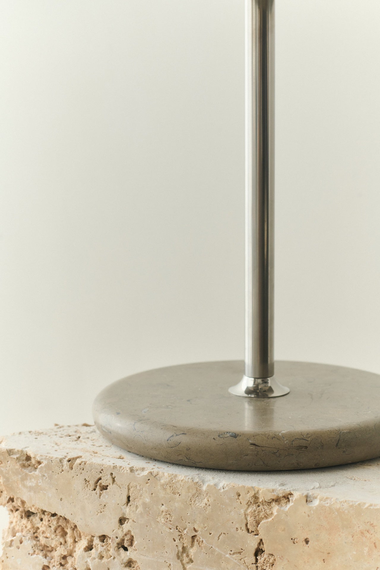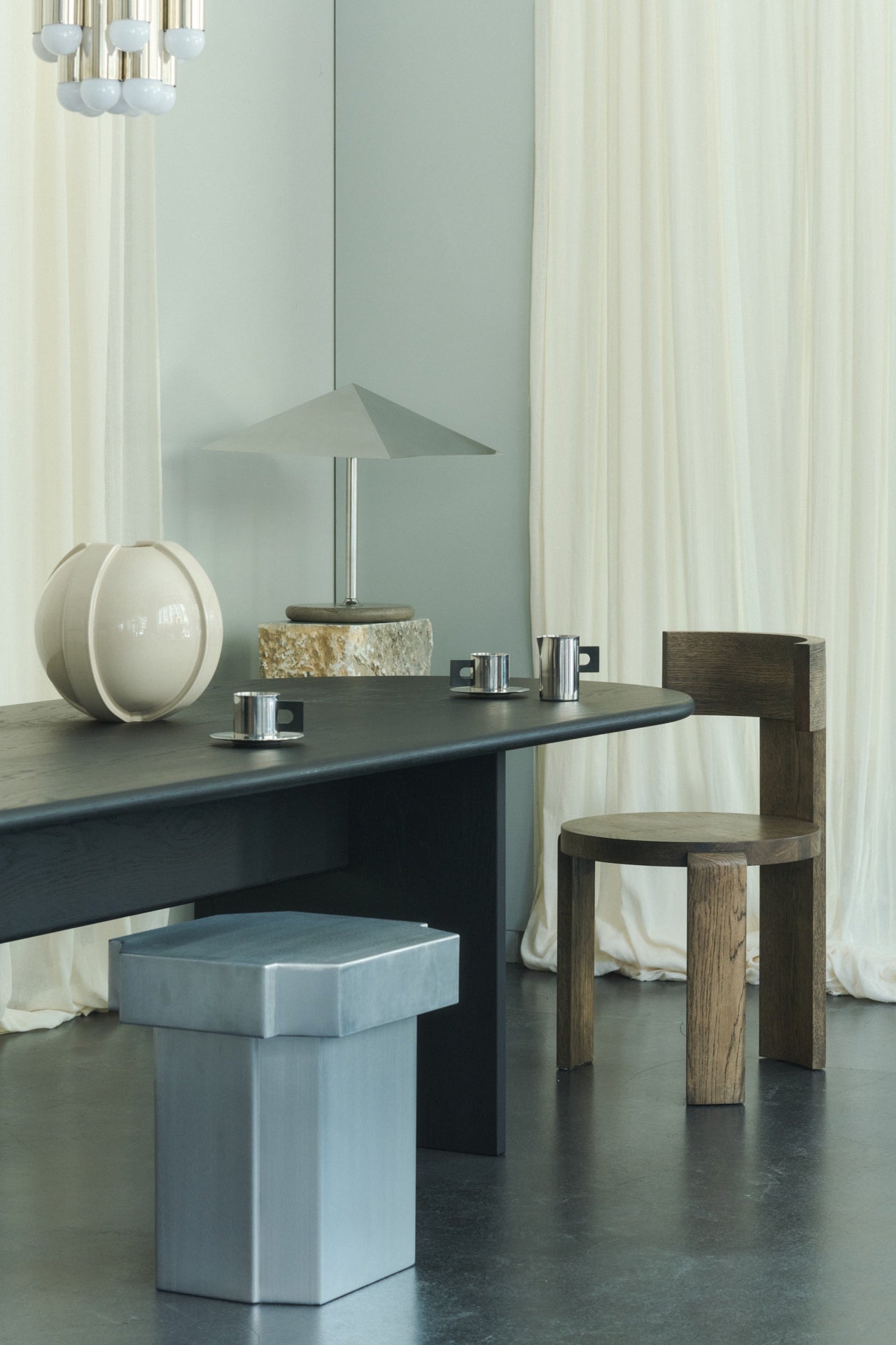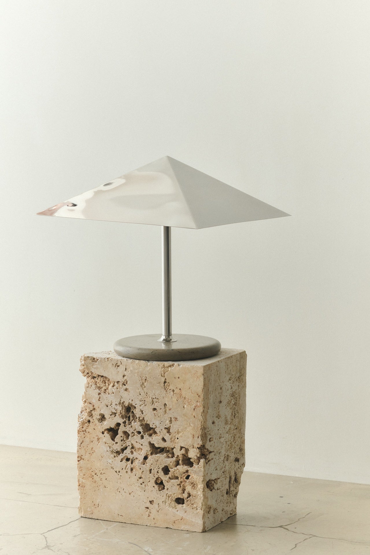 Den nye lampen til Louise Roe har en harmonisk og leken blanding av materialer. Stående høyt på en solid marmorbase, slank lampefot,og den reflekterende metallskjermen. Denne skyggen omfavner lyskilden som et loft, og skaper en omfattende fin glød.