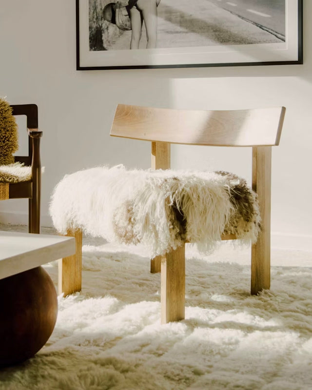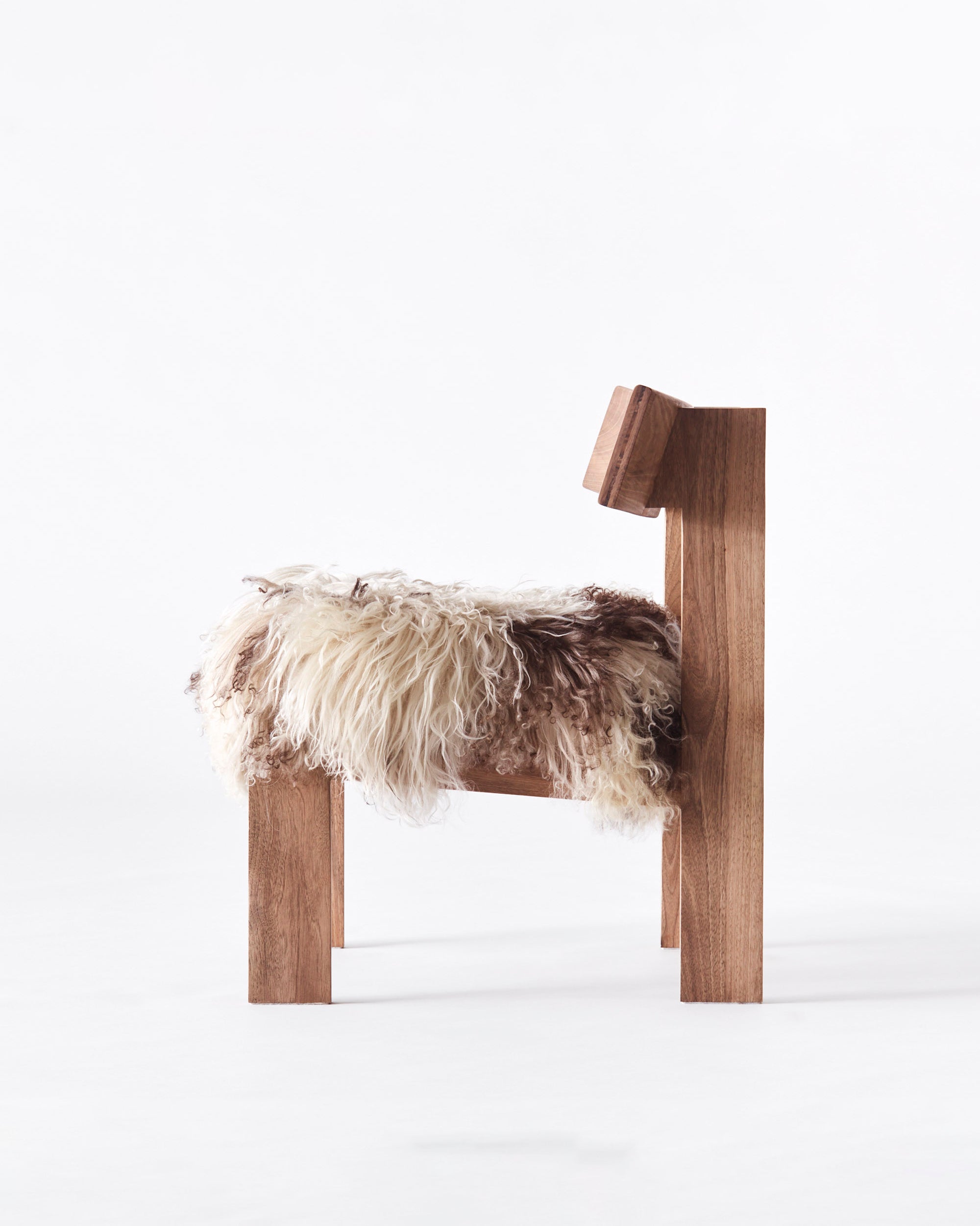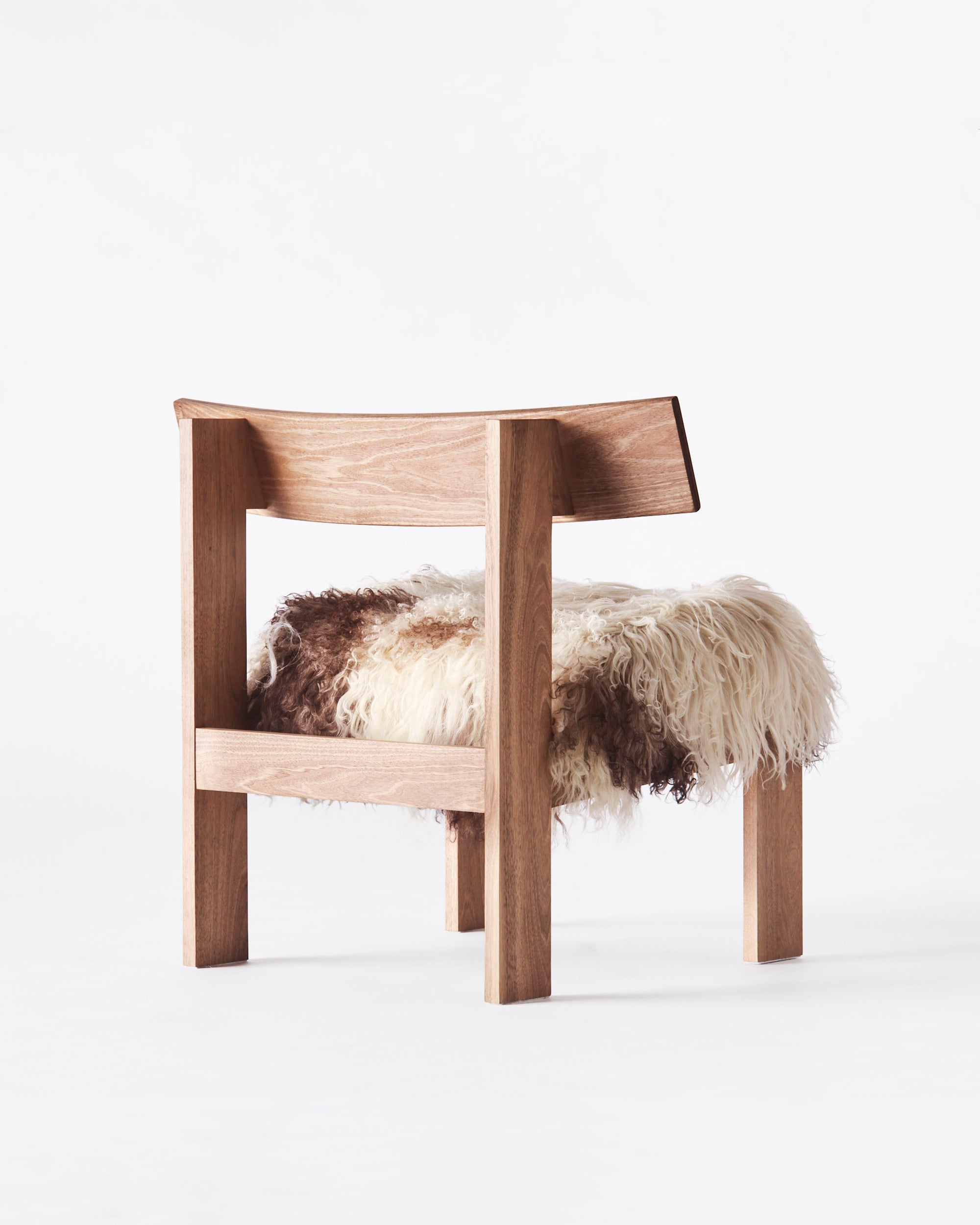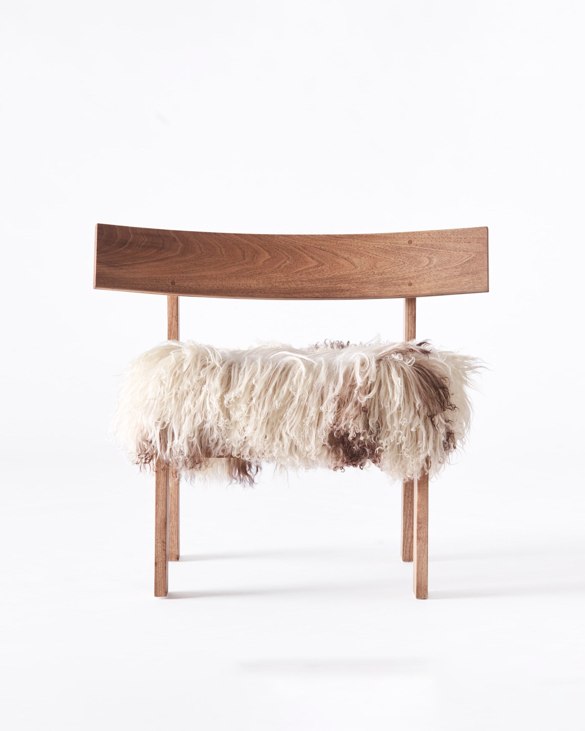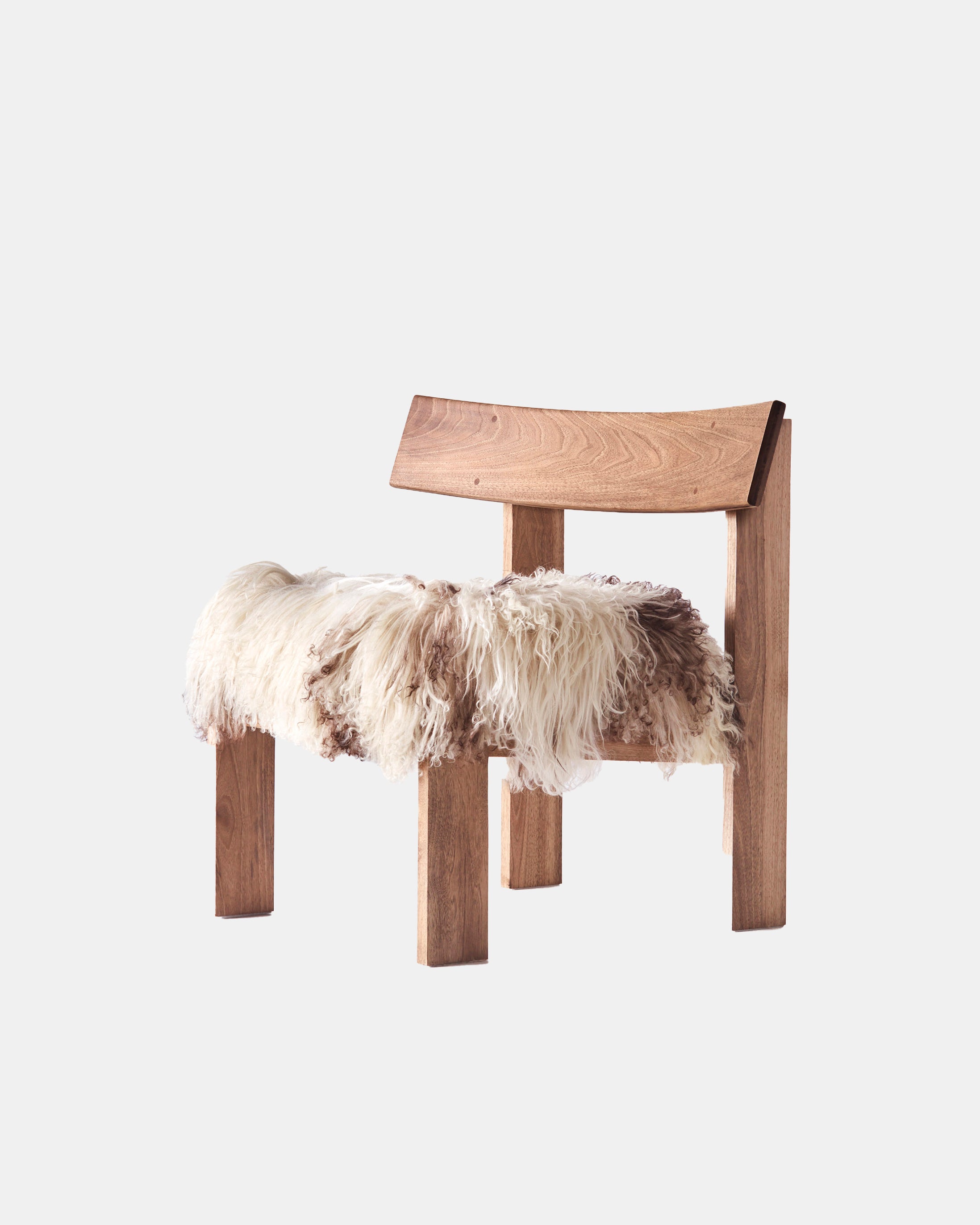 Denne stolen har en spesiell plass i hjertet til Dusty Deco. De begynte å jobbe med designeren Niklas Runesson for mange år siden. Niklas laget skreddersydde stykker fra verkstedet hans i Stockholm, og akkurat denne stolen hadde de i flere forskjellige versjoner. Nå er de stolte over å legge til dette designet til Dusty Deco-serien. Laget for hånd i solid valnøtt og trukket sete i saueskinn.