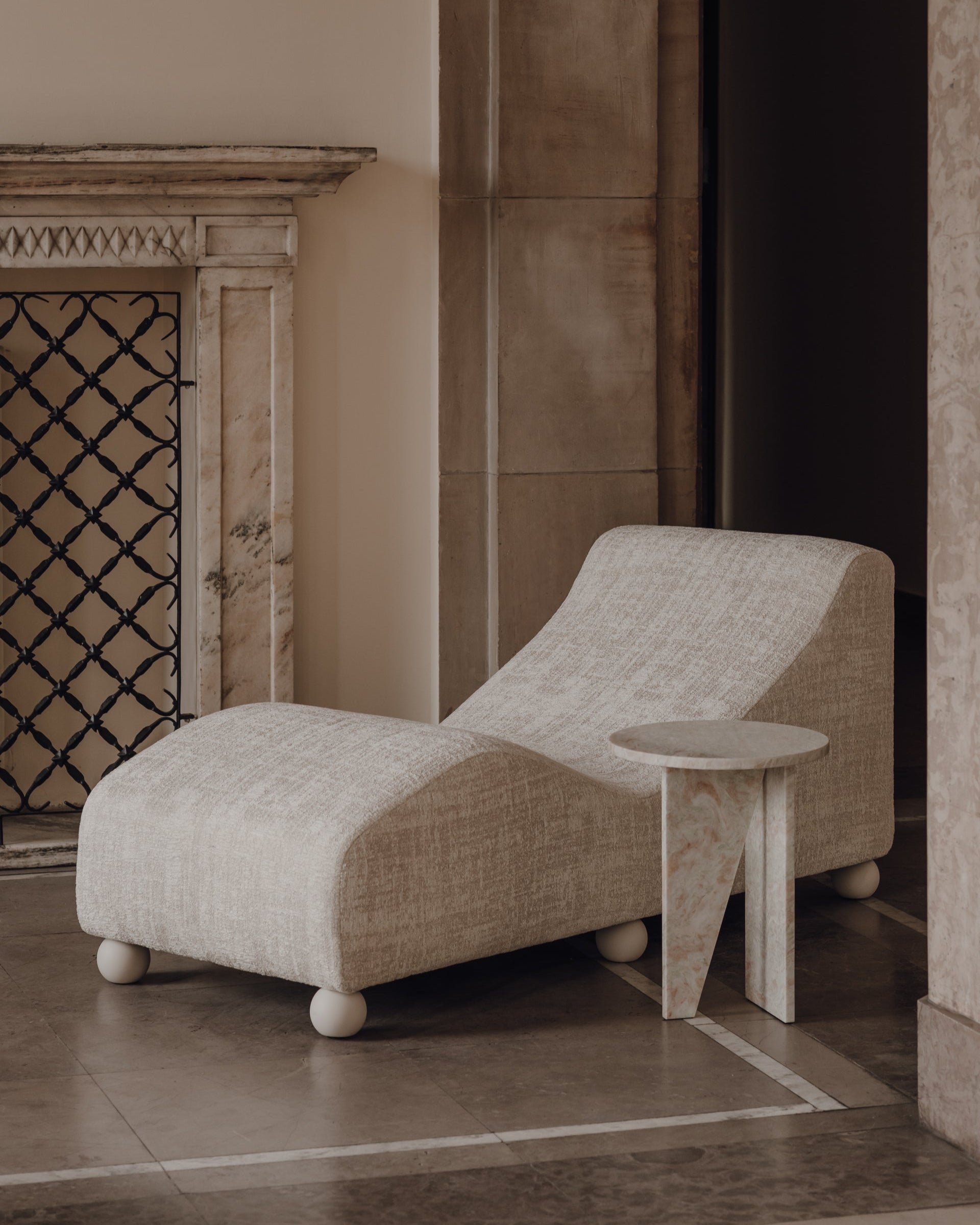 En komfortabel sjeselong med originalt trekk, satt på seks sfæriske ben. Kontakt oss for å velge det perfekte møbeltrekket som passer i ditt hjem!