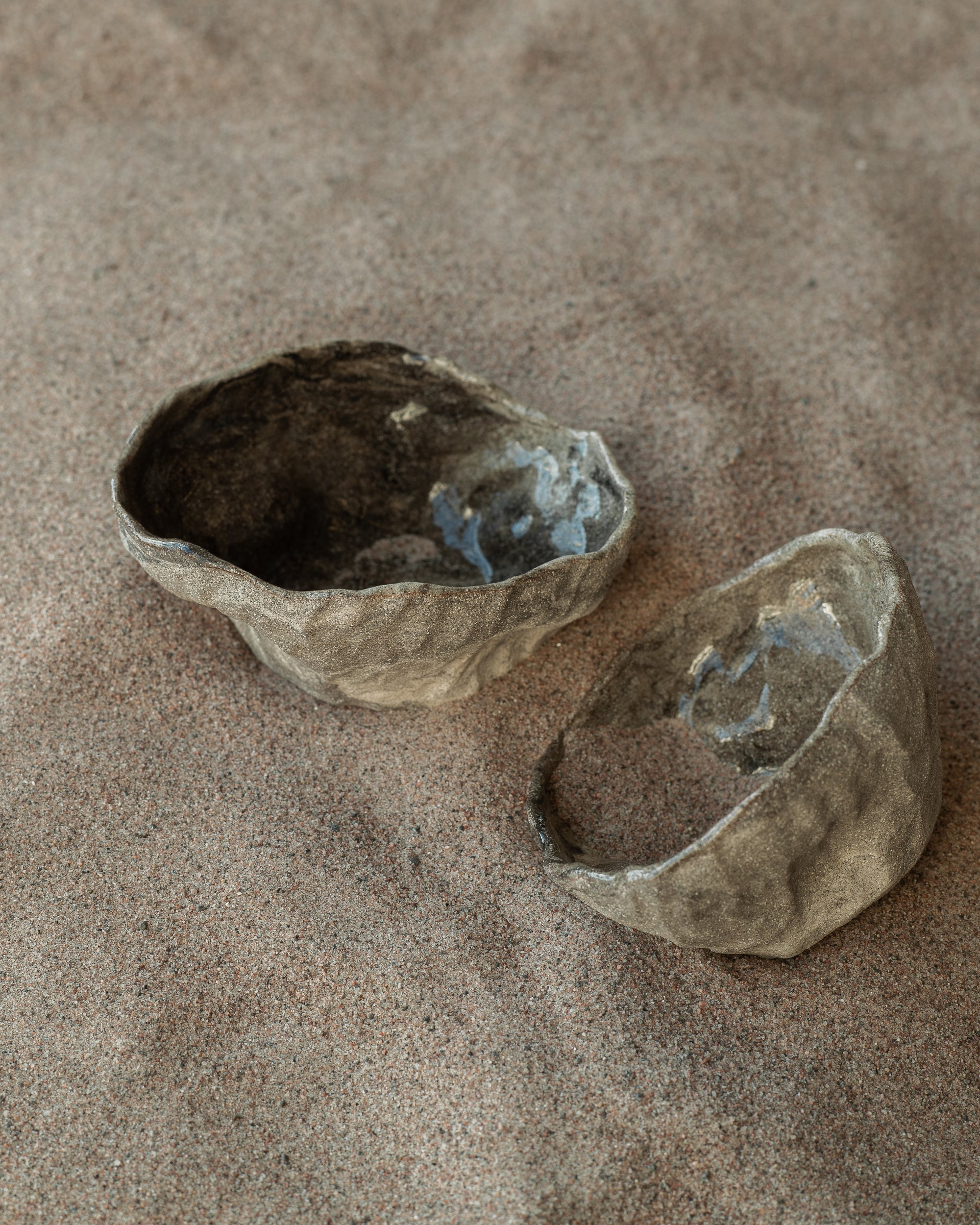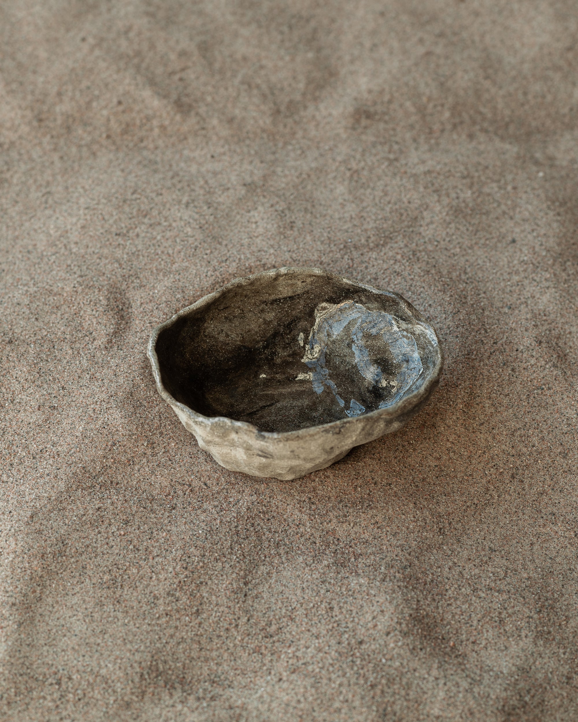 Skålen er håndlaget av tre typer leire som er formet til sitt unike, organiske design. Den uglasserte utsiden fremhever materialets rå og naturlige tekstur, mens hver skål har en unik overflate, skapt av leirens individuelle bevegelse og plassering under prosessen. Ingen skåler er helt like, noe som gjør hver enkelt til et lite kunstverk!