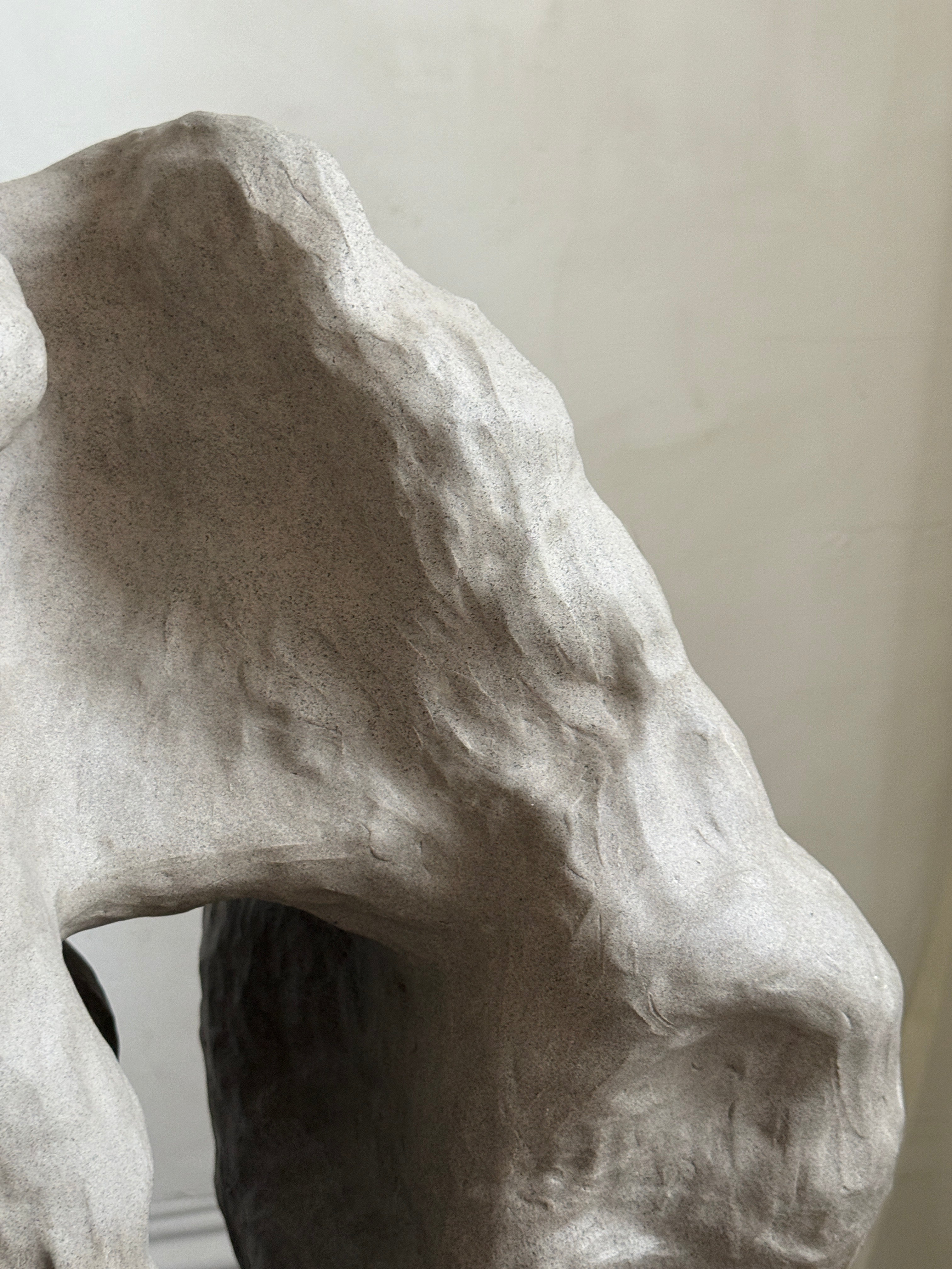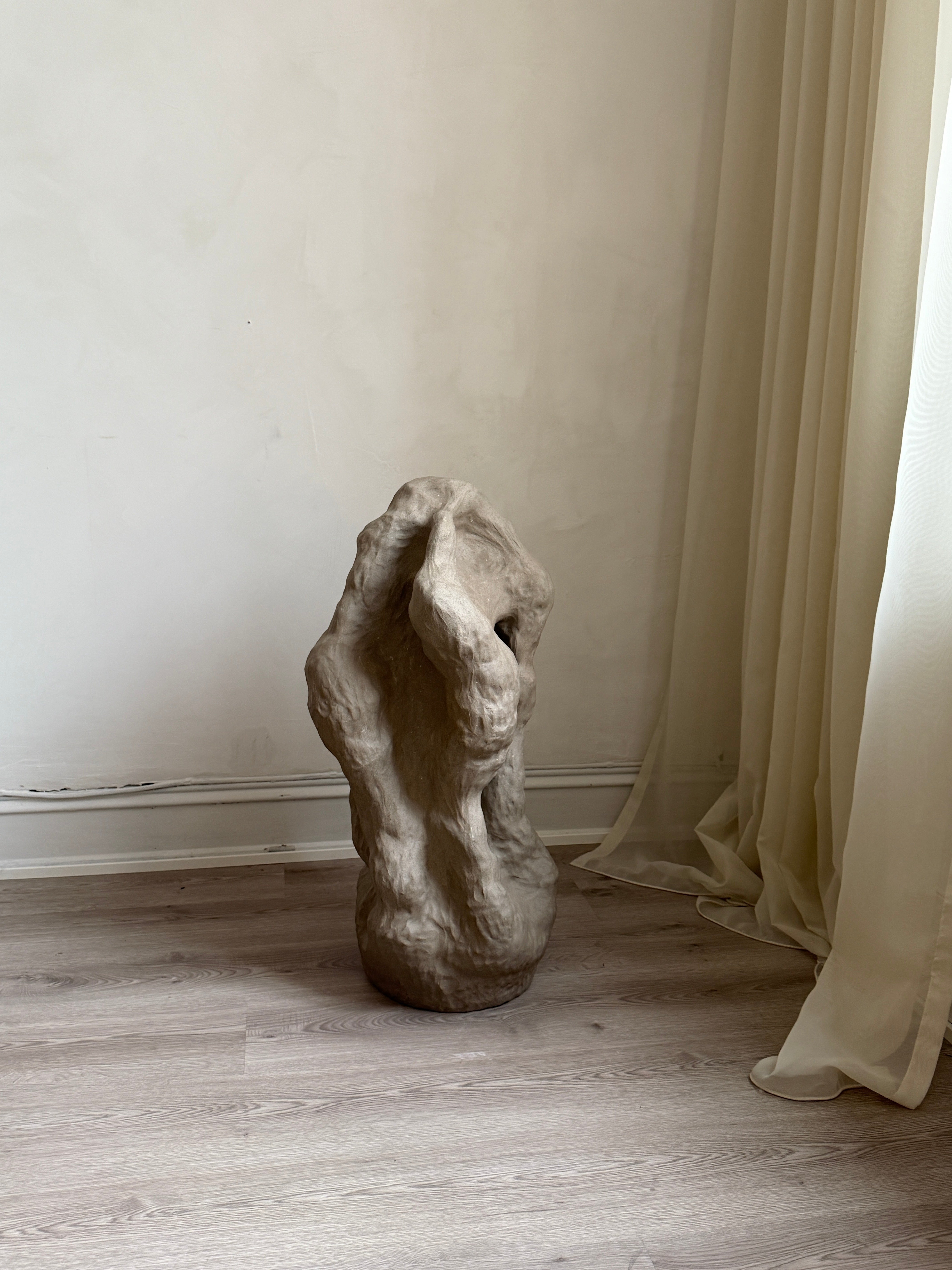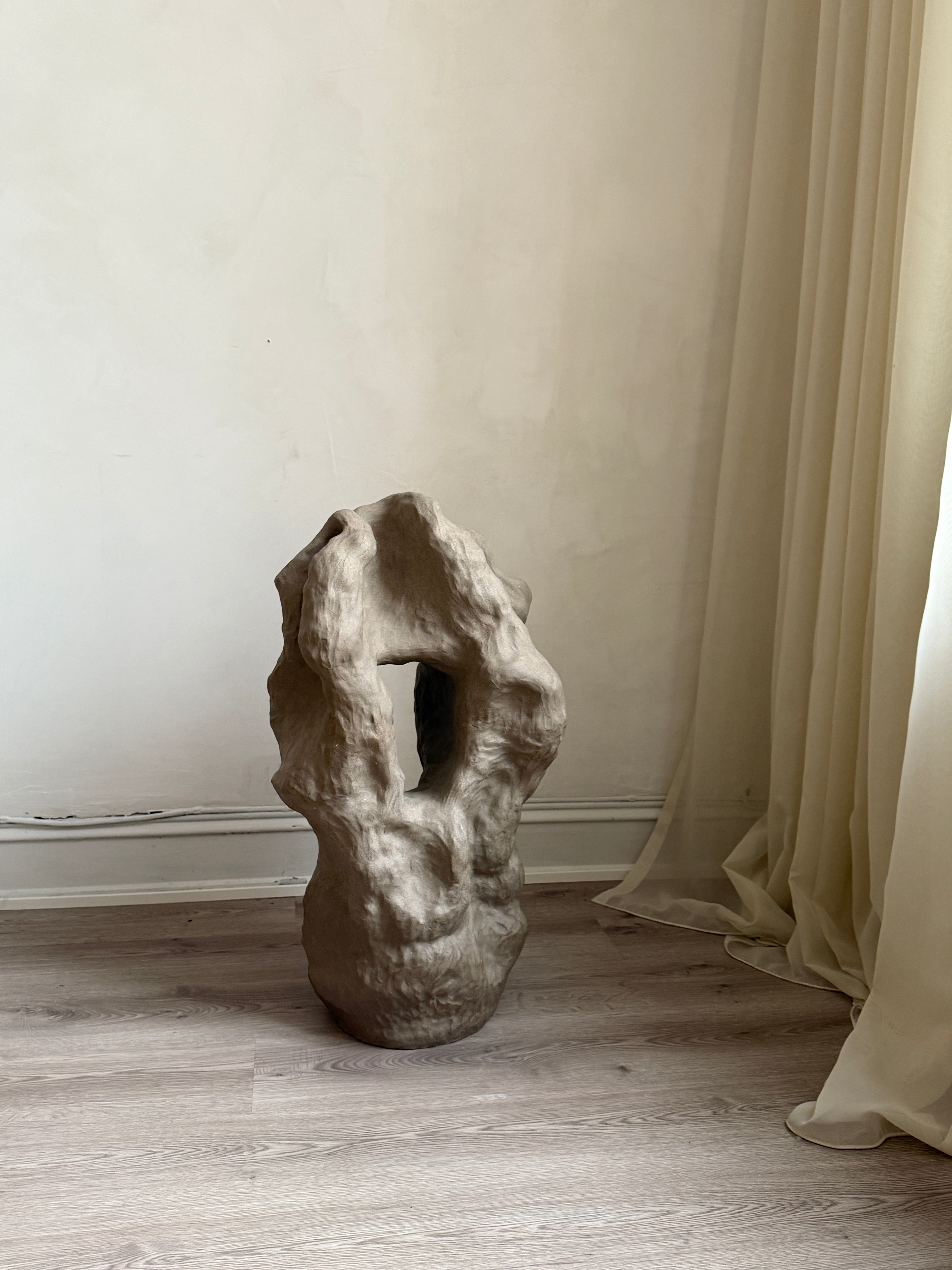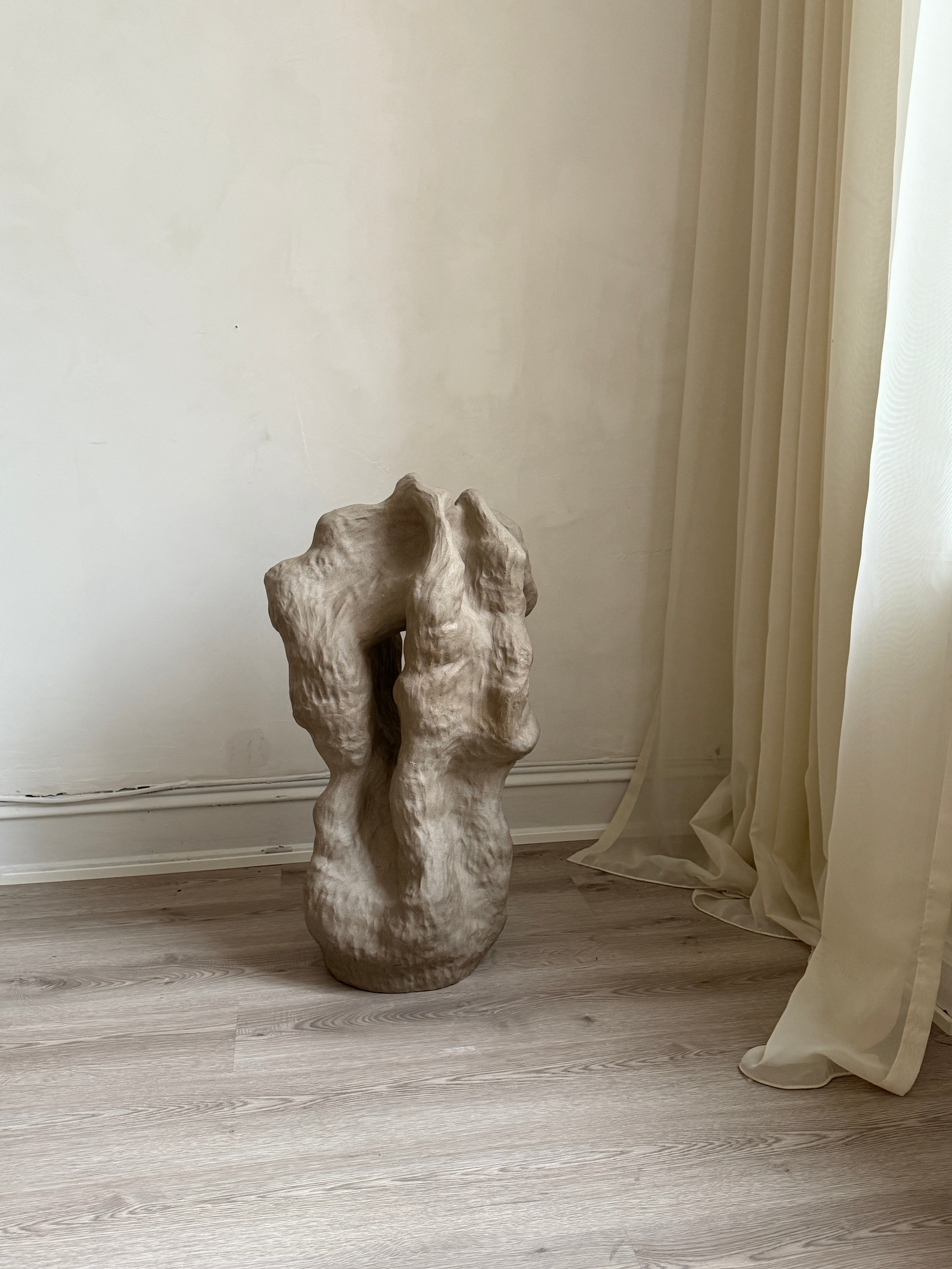 "Et Frirom – En Bevegelse" er en stor skulptur i gråsteingodsleire, skapt som et fysisk uttrykk for en indre prosess av frigjøring og lek. Når følelsen av å være fastlåst ble overveldende, ble skulpturen et rom for bevegelse, der grensene viskes ut og formen får leke seg fritt. Denne skulpturen ble bygget intuitivt, i en kontinuerlig prosess der hver del av verket ble utviklet ut fra det som allerede var skapt. Skarpe kanter og mykere, buede linjer møtes og brytes, som om de søker å finne sitt eget uttrykk, stadig utvidende og utviklende seg. Den dynamiske bevegelsen i formen inviterer til utforskning, og de taktile overflatene åpner opp for berøring, som et fysisk uttrykk for frigjøring. Den grå fargen, med sine jordnære og subtile nyanser, understreker prosessen av transformasjon og gir verket en tidløs karakter. Gjennom denne spontane, lekne tilnærmingen, tar skulpturen form som et frirom – et sted hvor tanker, følelser og materialer kan utforske mulighetene for vekst og frigjøring, et rom som kontinuerlig er i bevegelse.