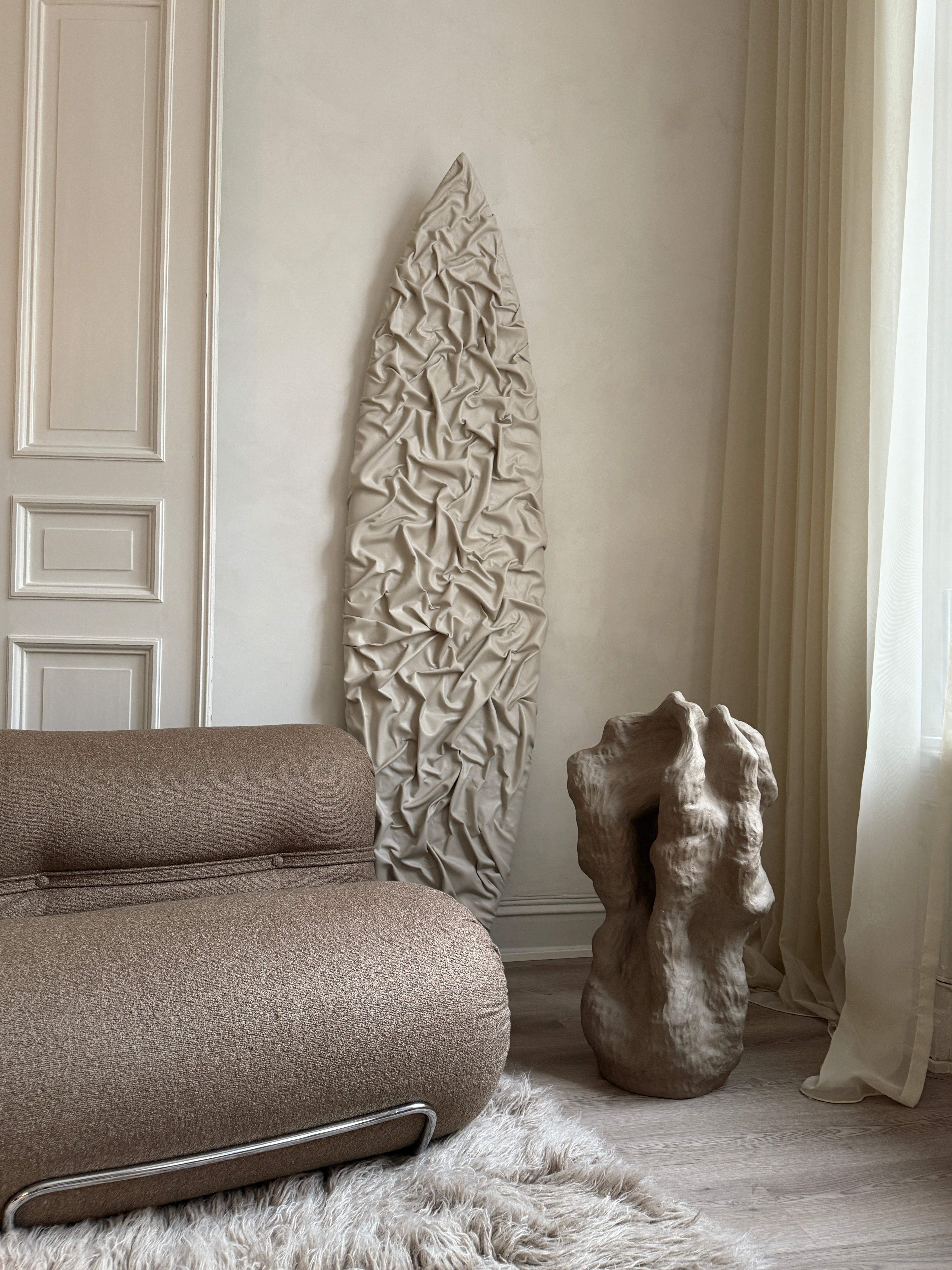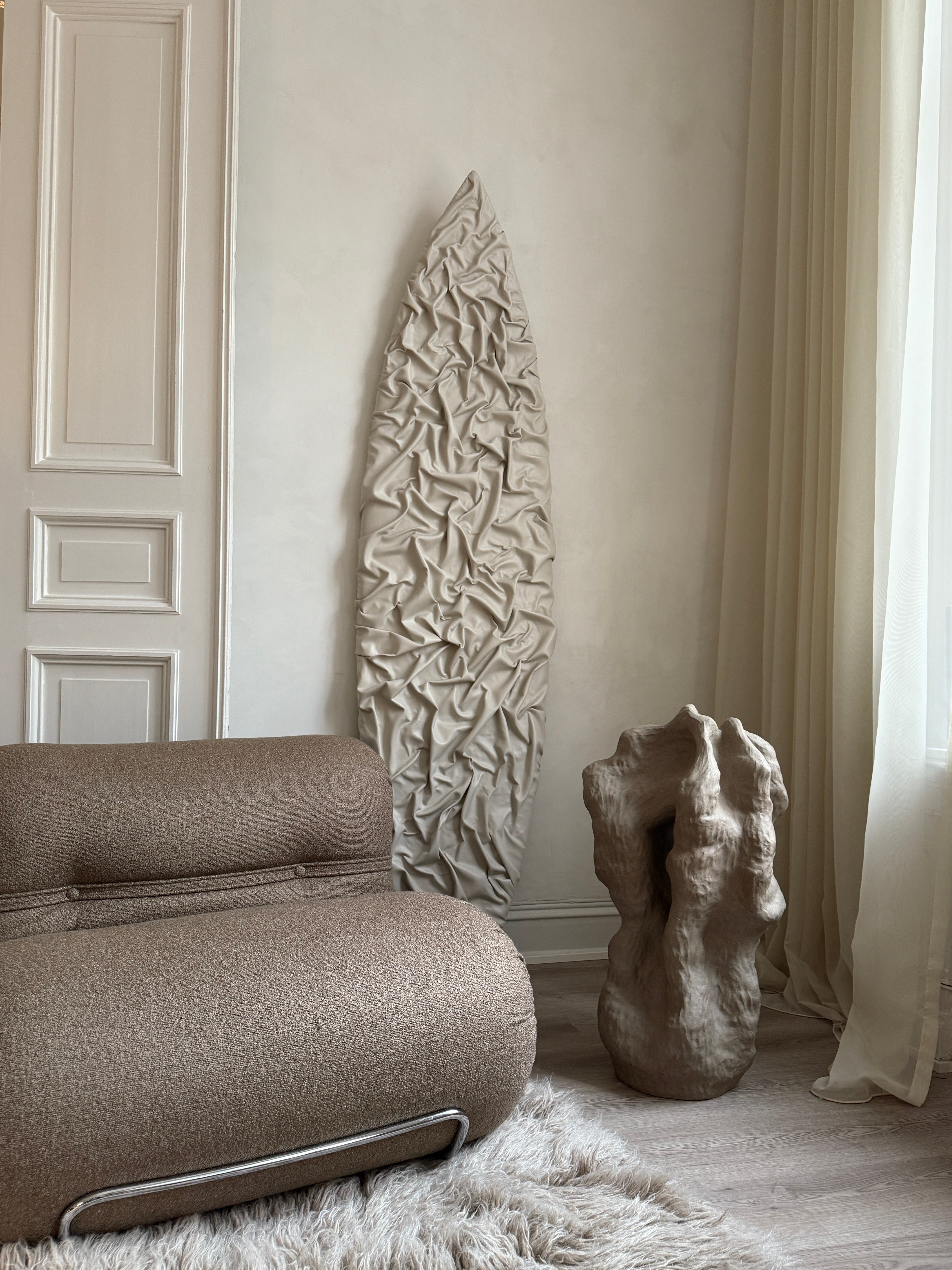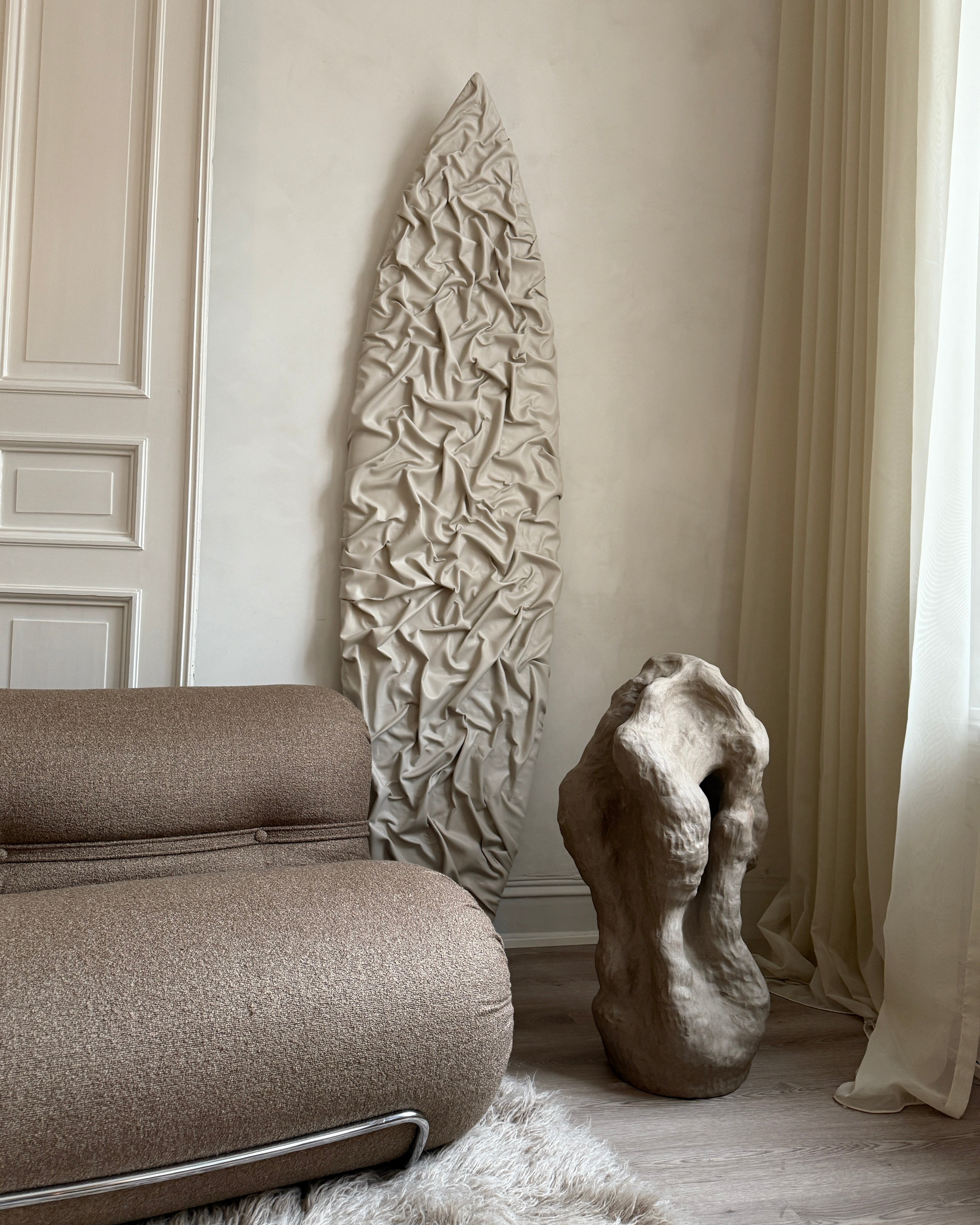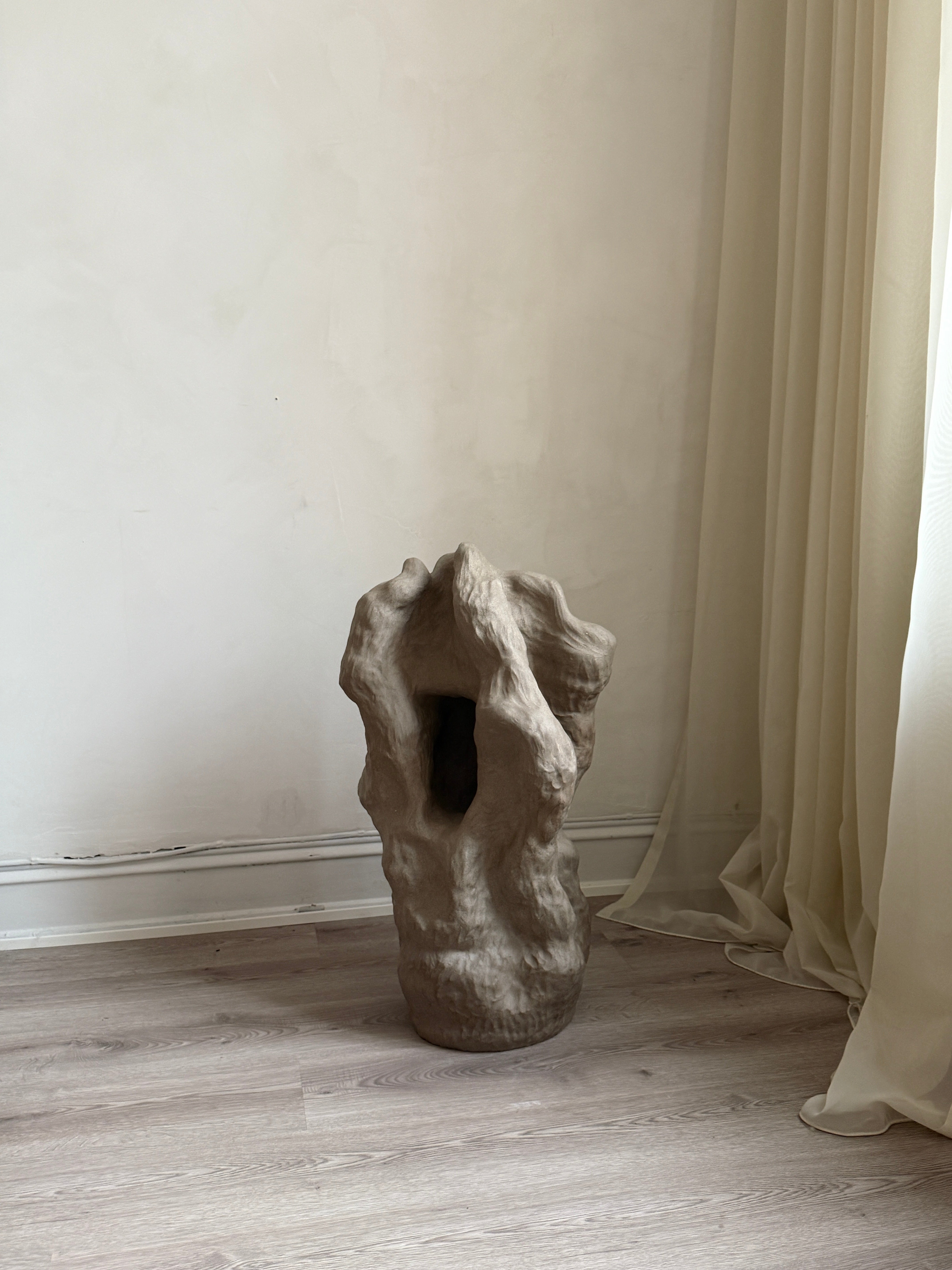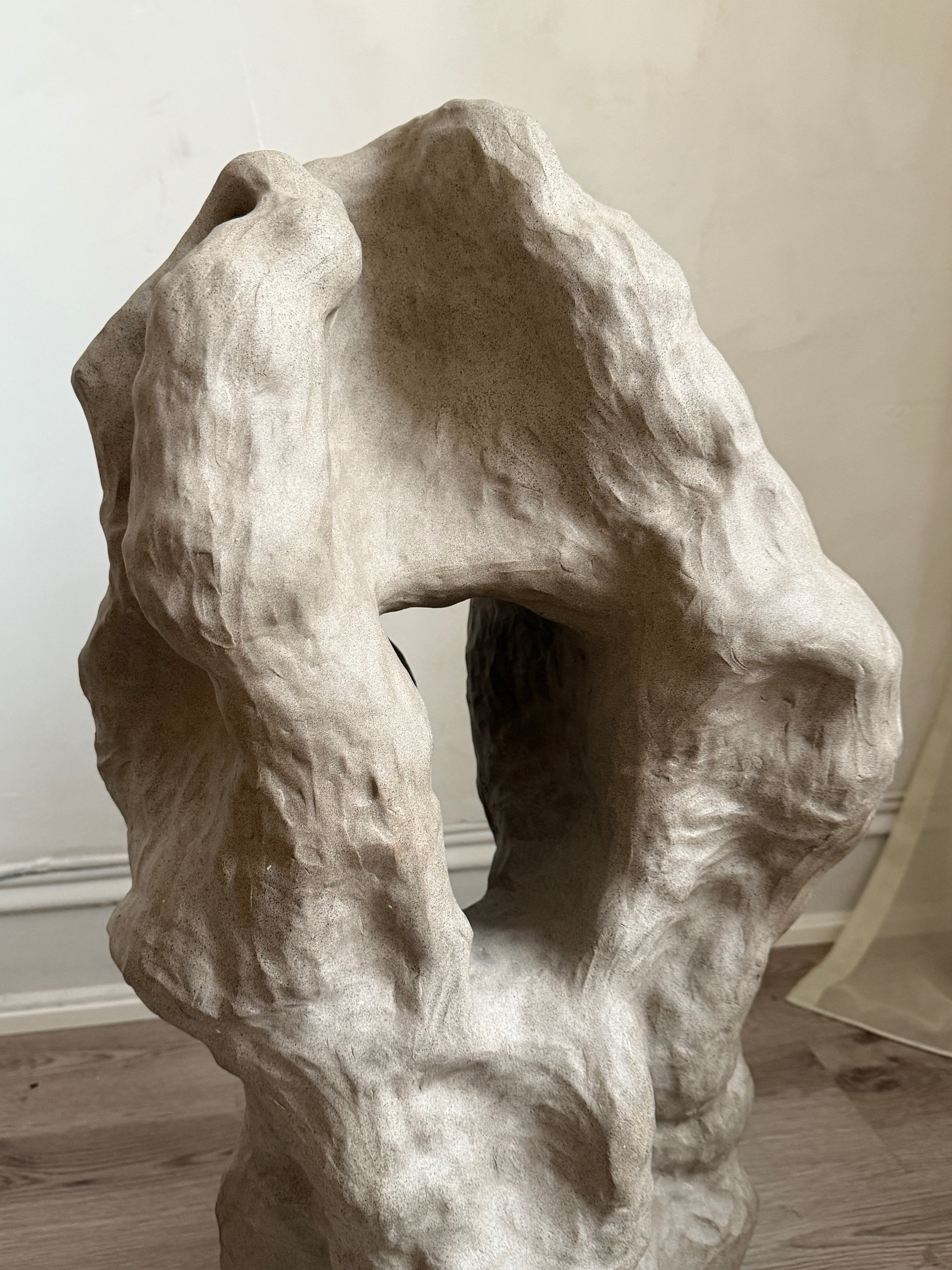 "Et Frirom – En Bevegelse" er en stor skulptur i gråsteingodsleire, skapt som et fysisk uttrykk for en indre prosess av frigjøring og lek. Når følelsen av å være fastlåst ble overveldende, ble skulpturen et rom for bevegelse, der grensene viskes ut og formen får leke seg fritt. Denne skulpturen ble bygget intuitivt, i en kontinuerlig prosess der hver del av verket ble utviklet ut fra det som allerede var skapt. Skarpe kanter og mykere, buede linjer møtes og brytes, som om de søker å finne sitt eget uttrykk, stadig utvidende og utviklende seg. Den dynamiske bevegelsen i formen inviterer til utforskning, og de taktile overflatene åpner opp for berøring, som et fysisk uttrykk for frigjøring. Den grå fargen, med sine jordnære og subtile nyanser, understreker prosessen av transformasjon og gir verket en tidløs karakter. Gjennom denne spontane, lekne tilnærmingen, tar skulpturen form som et frirom – et sted hvor tanker, følelser og materialer kan utforske mulighetene for vekst og frigjøring, et rom som kontinuerlig er i bevegelse.