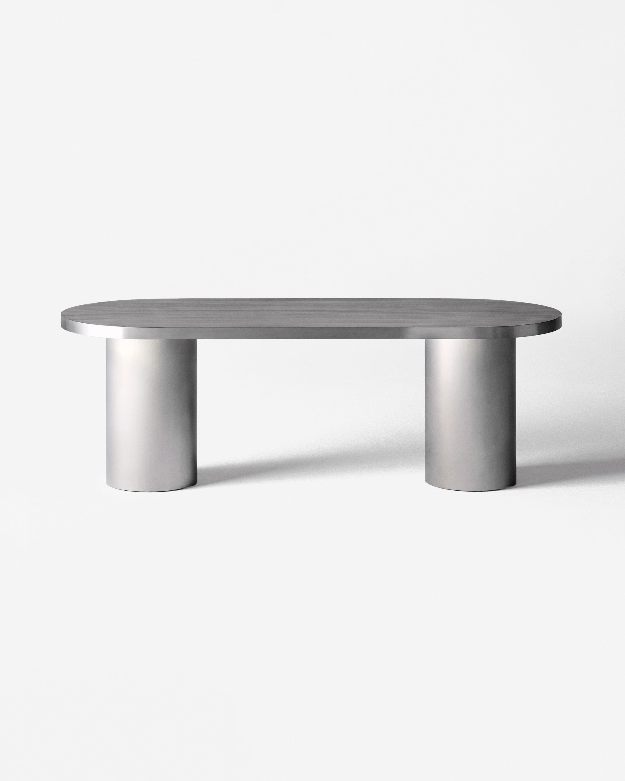 Cufflink spisebord er et ovalt bord laget av polert rustfritt stål. Det ovale bordet kjennetegnes av sitt enkle og stramme formspråk. Med to sylindriske pidestallben fremstår formen ren og arkitektonisk, med fokus på balanse og proporsjoner. Den glatte bordplaten og de mykt avrundede kantene skaper en myk silhuett, mens metallmaterialet gir rommet et moderne og stilrent uttrykk.