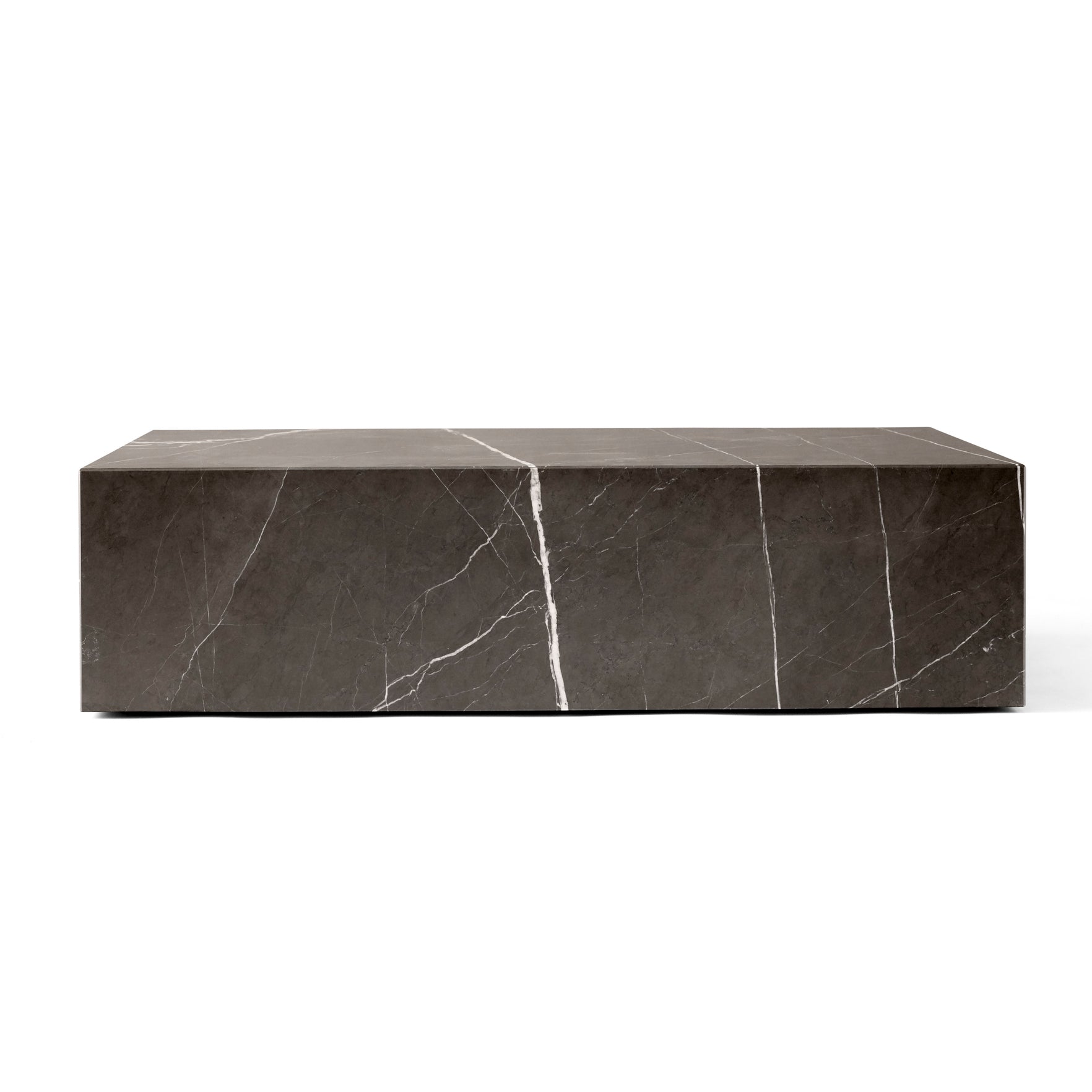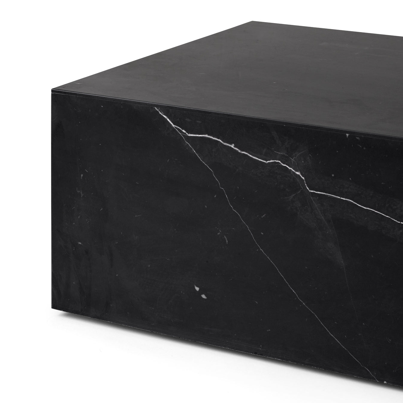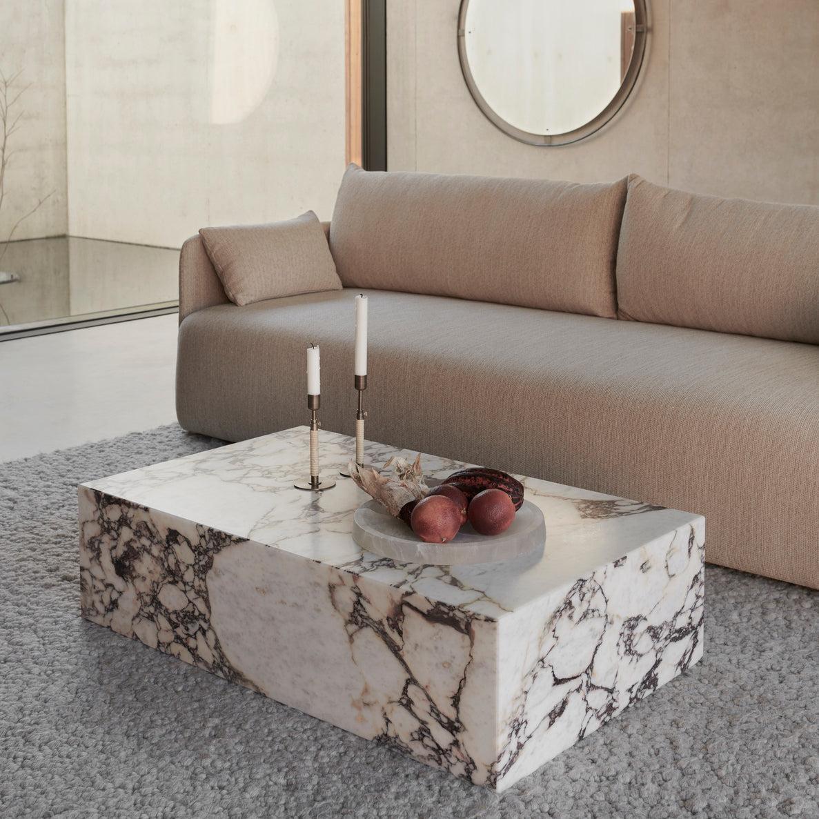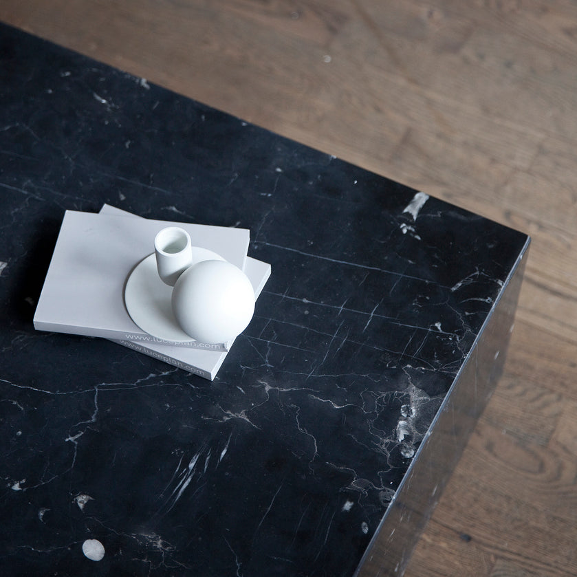 Plinth Low er et skulpturelt bord som i seg selv fungerer som et blikkfang, samtidig som det er en elegant base for alt du ønsker å plassere på det. Den rene, geometriske formen står i vakker kontrast til marmoren, hvor hvert bord har sin egen unike åring og karakter.
