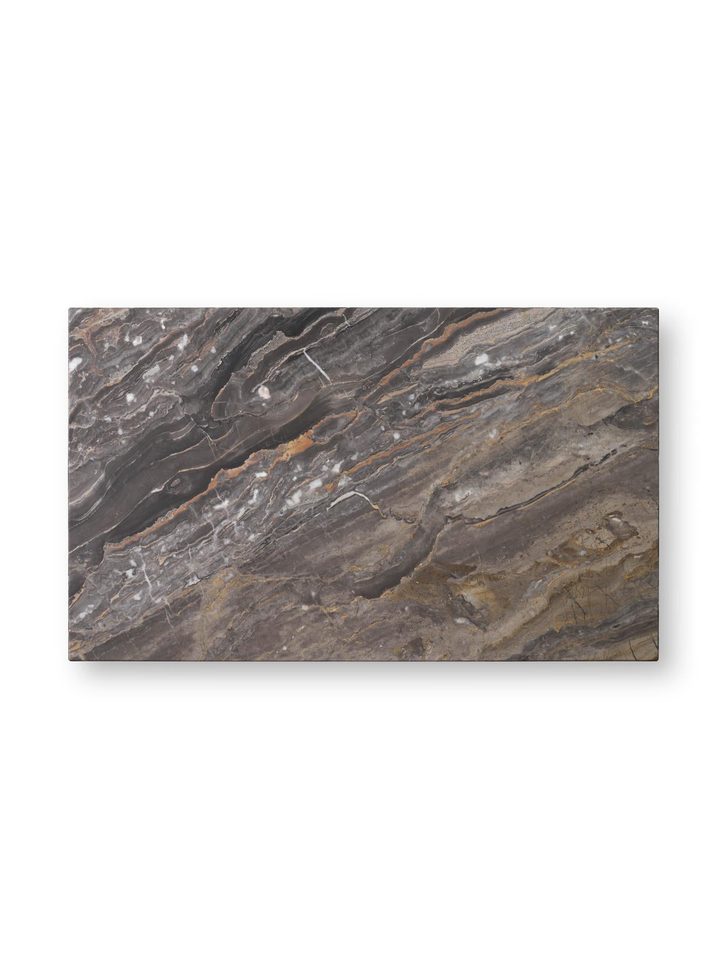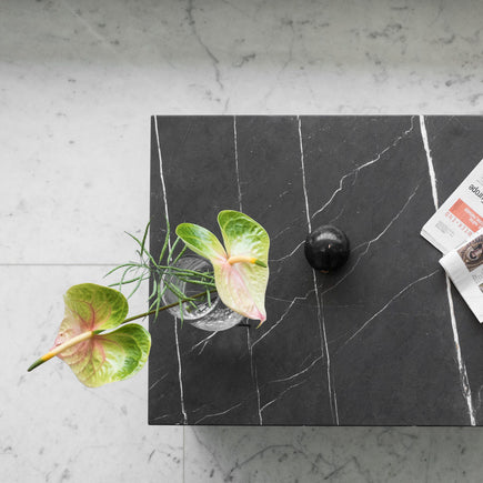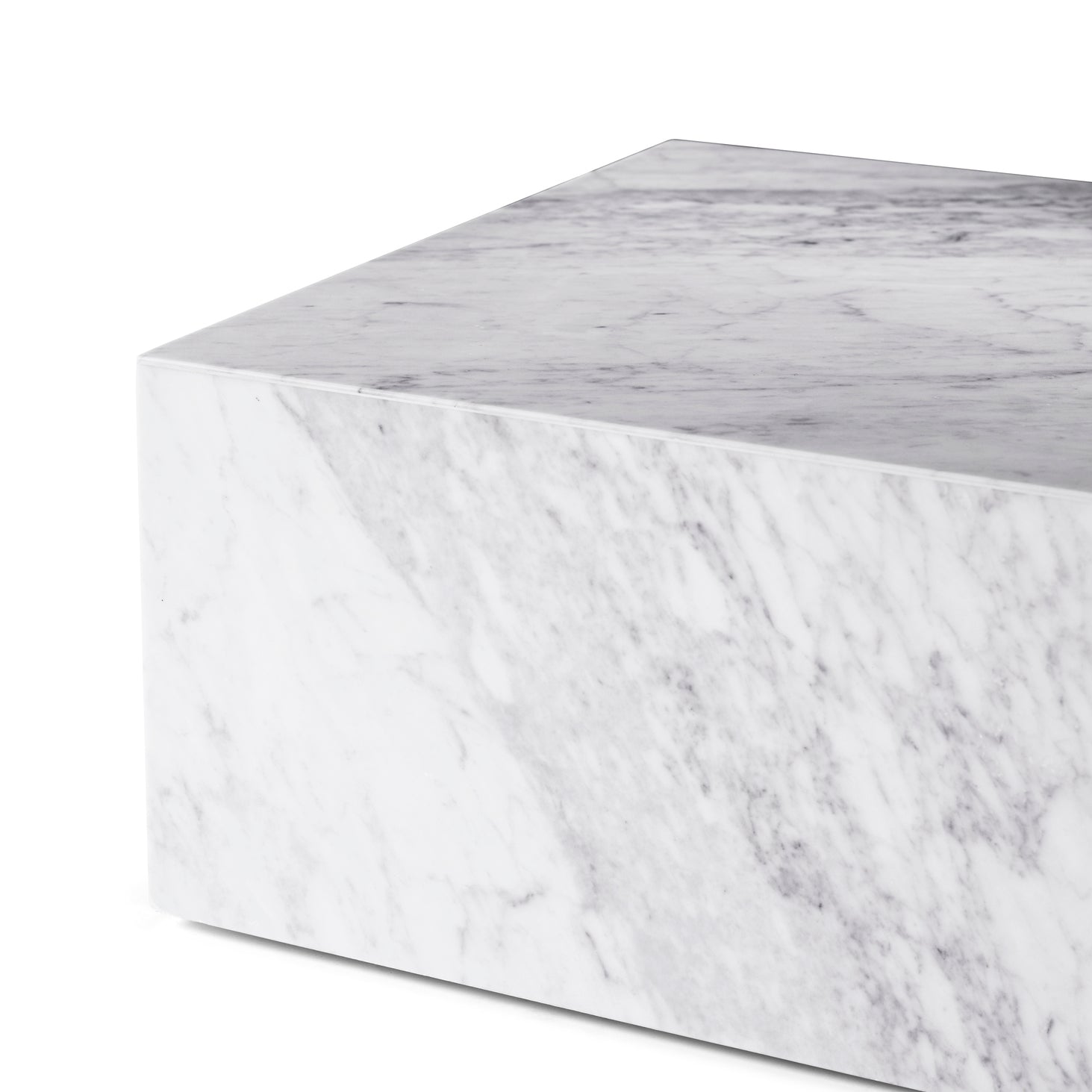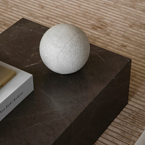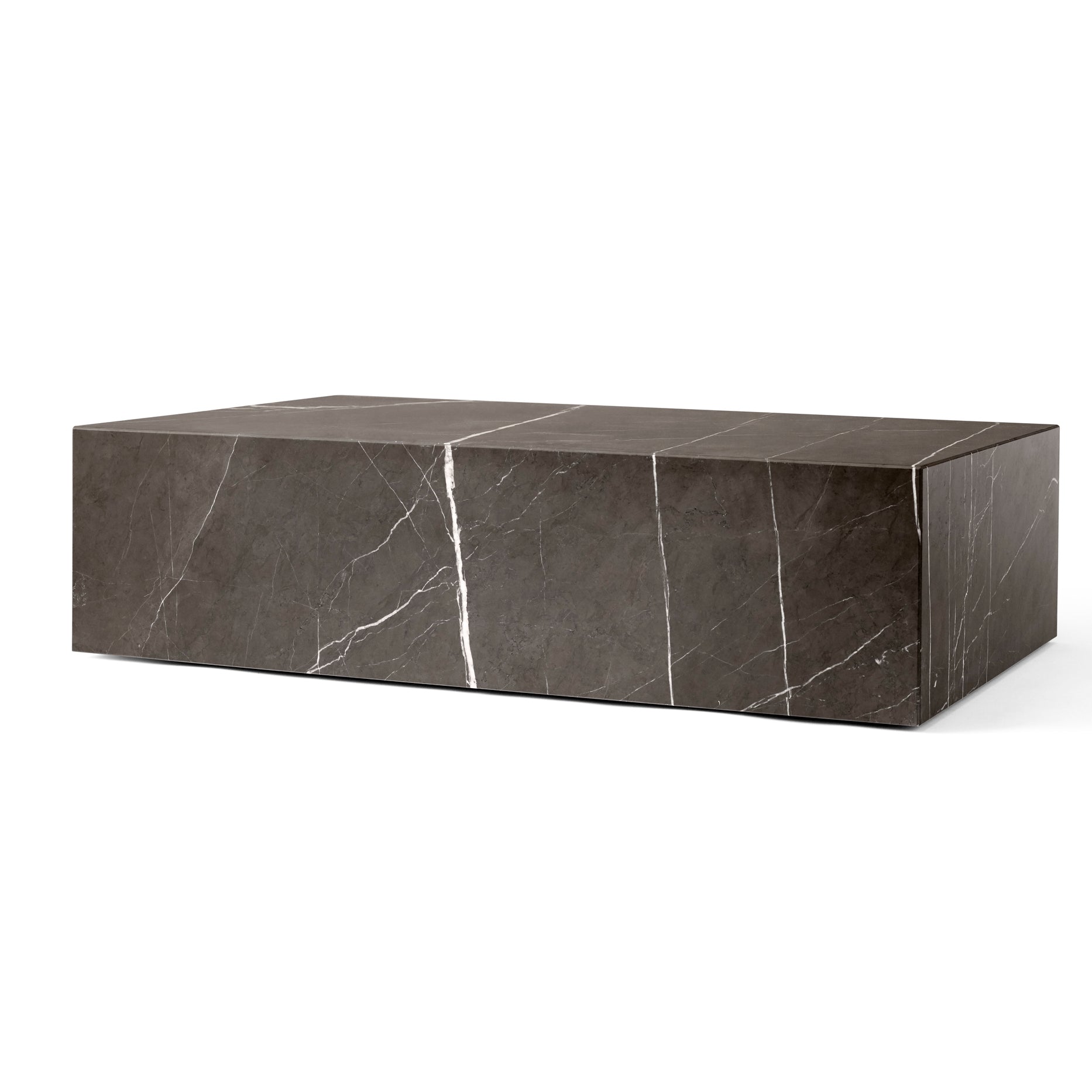 Plinth Low er et skulpturelt bord som i seg selv fungerer som et blikkfang, samtidig som det er en elegant base for alt du ønsker å plassere på det. Den rene, geometriske formen står i vakker kontrast til marmoren, hvor hvert bord har sin egen unike åring og karakter.
