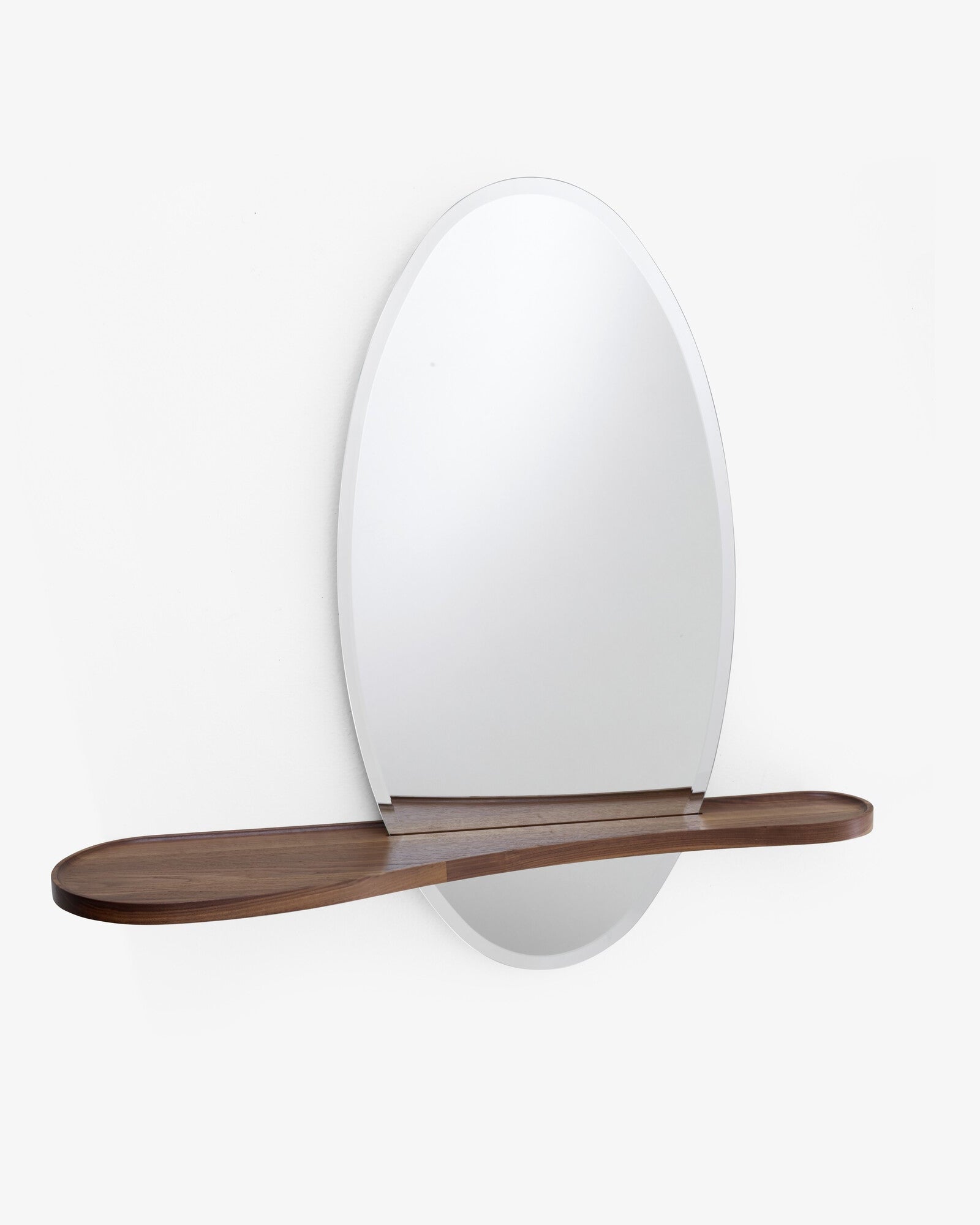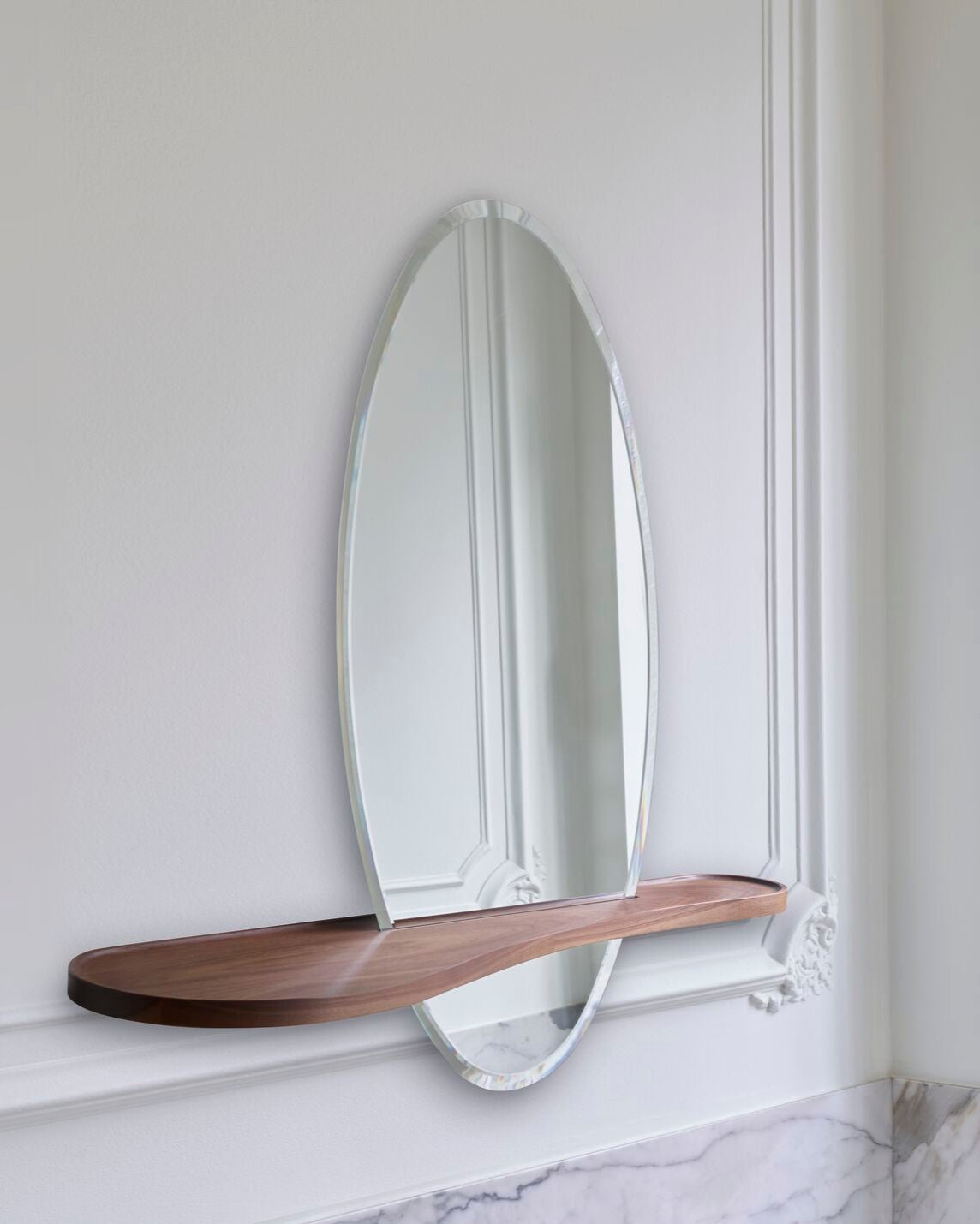 Bienvenue-speilet står som en avatar av den perfekte butleren: renheten i dens ovale form, detaljene i dens skinnende avfasning og de slyngede kurvene på valnøtt-hyllen gjør det til et stykke hvis tilstedeværelse er både behagelig og praktisk i alle omgivelser. Avfaset speilglass (48 x 96 cm) med hylle i solid amerikansk valnøtt.
