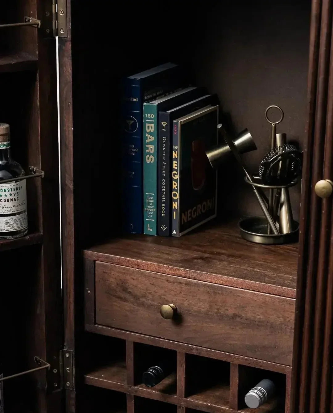 Brooklyn barskap med sokkel er håndlaget av heltre akasie og utstråler tidløs appell. Treverket er behandlet med en luksuriøs konjakklakk, som gir møbelet en varm, rik fargetone som fremhever materialets naturlige skjønnhet.