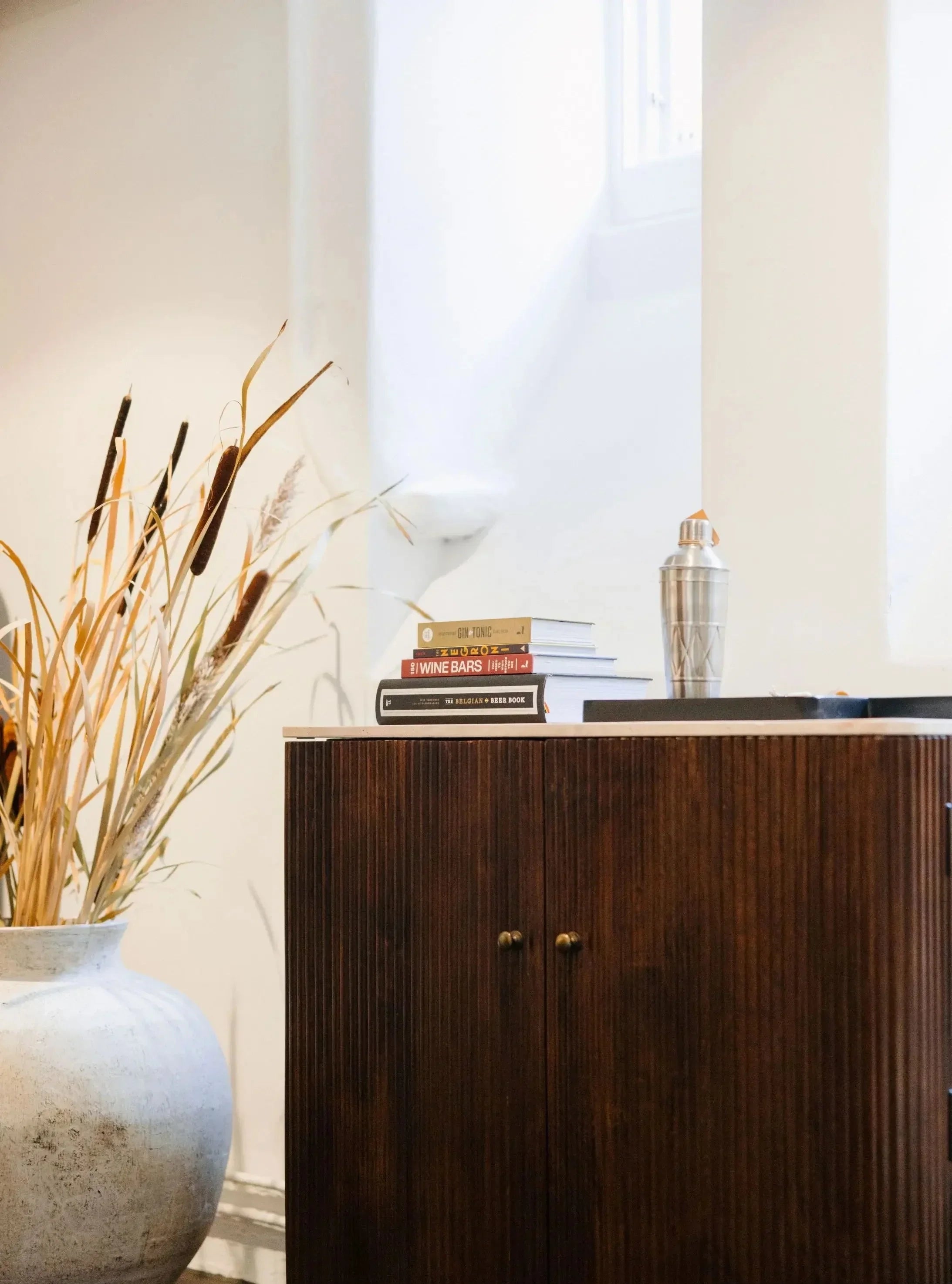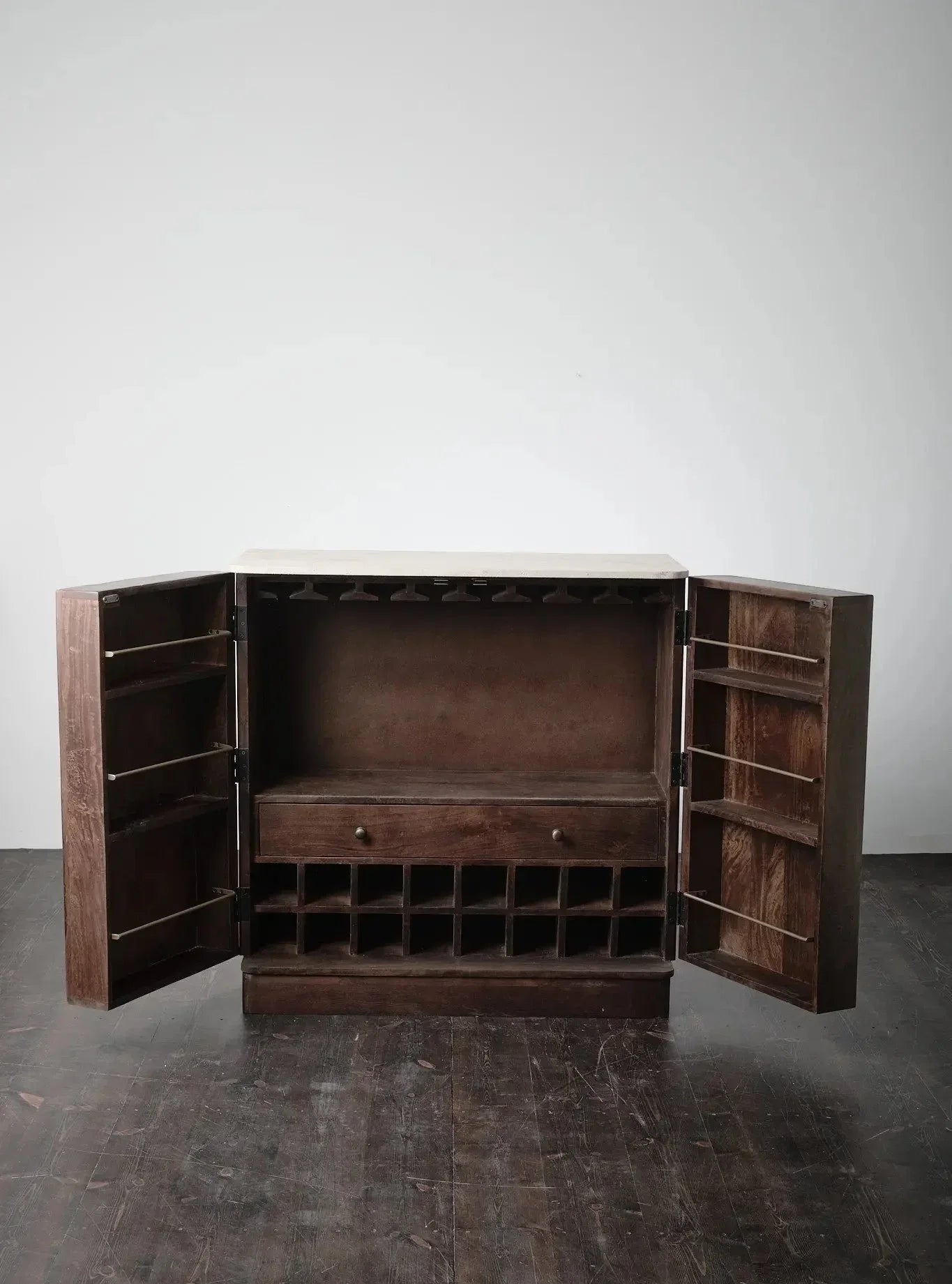 Hvert barskap gjennomgår flere voksbehandlinger under produksjonen, noe som forbedrer holdbarheten og finishen. Du kan legge merke til små sprekker, spikerhull, fargevariasjoner og ufullkommenheter i treverket – dette er bevisste funksjoner som bidrar til den unike karakteren til hvert møbel, noe som gjør hvert skap unikt. Barskapet anbefales for innendørs bruk.
