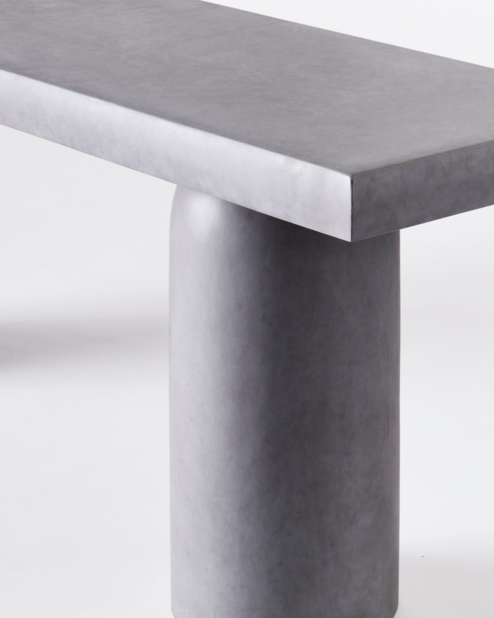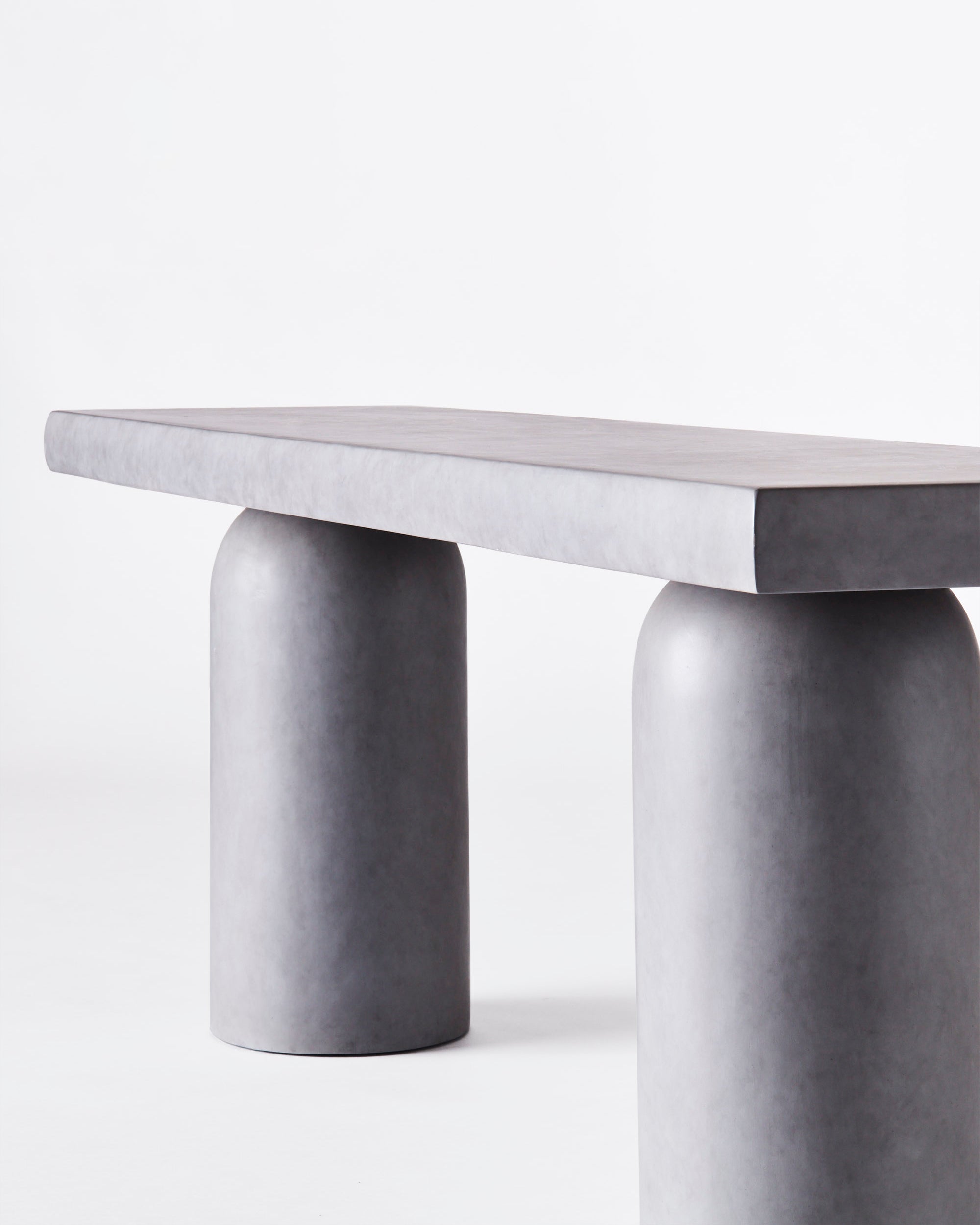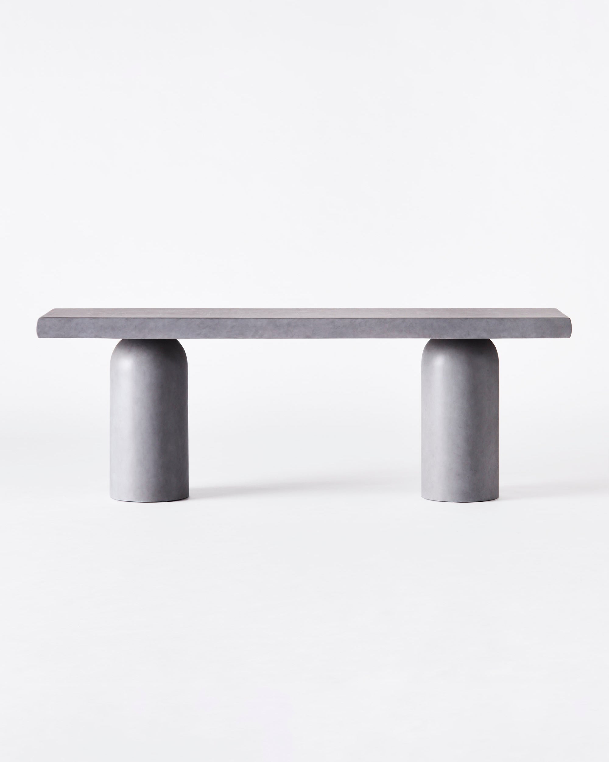 Konsollbordet har et design som kan oppfattes som av betong. Under malingen og det beskyttende laget av polyuretanharpiks er en ramme av mahogni og kryssfiner skjult. Totalt syv trinn må til for å oppnå ønsket betongutseende. Bordet med sine skulpturelle former gjør det til et perfekt tillegg i det moderne hjemmet. Den kan plasseres i mange rom som stuen, soverommet eller gangen.