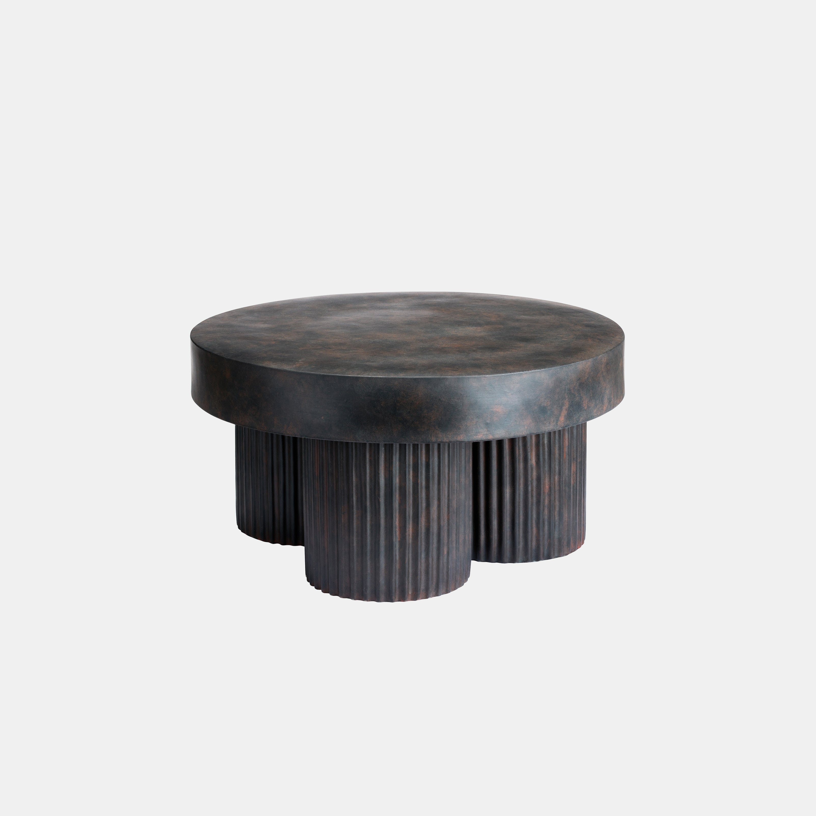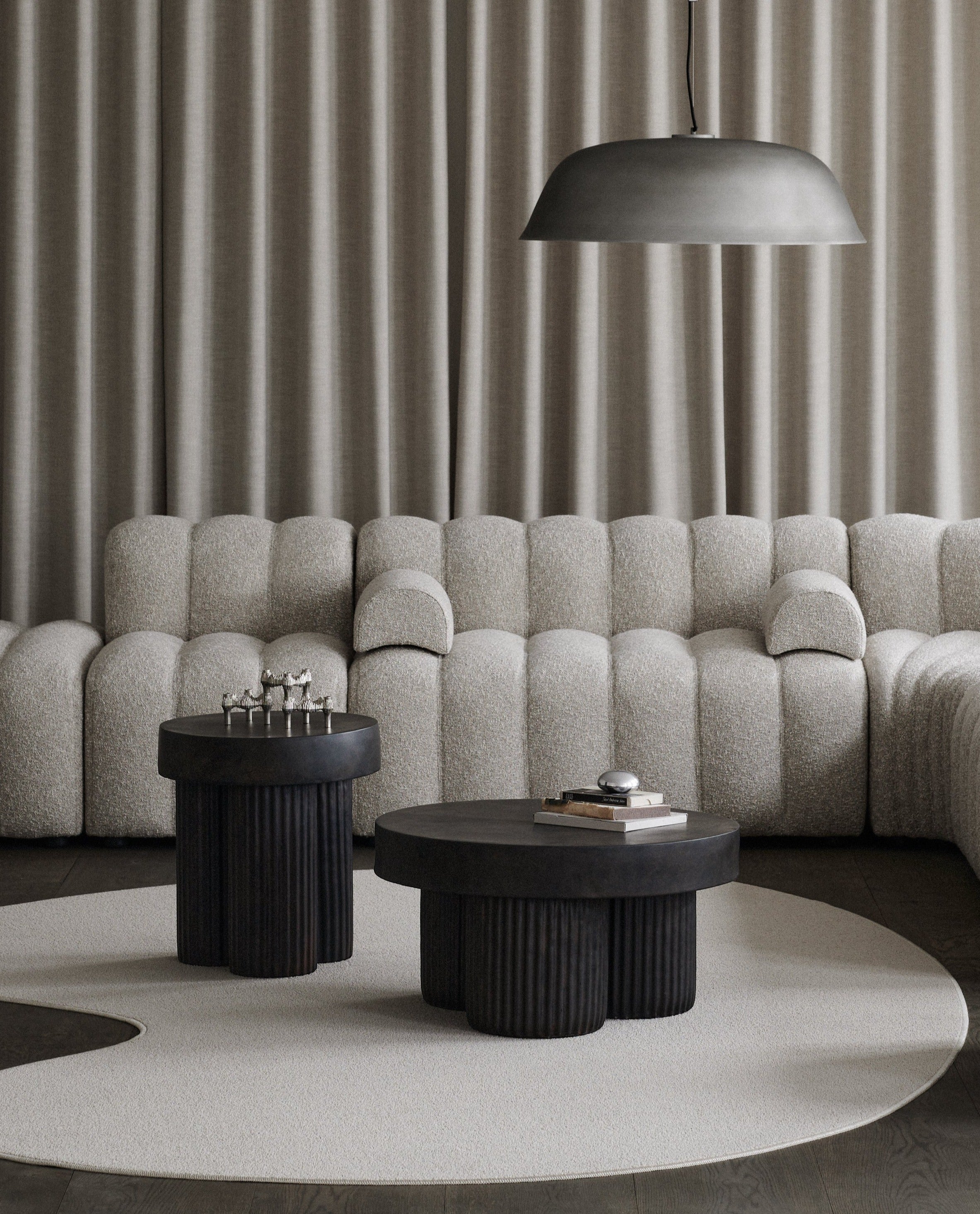 Gear er inspirert av brutalist arkitekturen fra midten av 1900-tallet. De skulpturelle kaffe- og sidebordene er utformet som blokklignende strukturer, som reflekterer arkitektoniske bygningskomponenter av betong. Gear-bordene kommer med en rund bordplate som hviler på toppen av tre sylinderformede ben. Bena er preget av en riflet detalj, som tilfører designet en raffinert og organisk signatur. Gear sofabordet er støpt i lett fiberbetong med en unik og taktil overflatetekstur.