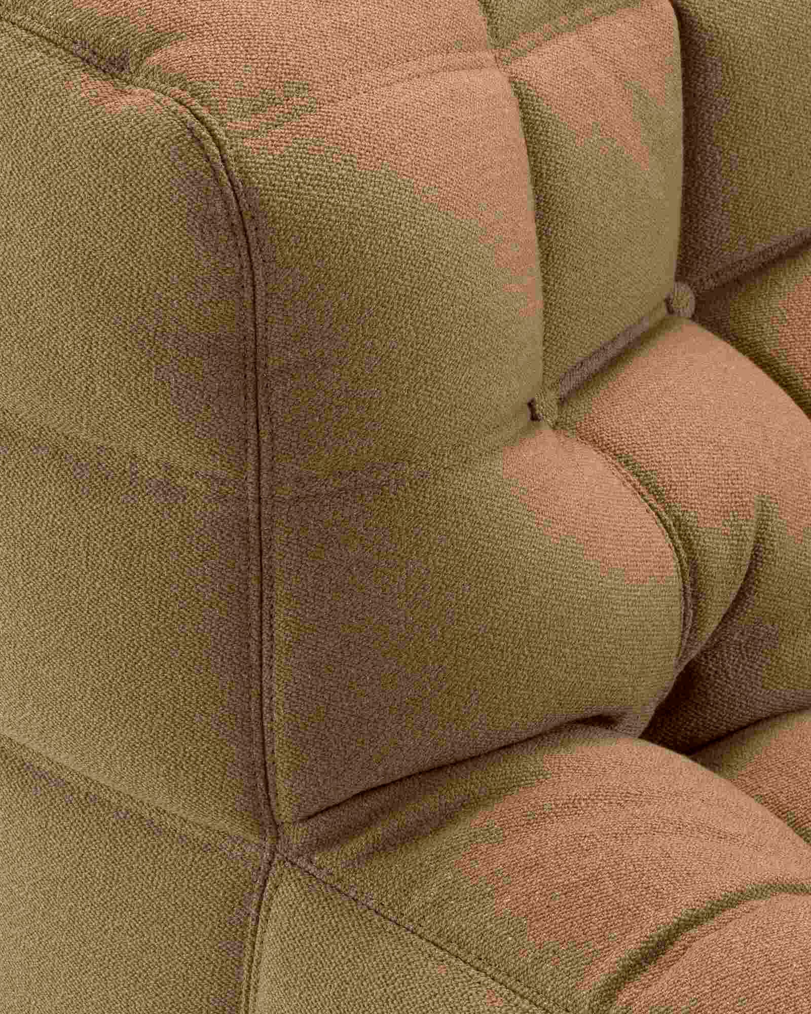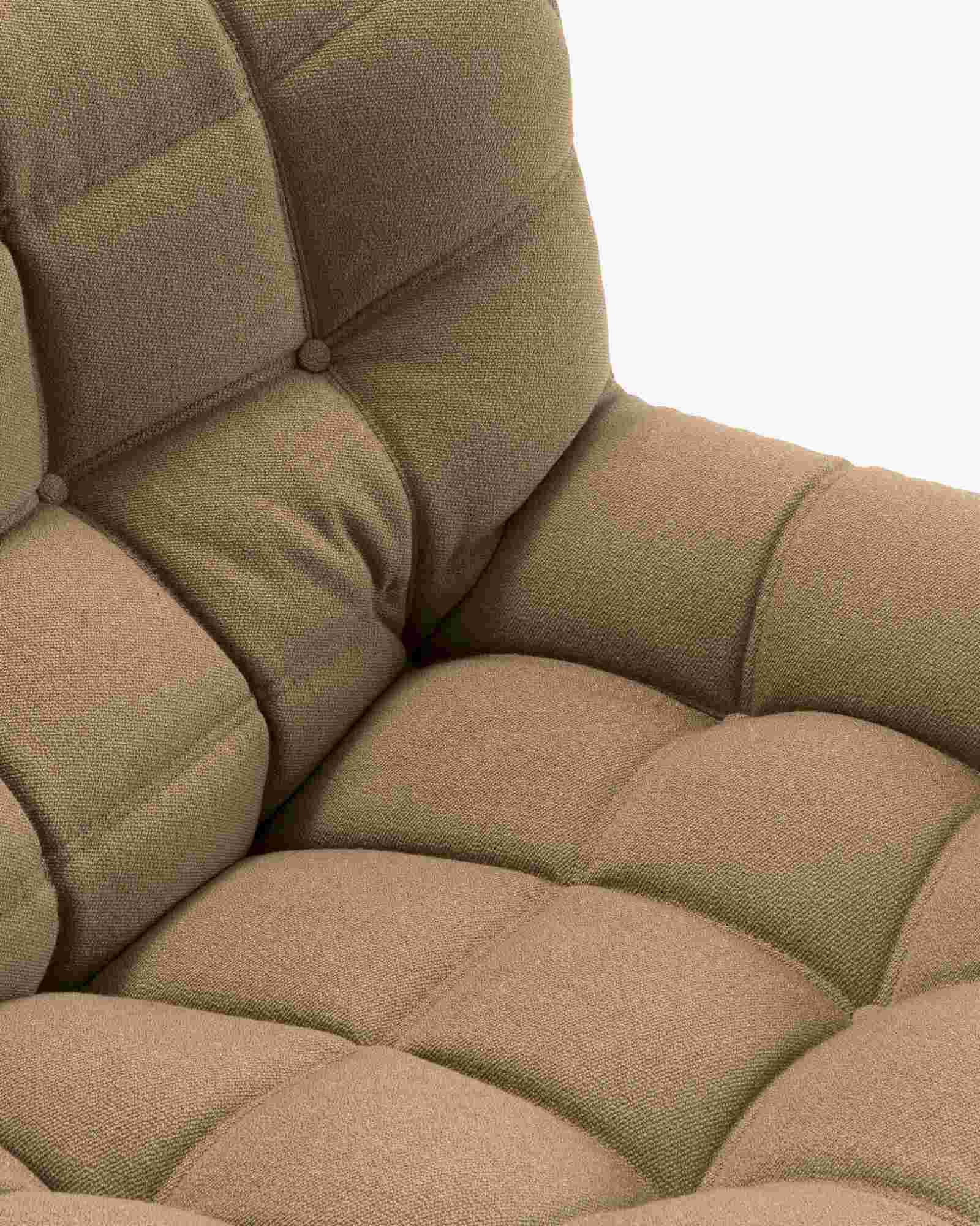 Bak det myke ytre skjuler det seg avansert oppbygging i flere skumlag av høy tetthet – nøkkelen til lang levetid og varig komfort. Stolens trekk er helvattert og ferdigstilt med synlige sømmer og diskret knappetrekking som gir et håndverksmessig preg.