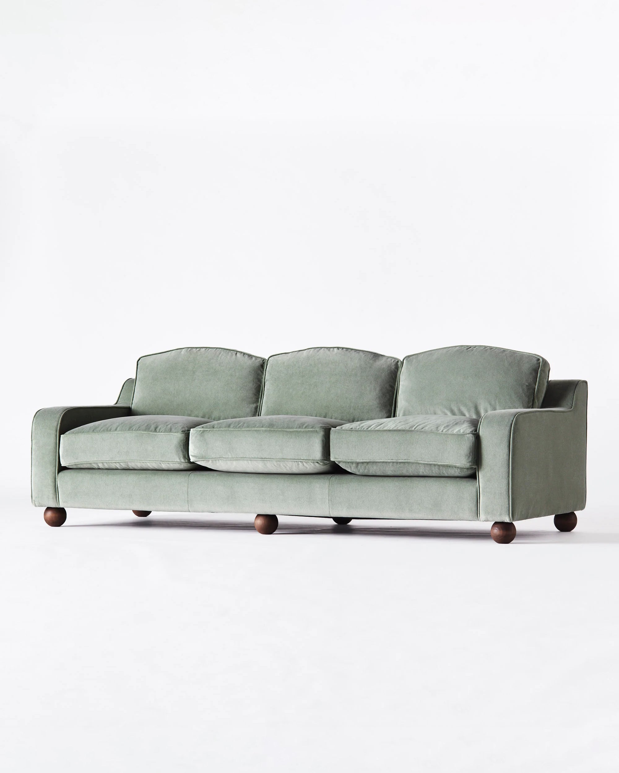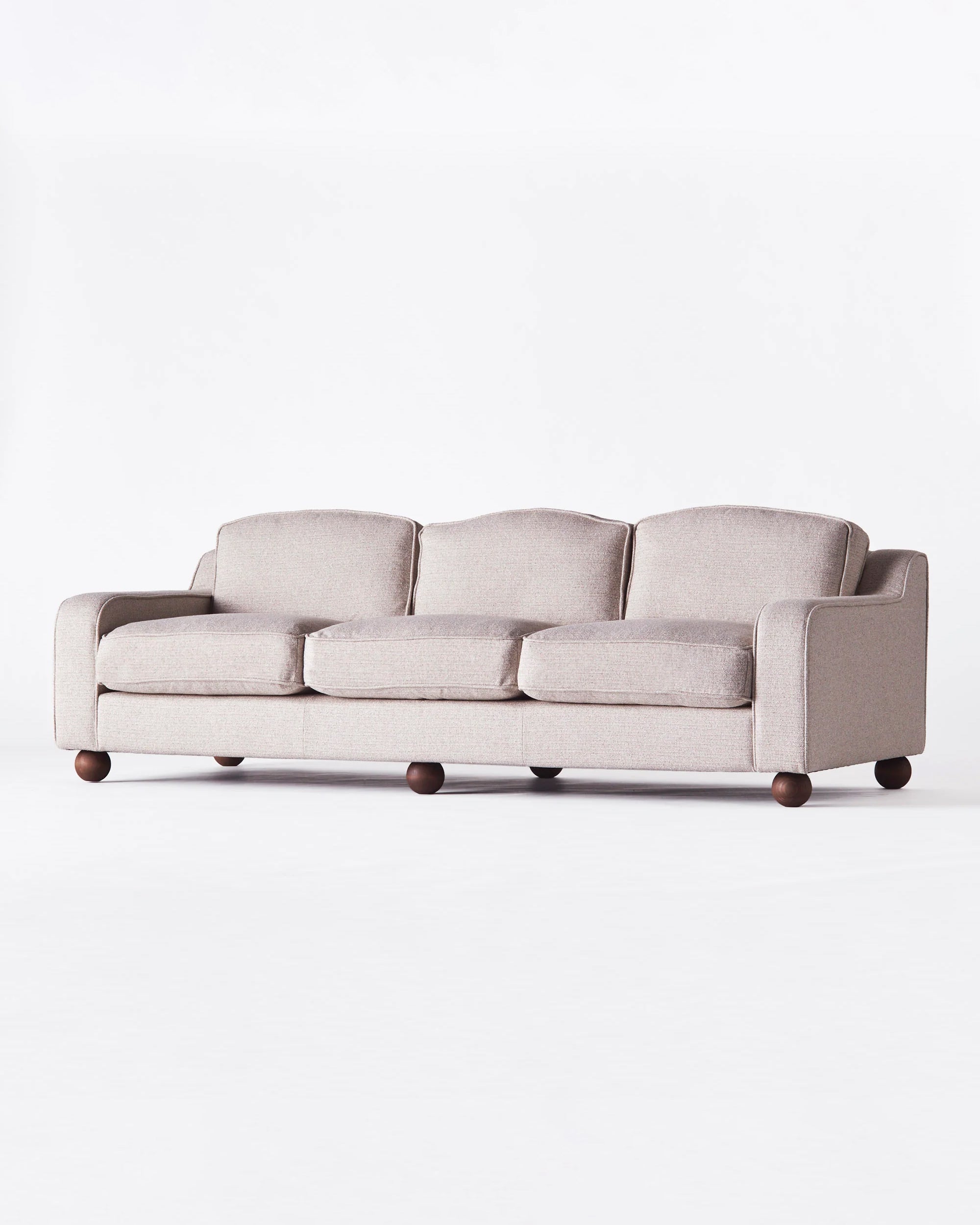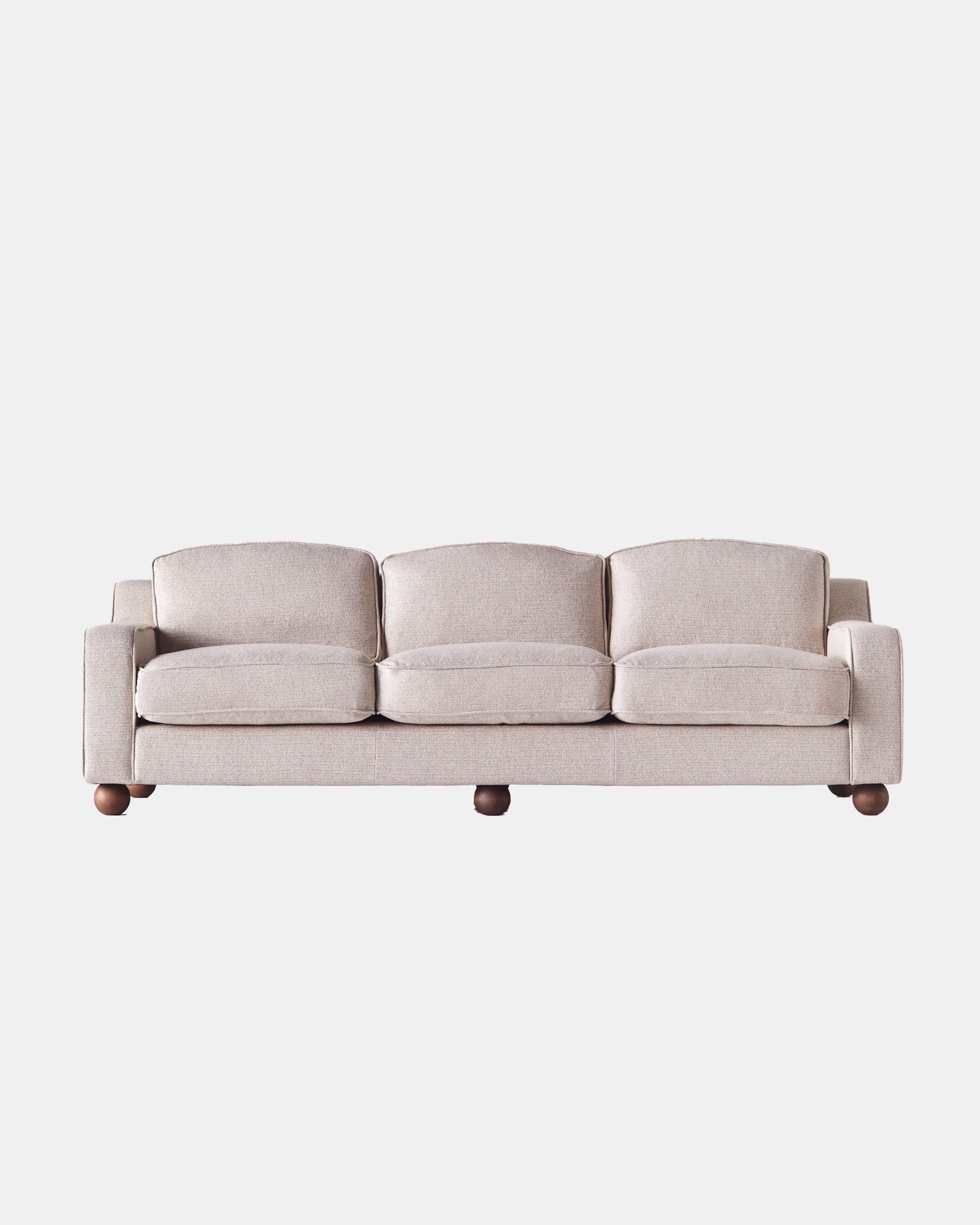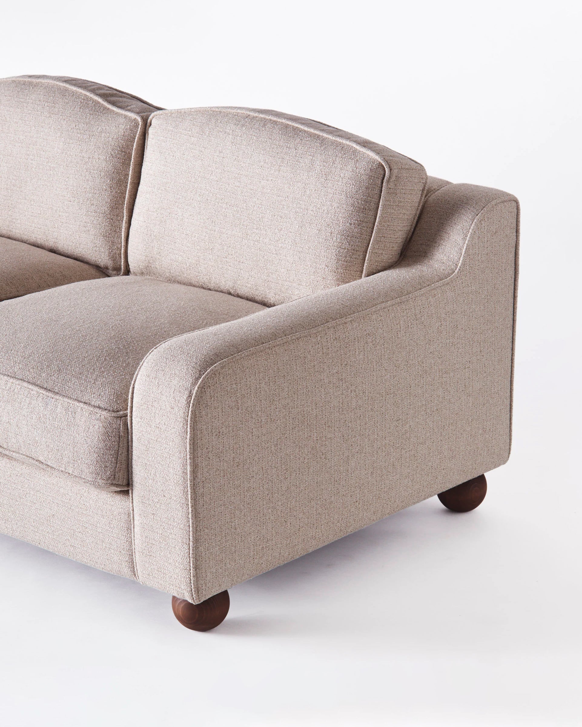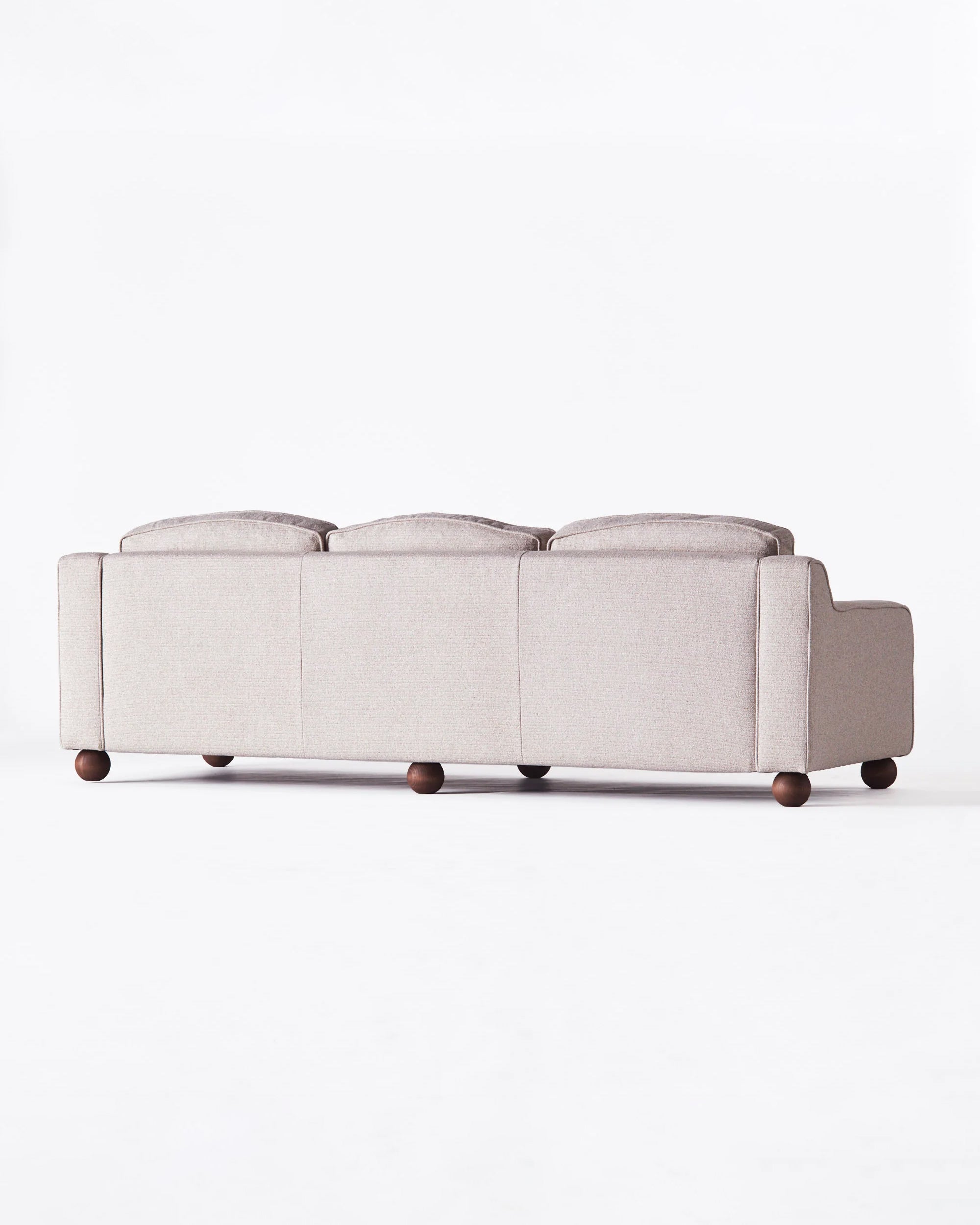 Sofaen hviler på runde ben i mørkbetset bøk, som tilfører en diskret, sofistikert kontrast til det lyse stoffet. Lola finnes også i en versjon trukket i velur – enten i grønn eller rosa – for et mer dristig uttrykk.