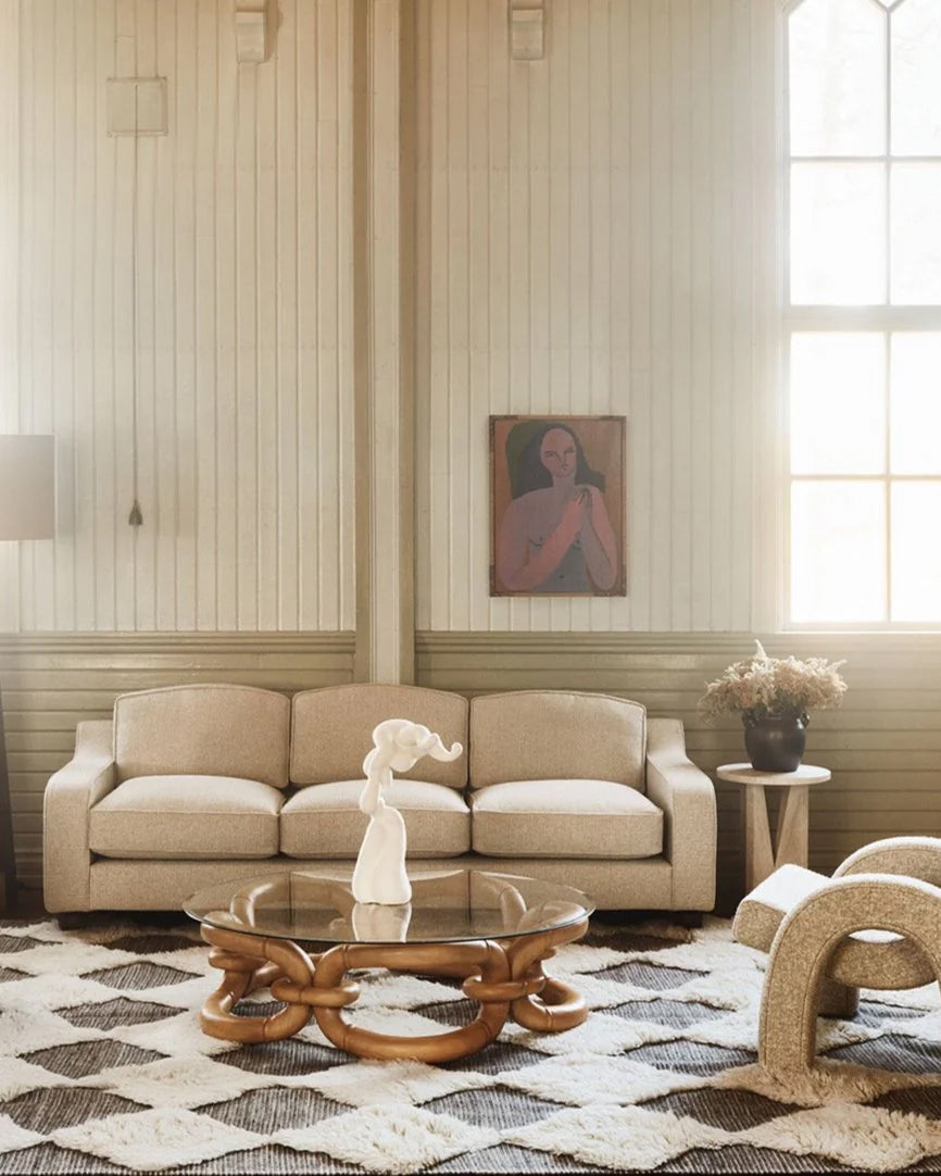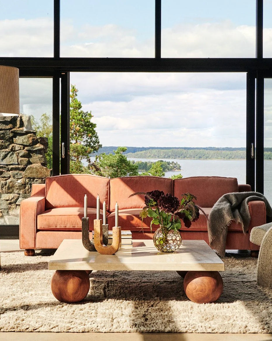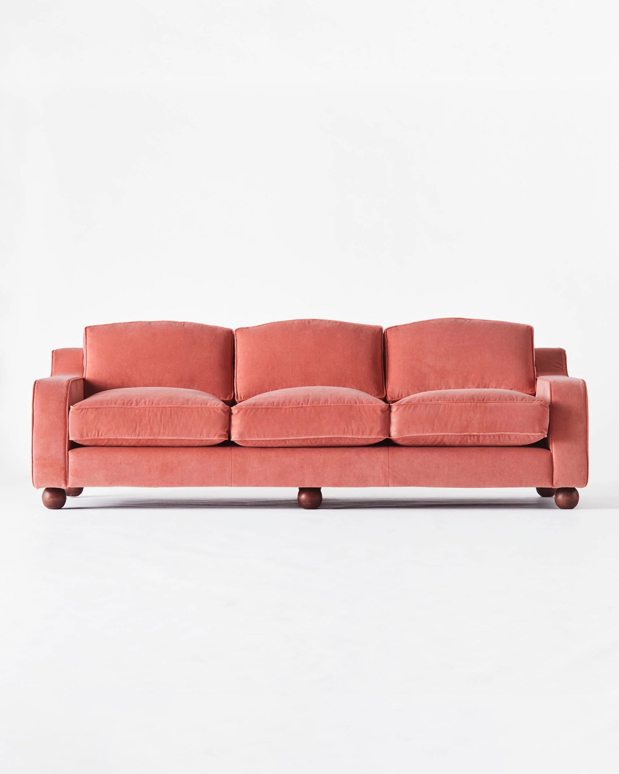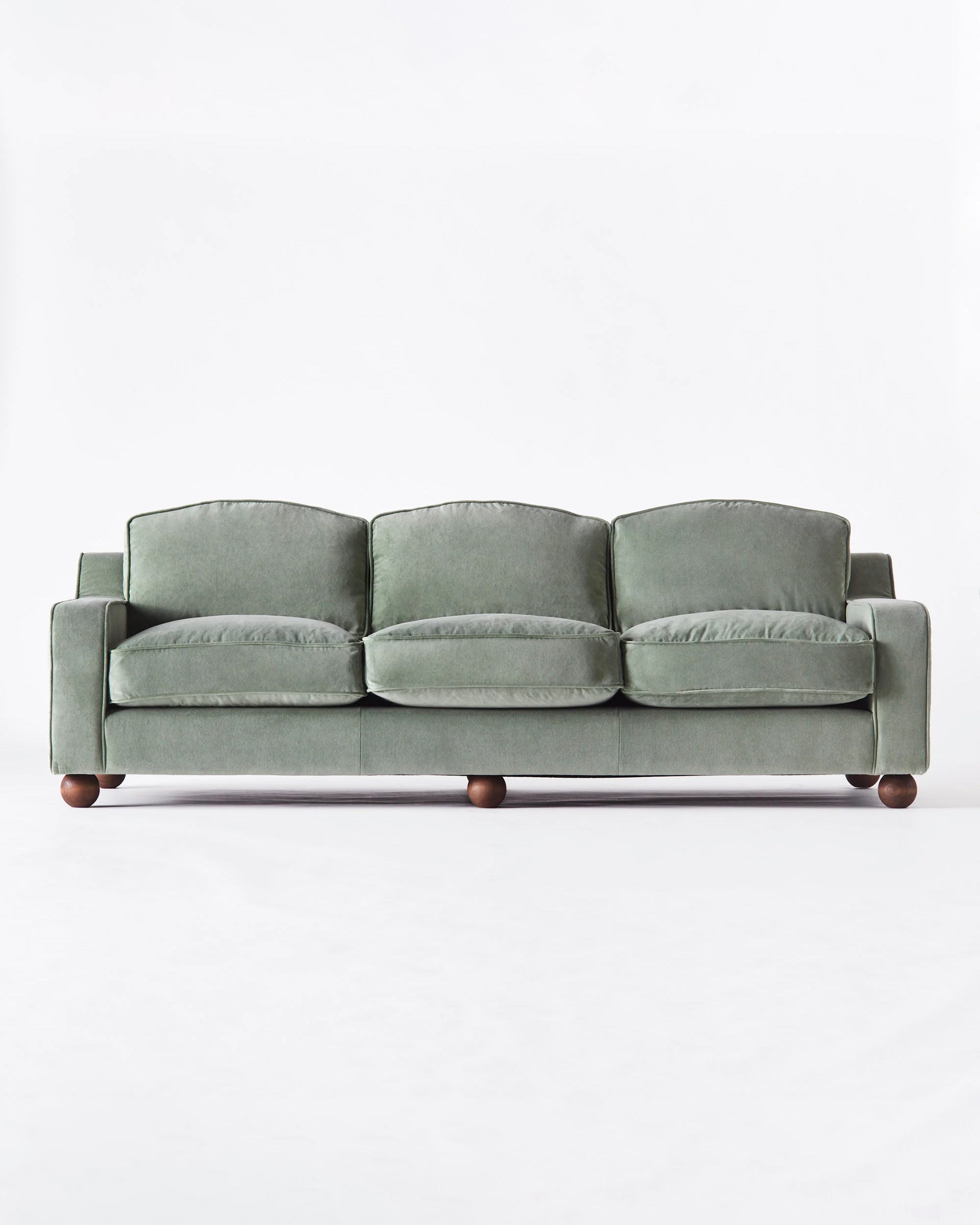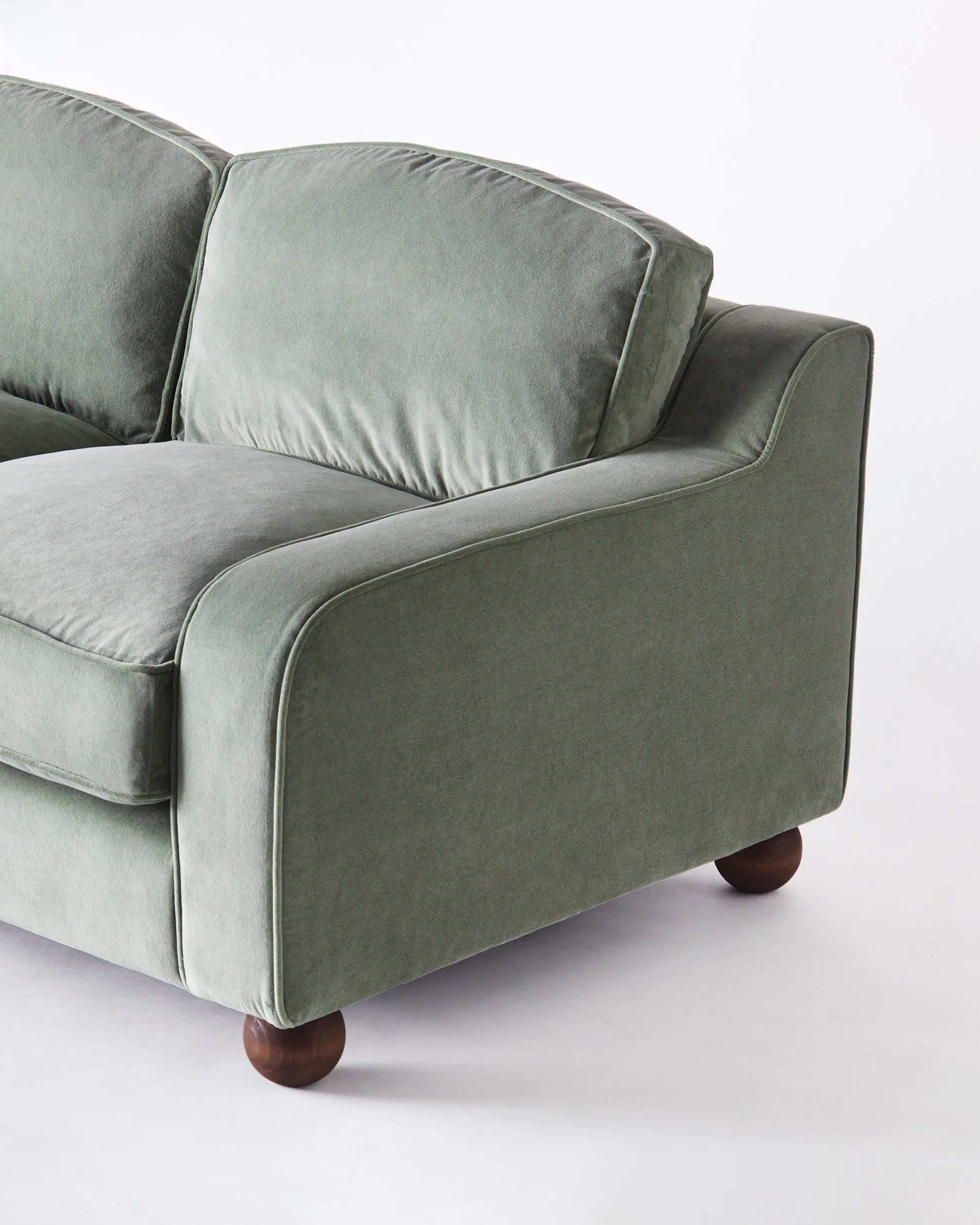 Sofaen hviler på runde ben i mørkbetset bøk, som tilfører en diskret, sofistikert kontrast til det lyse stoffet. Lola finnes også i en versjon trukket i velur – enten i grønn eller rosa – for et mer dristig uttrykk.