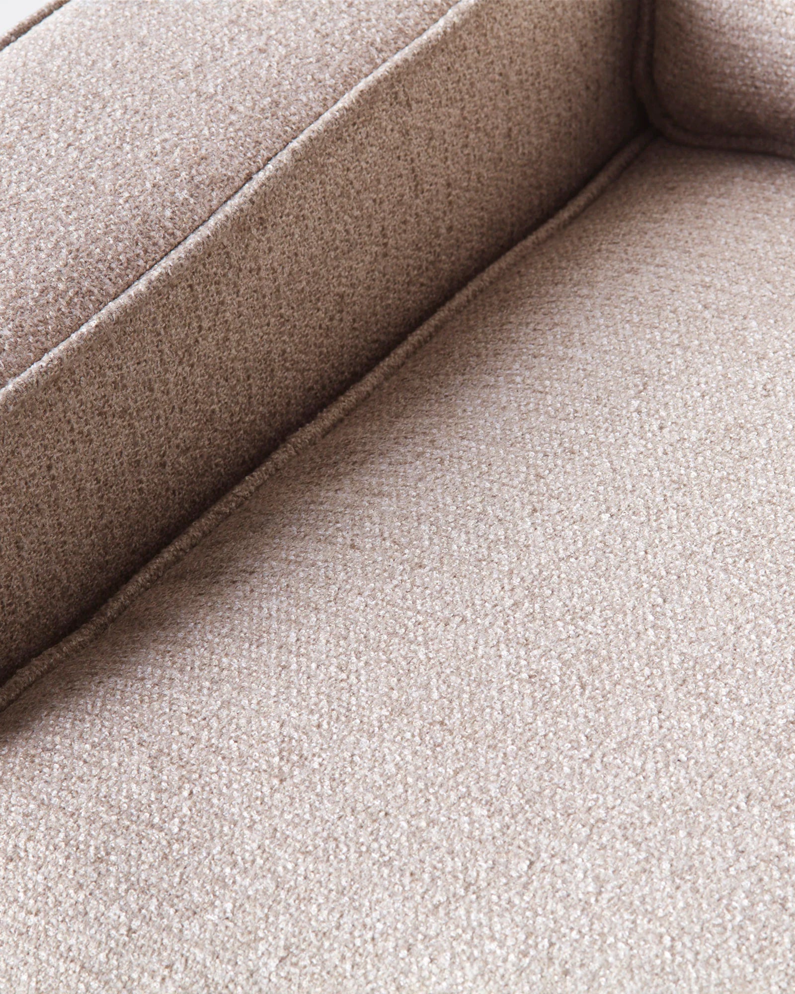 Lola er en mykt formet sofa trukket i et elegant, sandfarget jacquardstoff fra JAB. Sofaens konstruksjon består av en solid ramme i massiv bøk og plywood, med en nøye sammensatt polstring av kaldskum, polyeter, fiberfyll og et avsluttende lag med dun. Dette gir en herlig komfort og en raffinert, luksuriøs følelse.