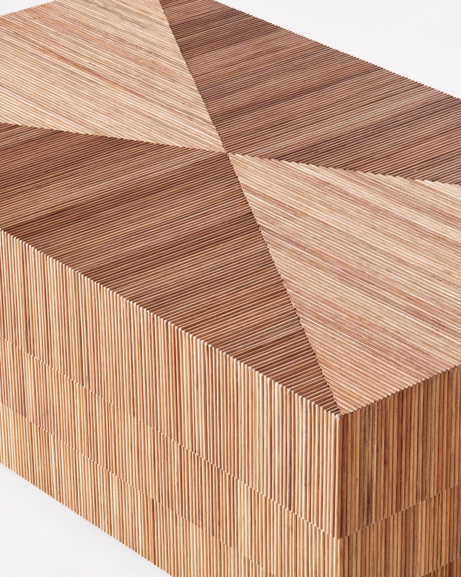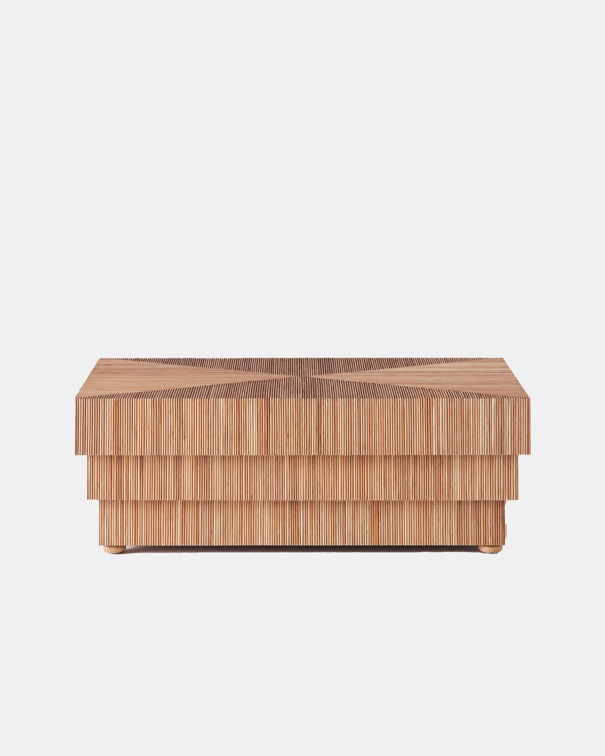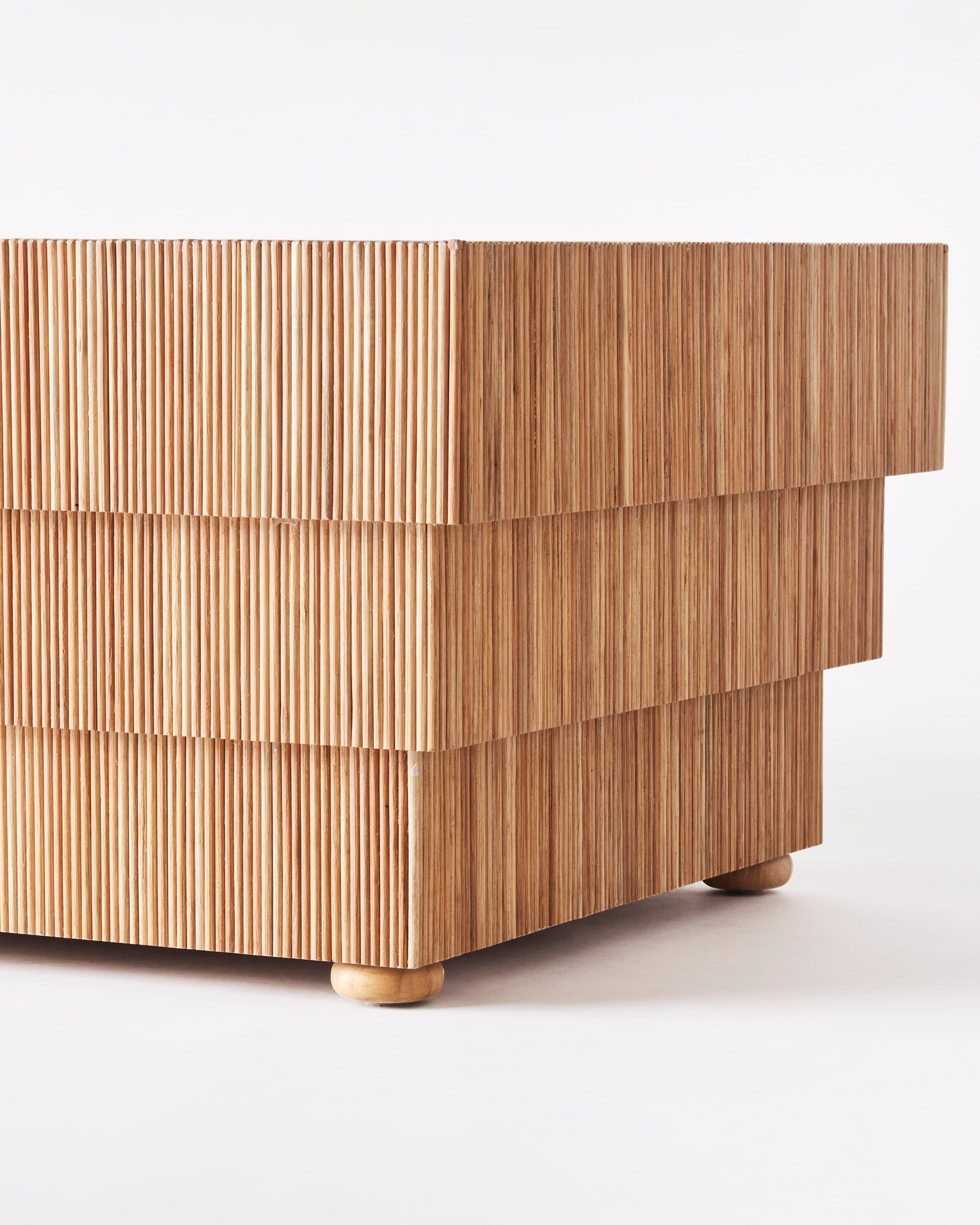 Mikado Coffee Table er et moderne sofabord med en vintagefølelse. Den unike designen med lag-på-lag i en rektangulær struktur, laget av naturlig rotting der hvert lag varierer litt i størrelse, tilfører et snev av moderne vintage til ethvert rom. Bordplaten har et iøynefallende geometrisk mønster som skaper en dynamisk visuell detalj. Dette unike sofabordet passer perfekt som midtpunkt i en stue eller lounge.