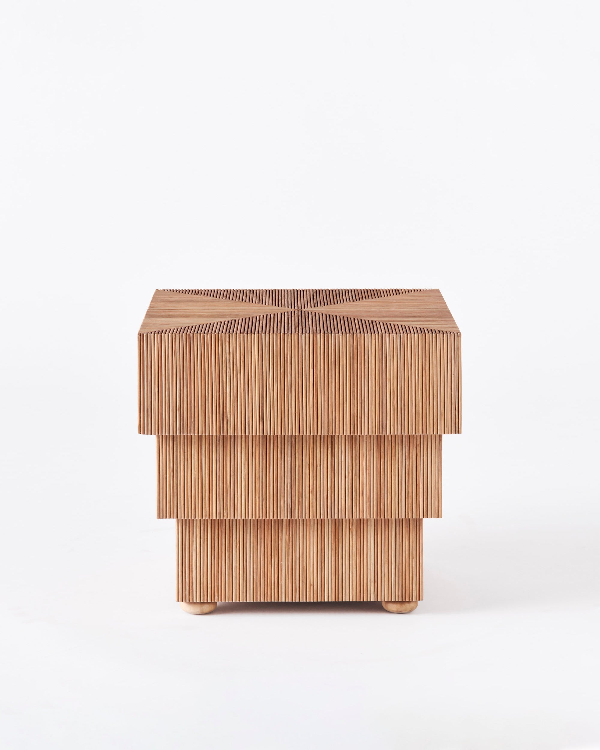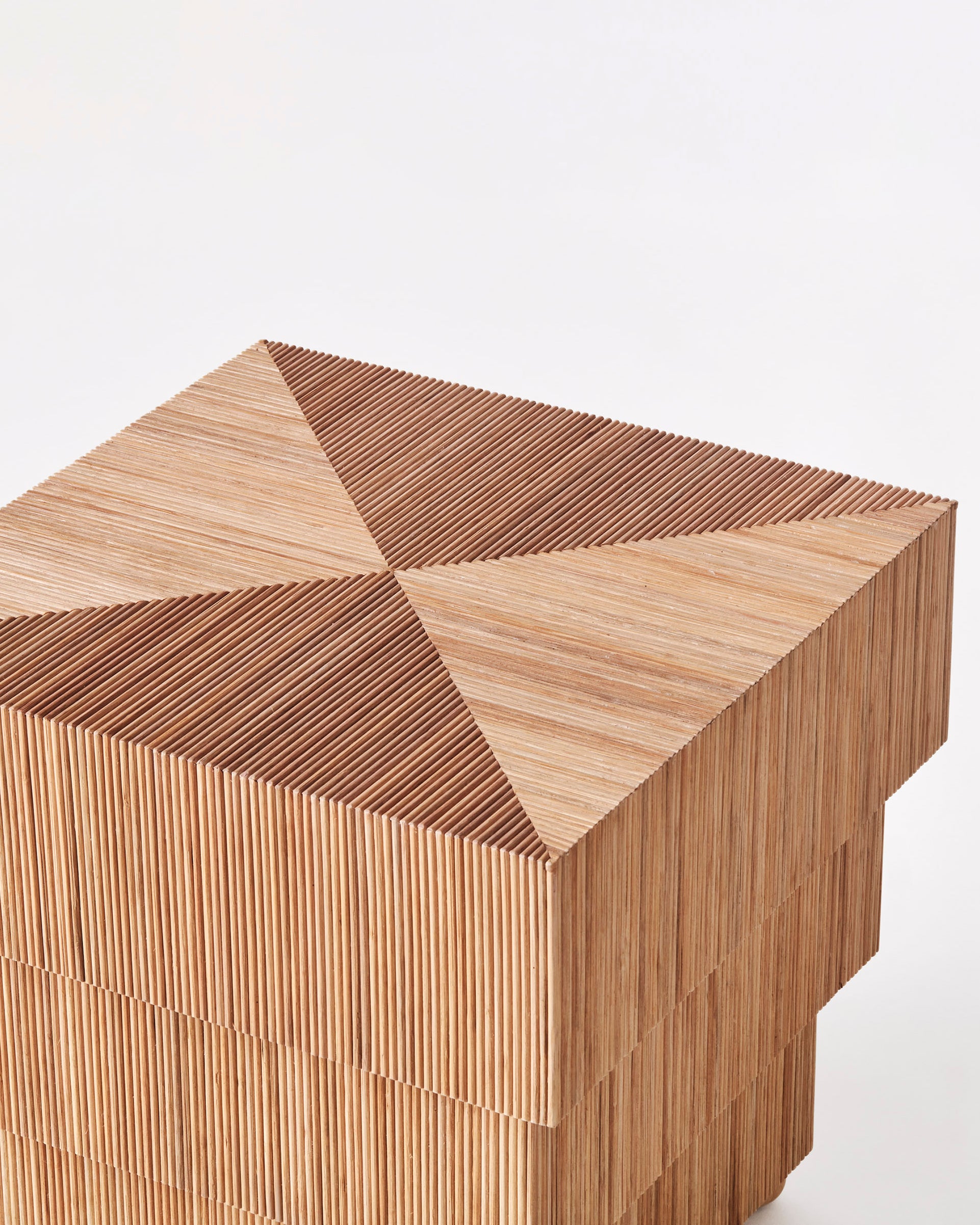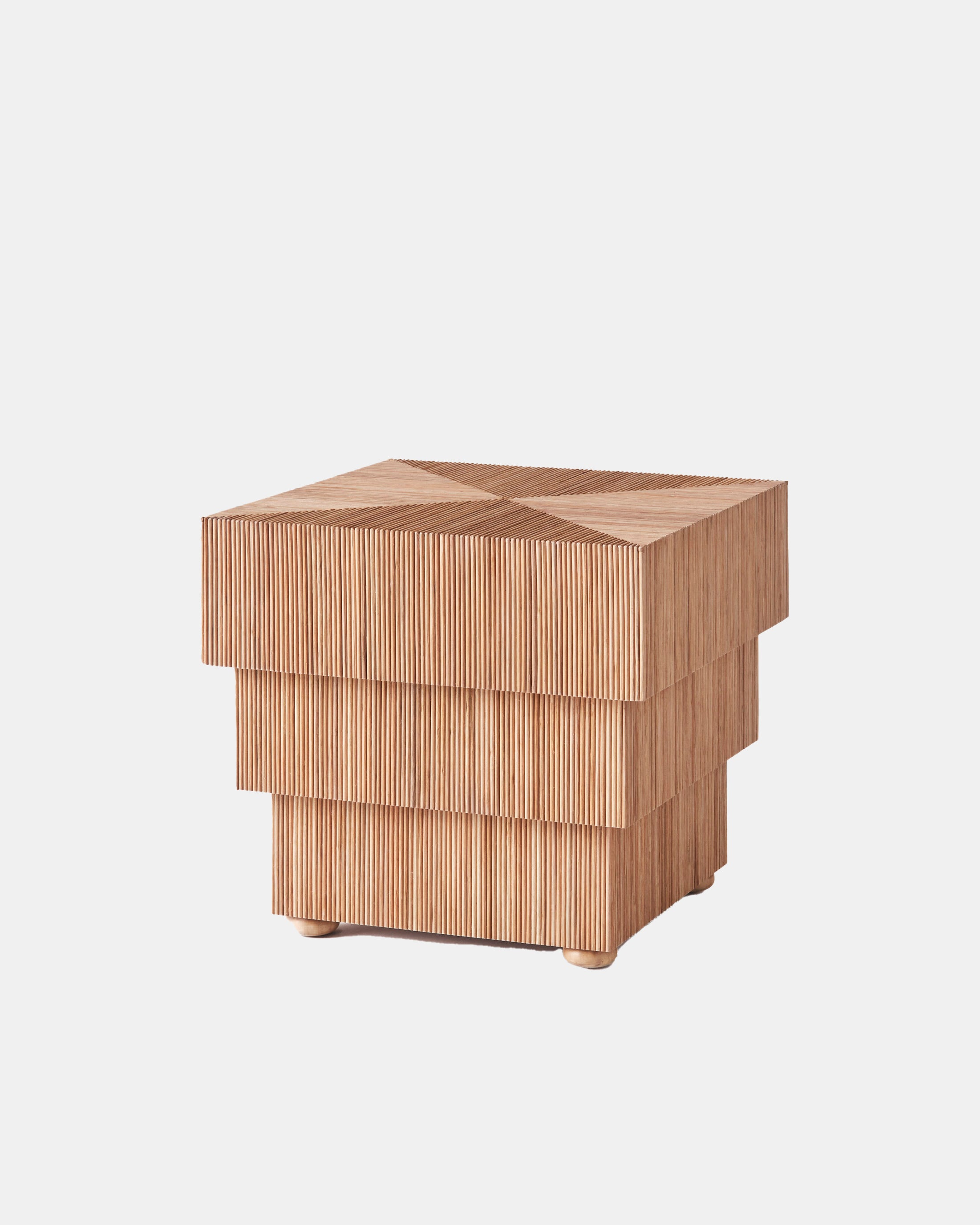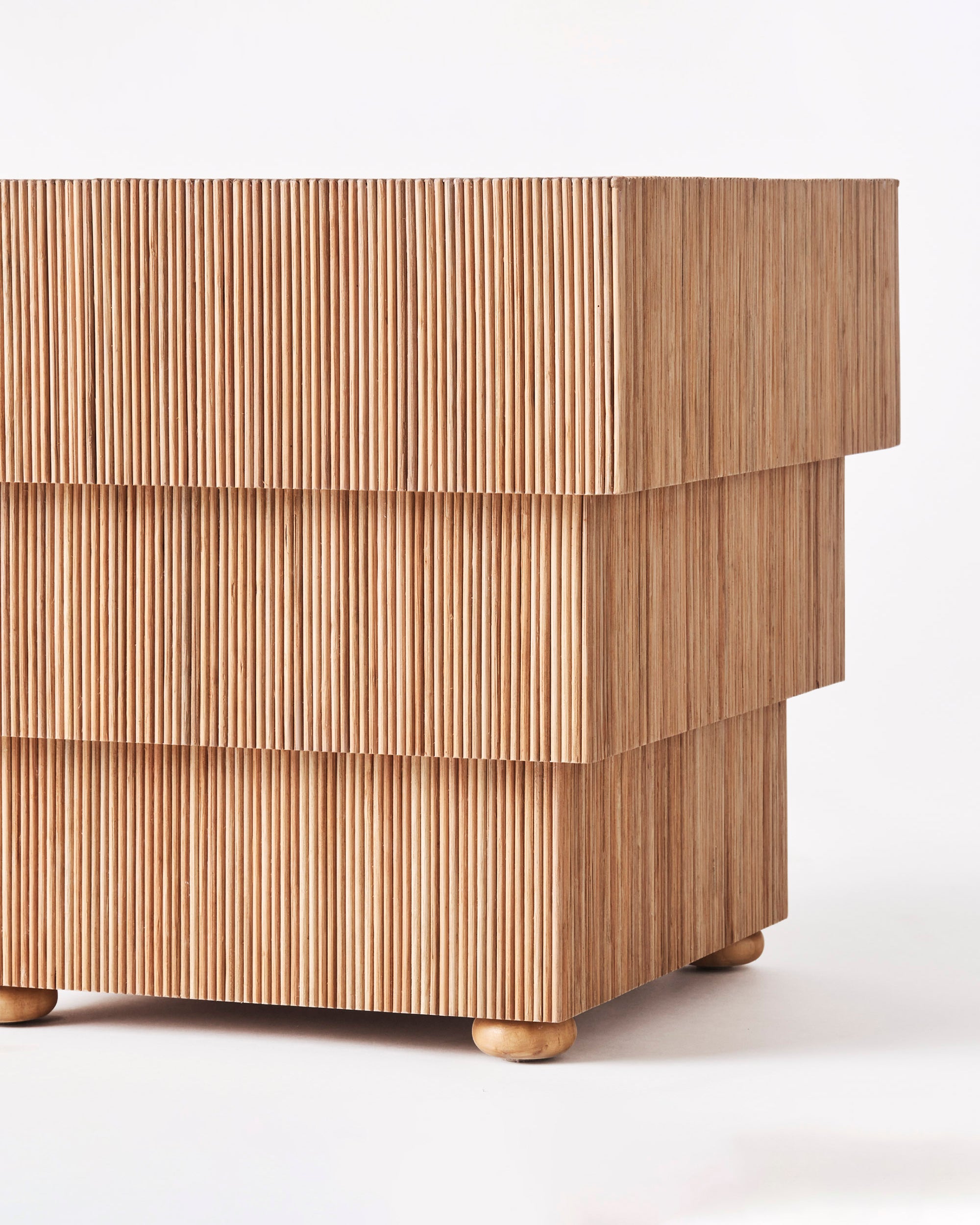 Mikado Side Table er et moderne sidebord med en vintagefølelse. Den unike designen med stabelstruktur av kuber, laget av naturlig rotting der hver kube varierer litt i størrelse, tilfører et snev av moderne vintage til ethvert rom. Bordplaten har et iøynefallende geometrisk mønster som gir en dynamisk visuell detalj. Perfekt for koselige kroker eller som et elegant nattbord.