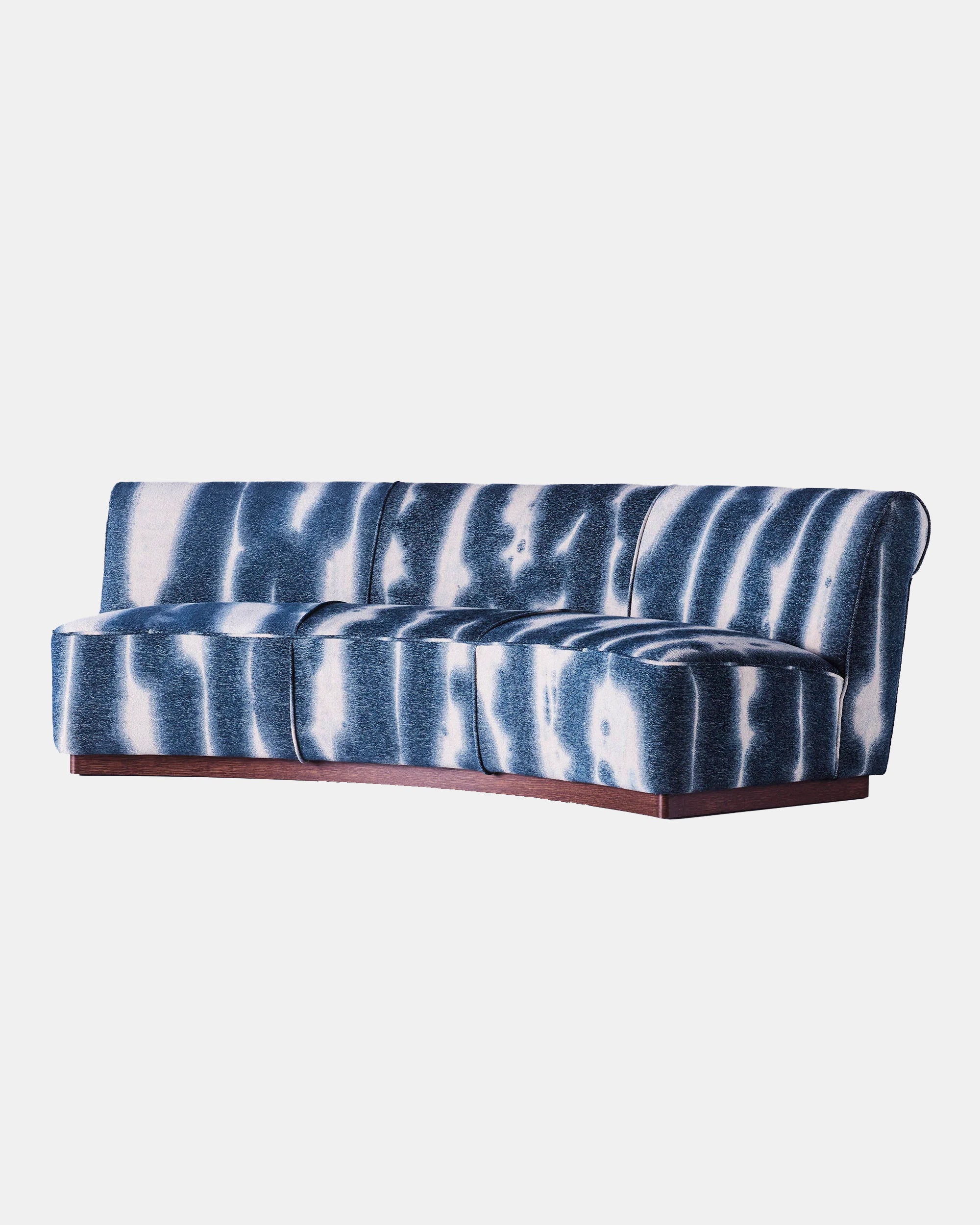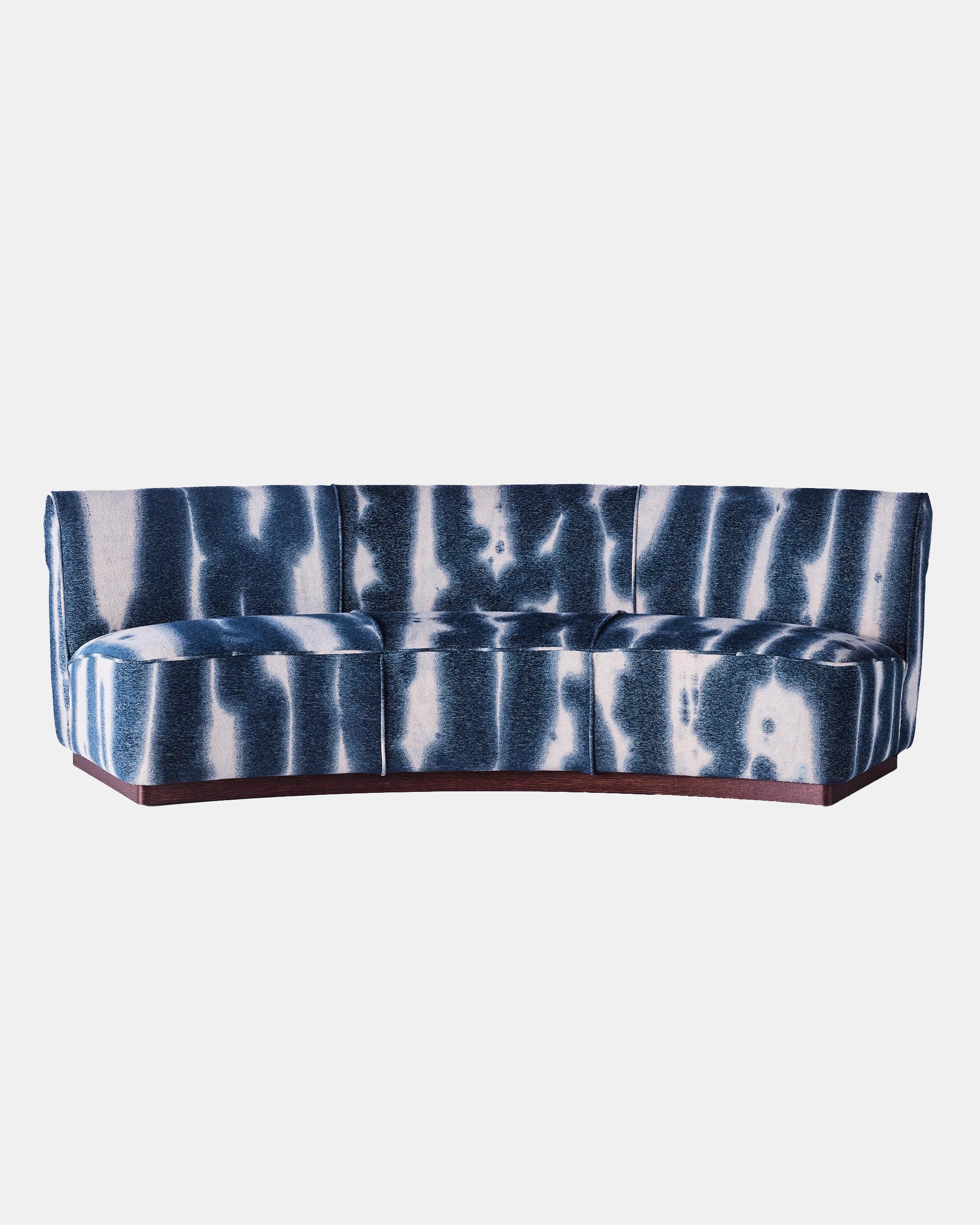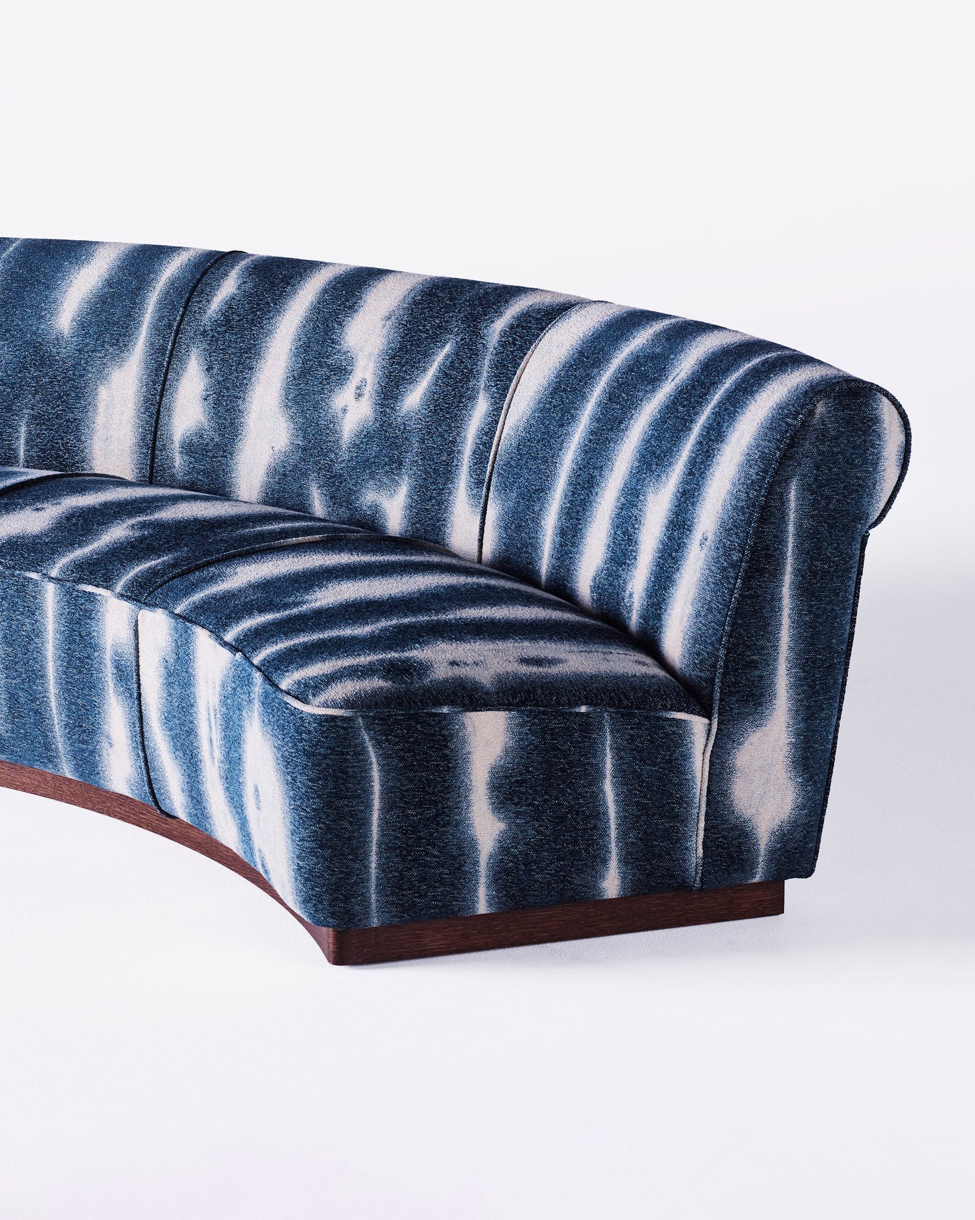 Paris Sofa er en sofistikert, buet design av Elias Svedberg (1913–1987), relansert av Dusty Deco i 2023. Med sin solide ramme i bøk, lag med fjær og høykvalitets skum, kombinerer den stabilitet med dyp komfort. Denne utgaven er trukket i et abstrakt, spraymønstret chenillestoff som tilfører en dristig, men elegant karakter til den tidløse silhuetten.