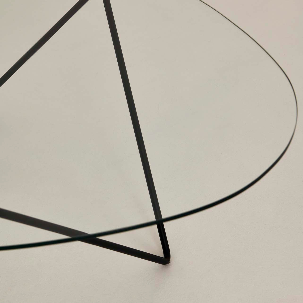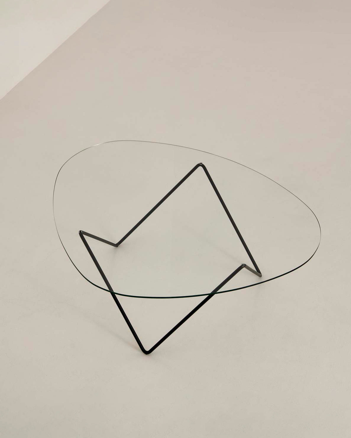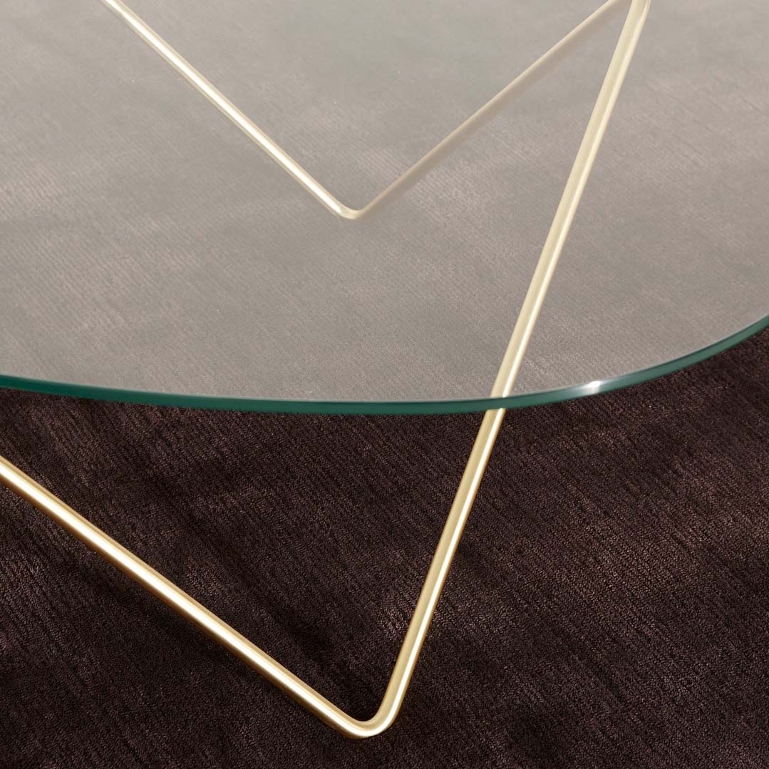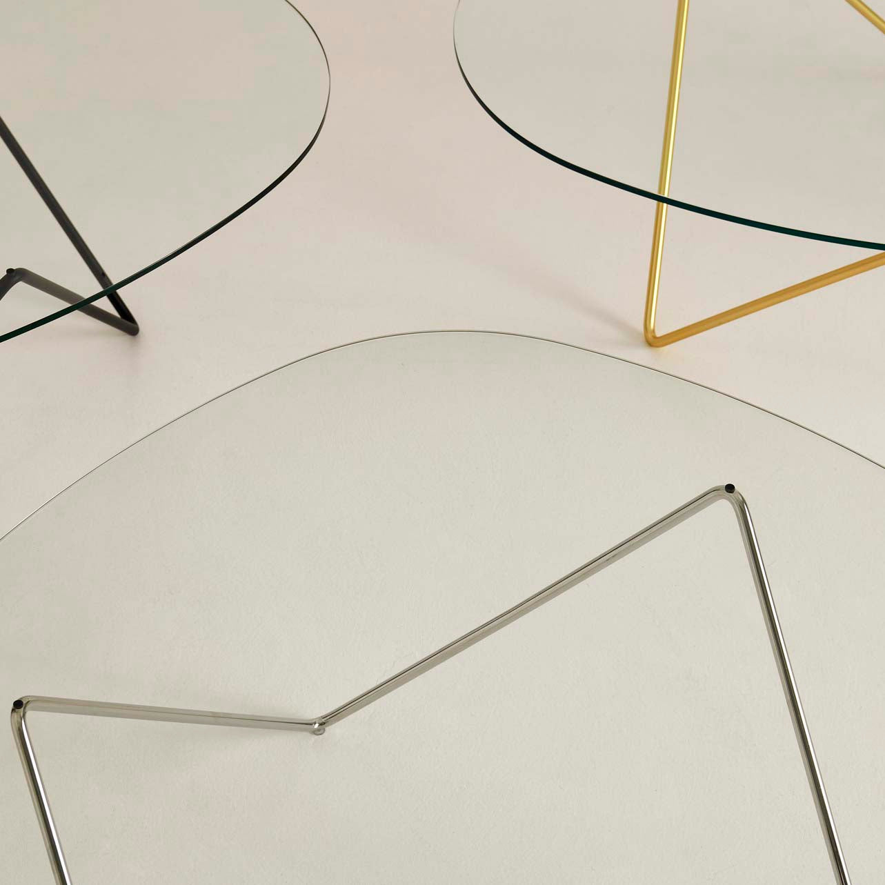 Materiale: Lakkert metall eller messing, bordplate i klart glass