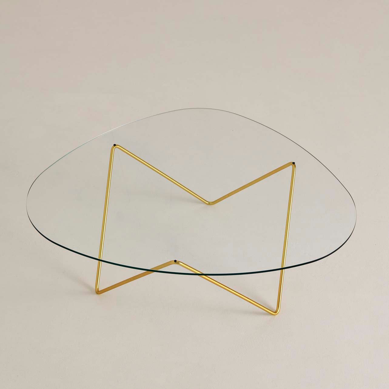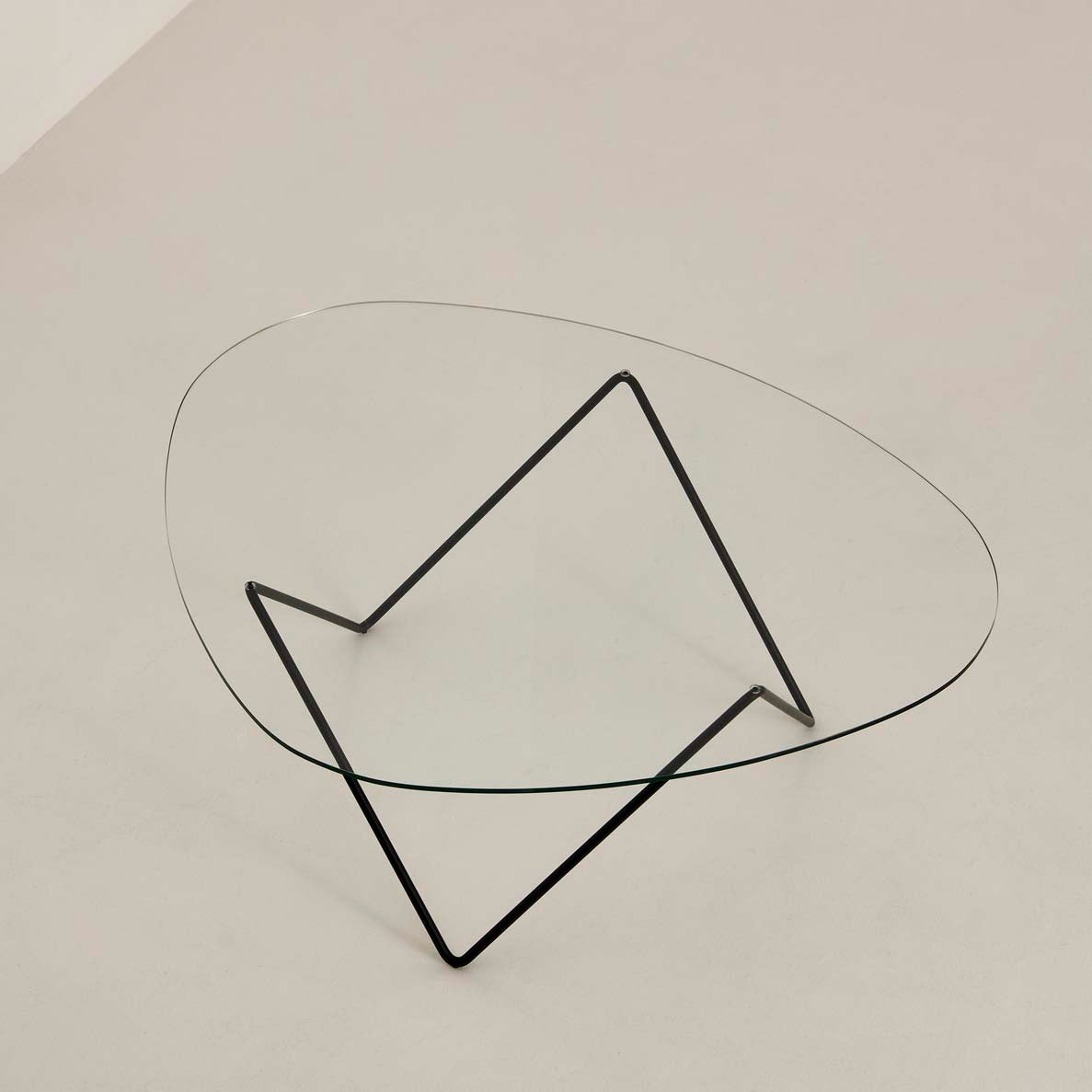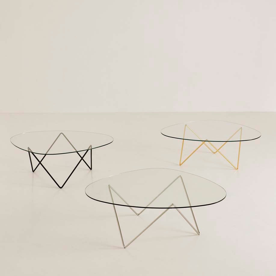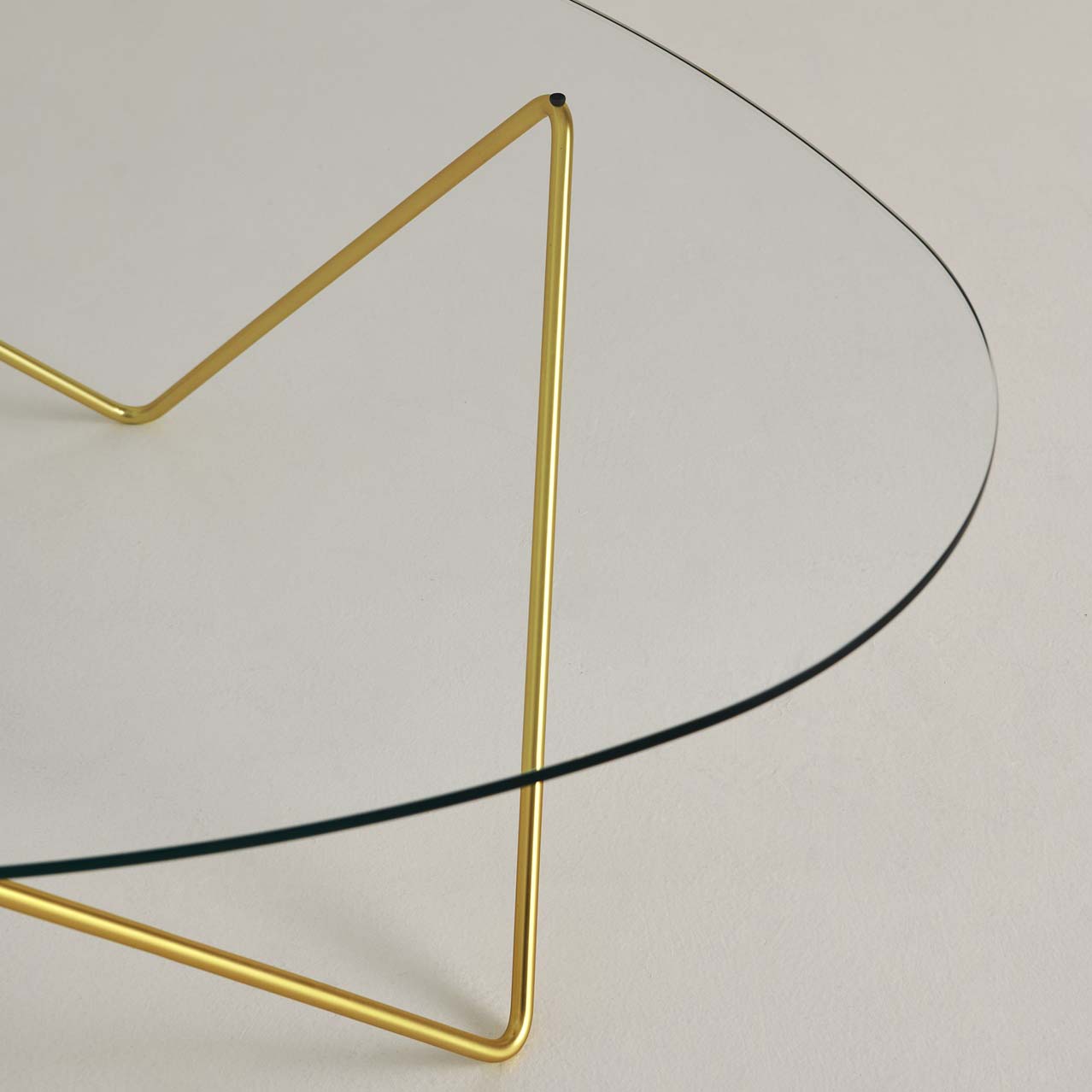 Materiale: Lakkert metall eller messing, bordplate i klart glass