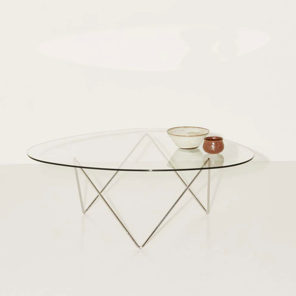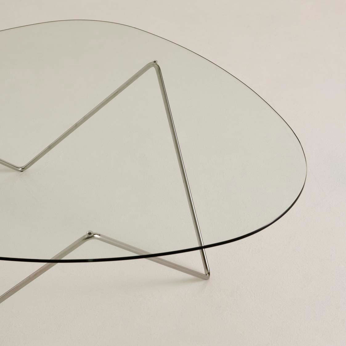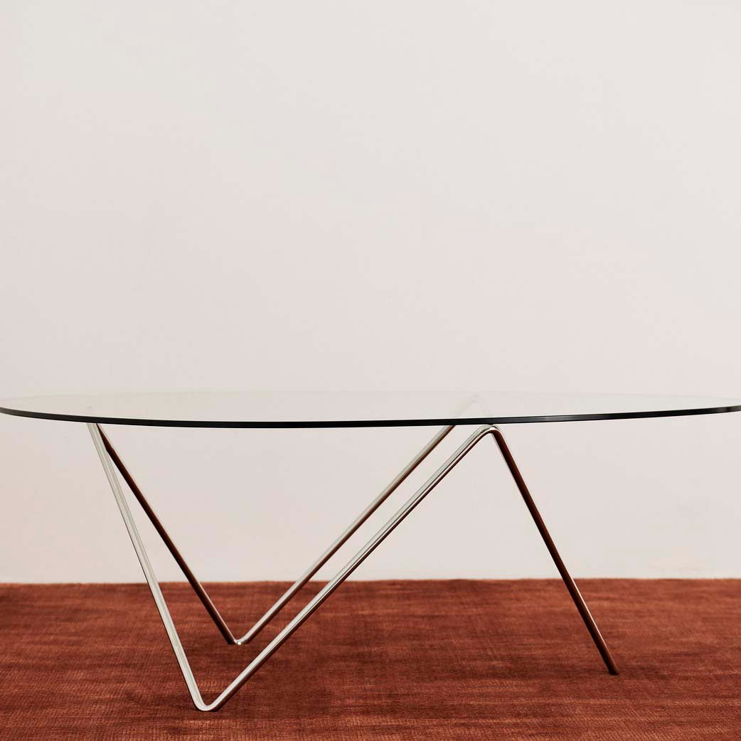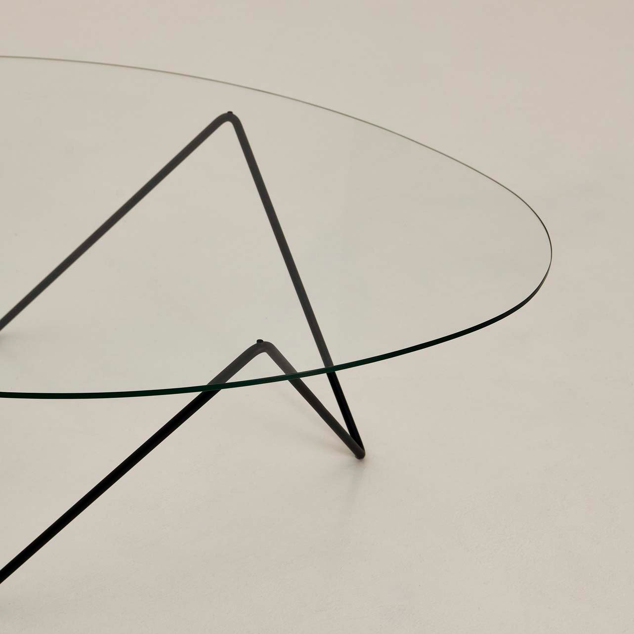 Materiale: Lakkert metall eller messing, bordplate i klart glass