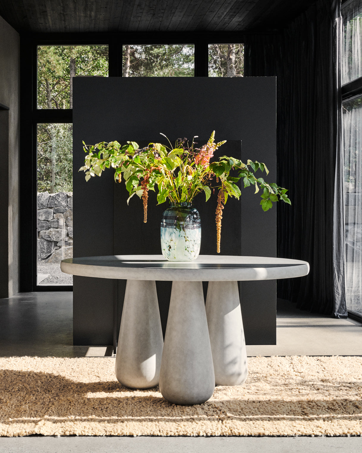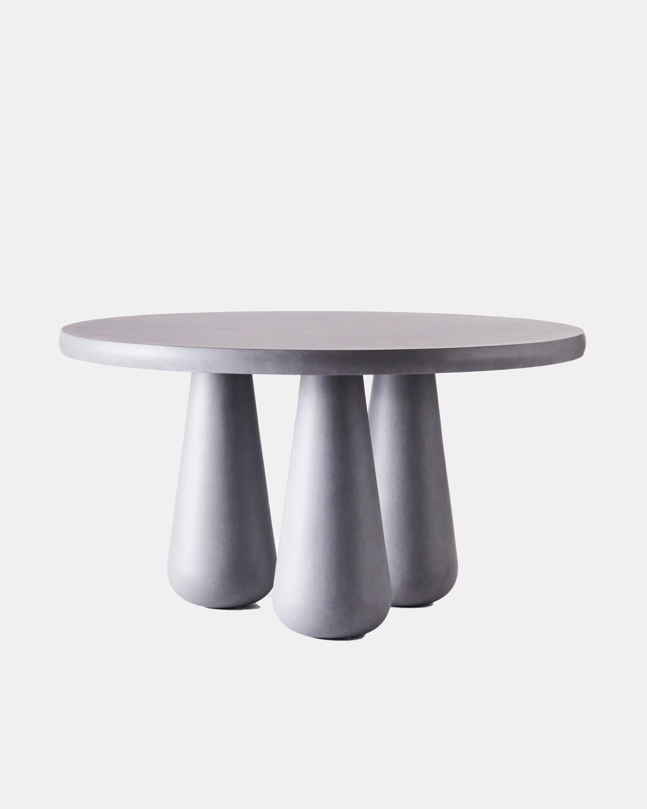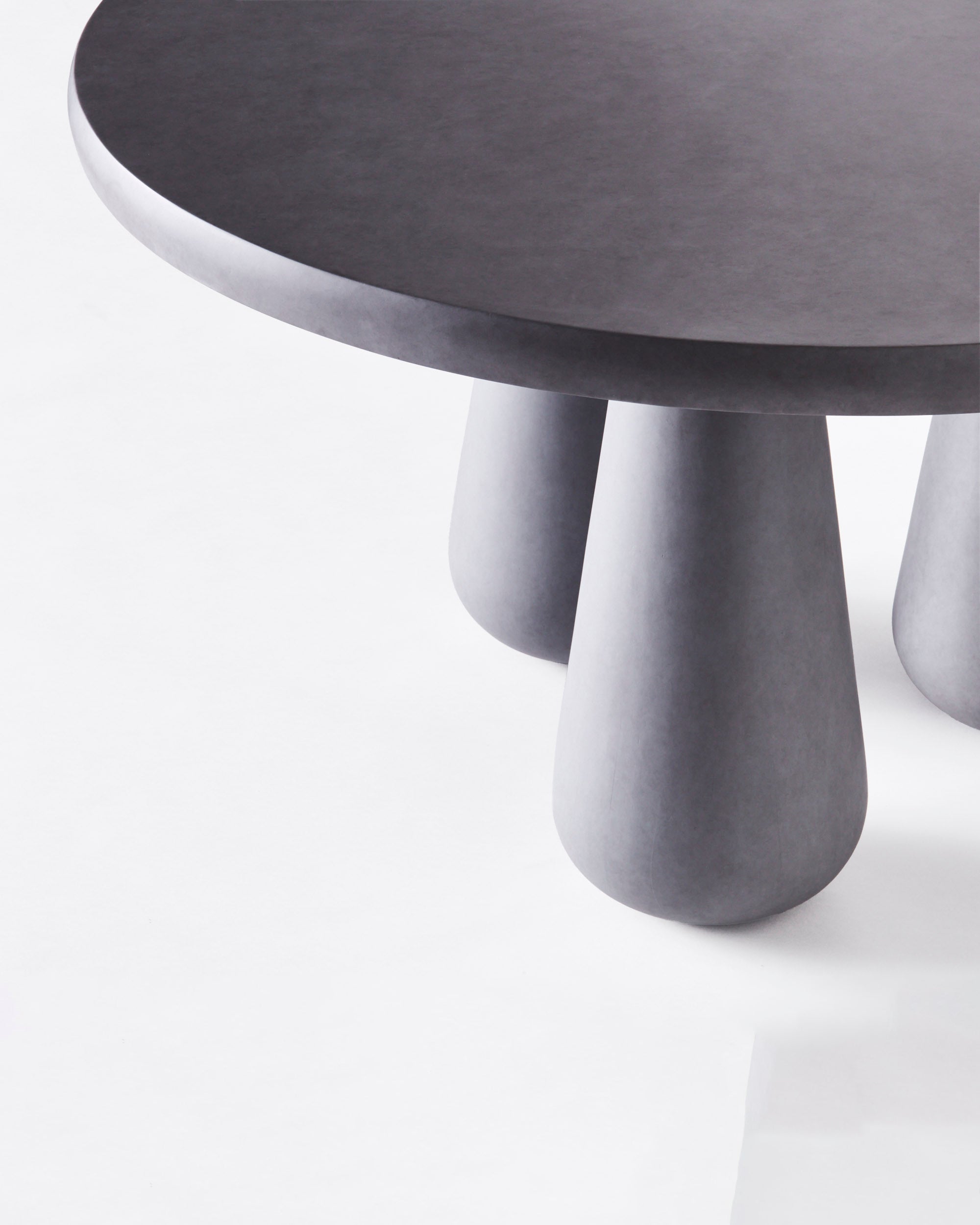 Bordet har en unik finish som minner om betong, men under den grå overflaten skjuler det seg en ramme av bøk og kryssfiner.
