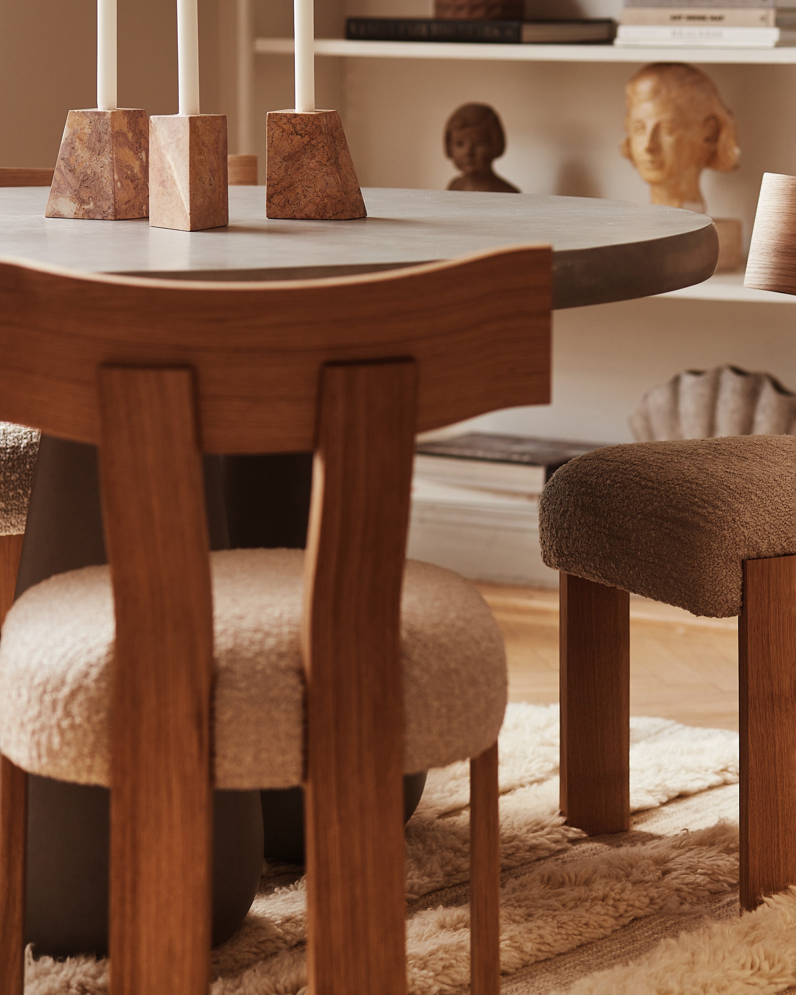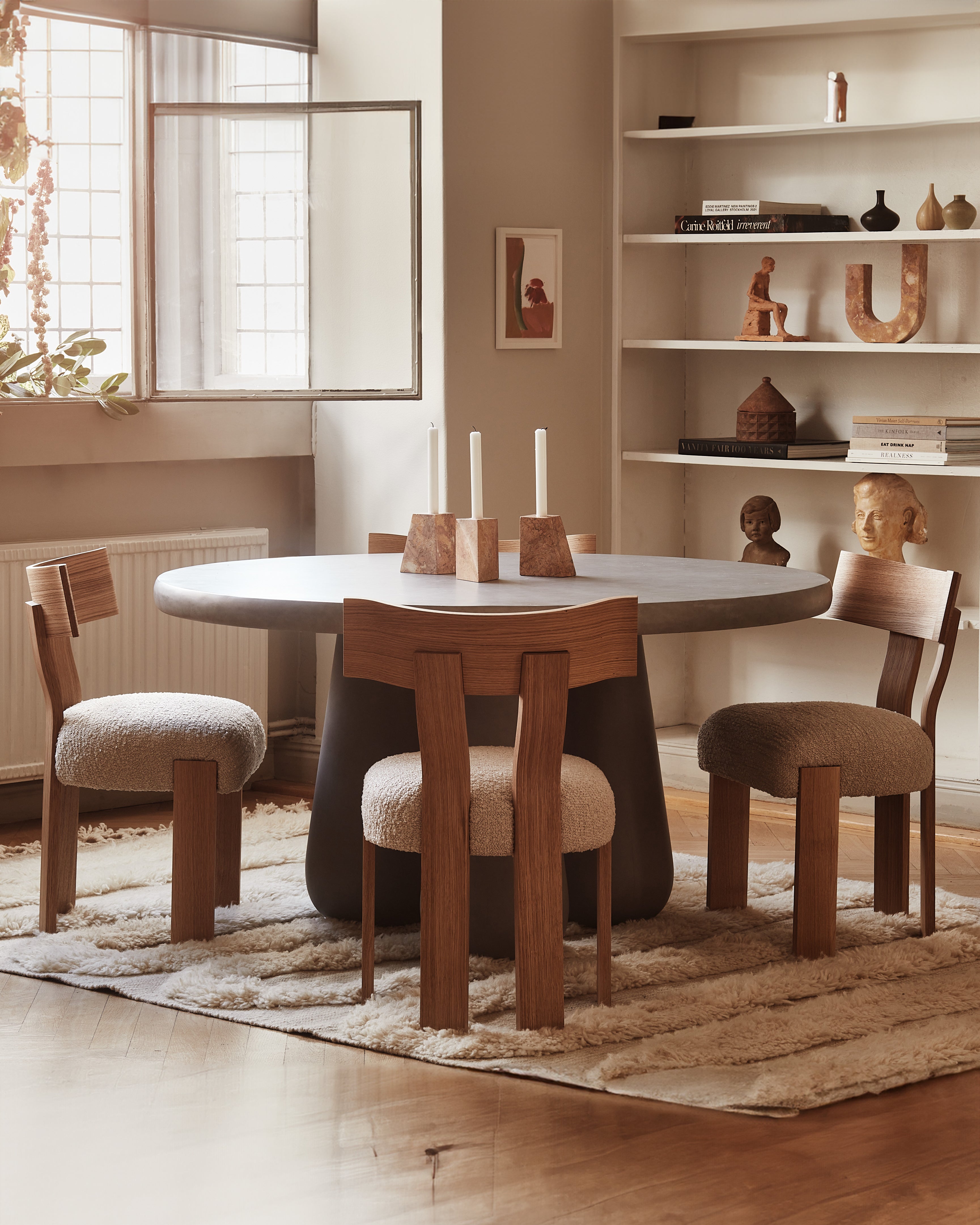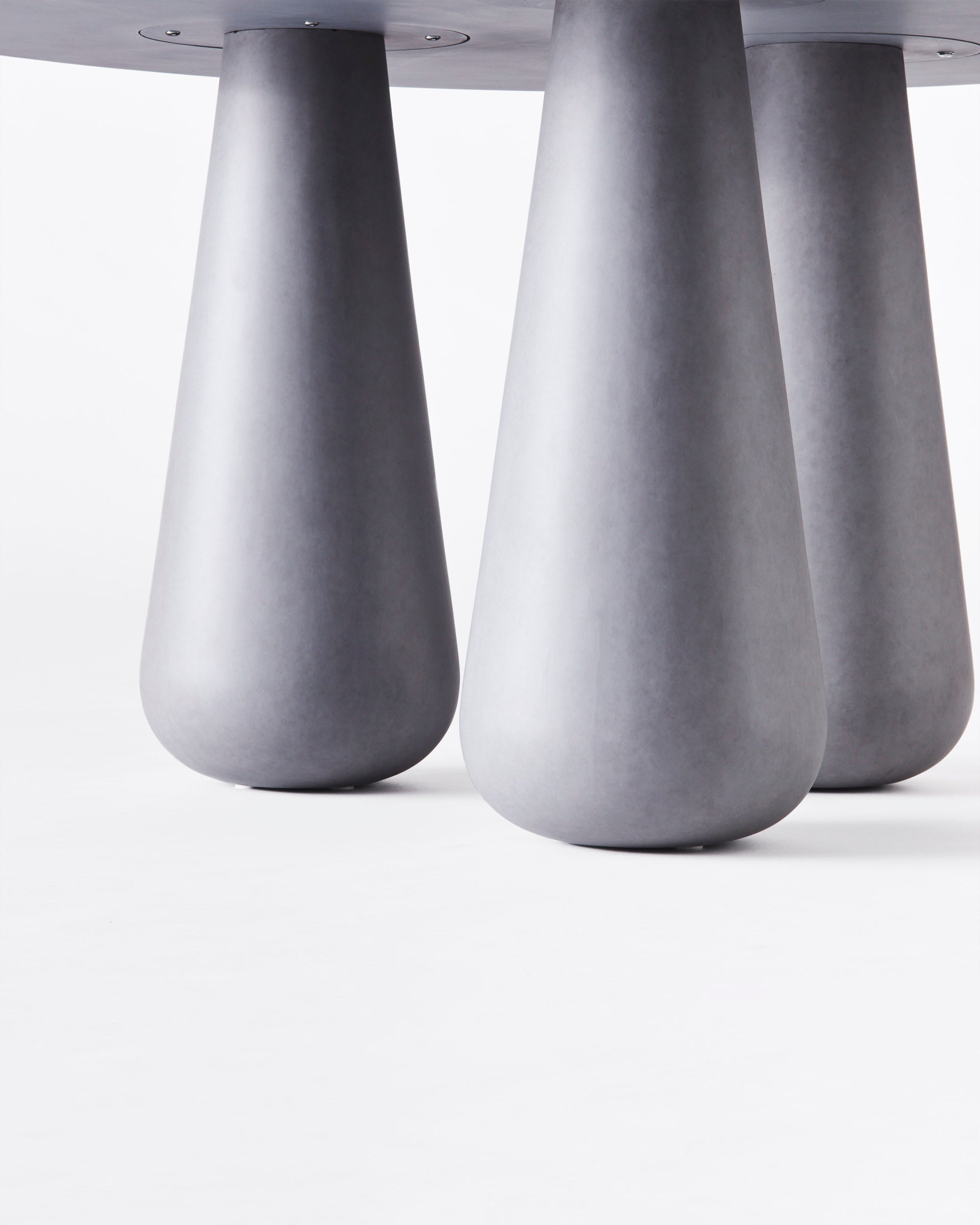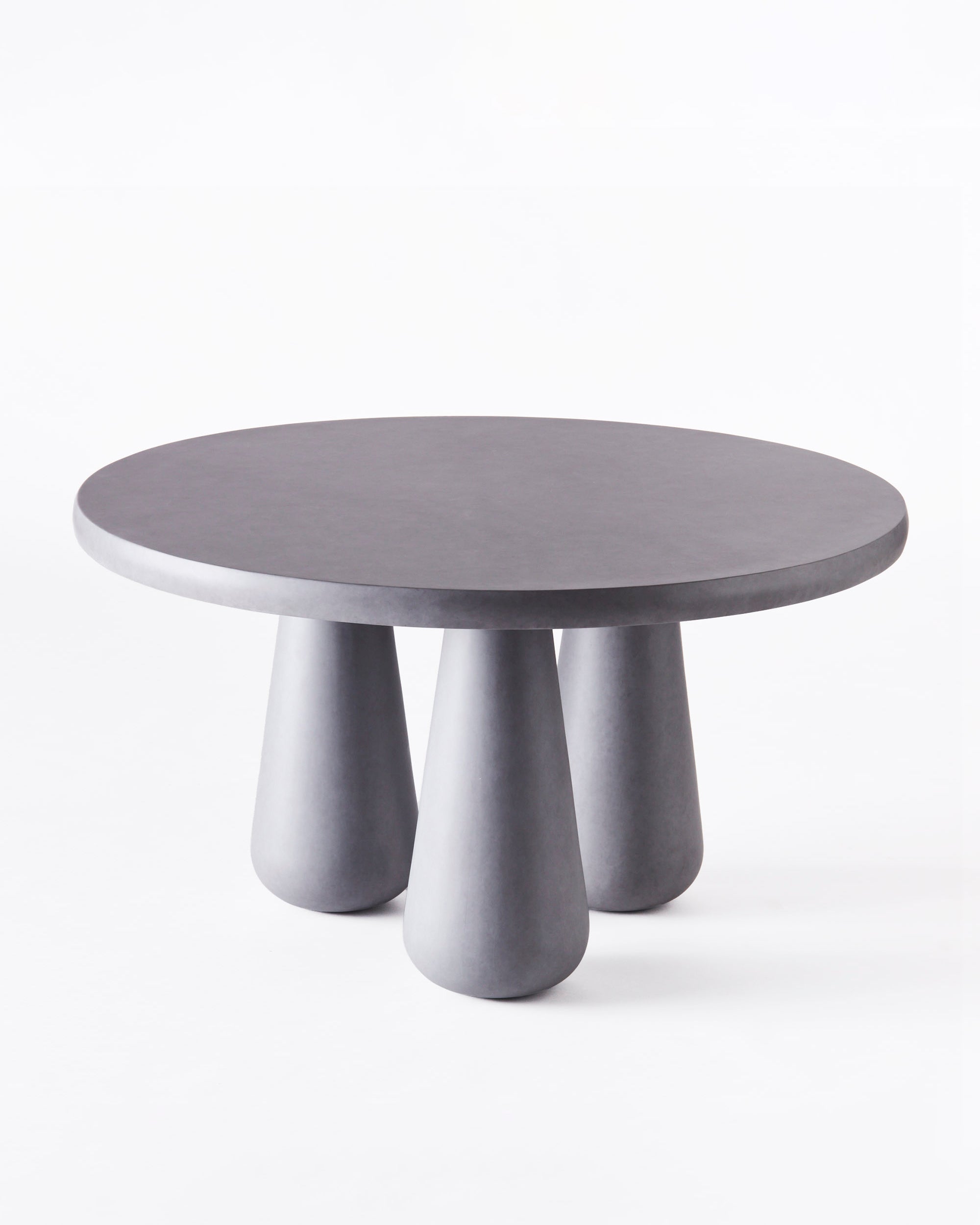 Bordet har en unik finish som minner om betong, men under den grå overflaten skjuler det seg en ramme av bøk og kryssfiner.