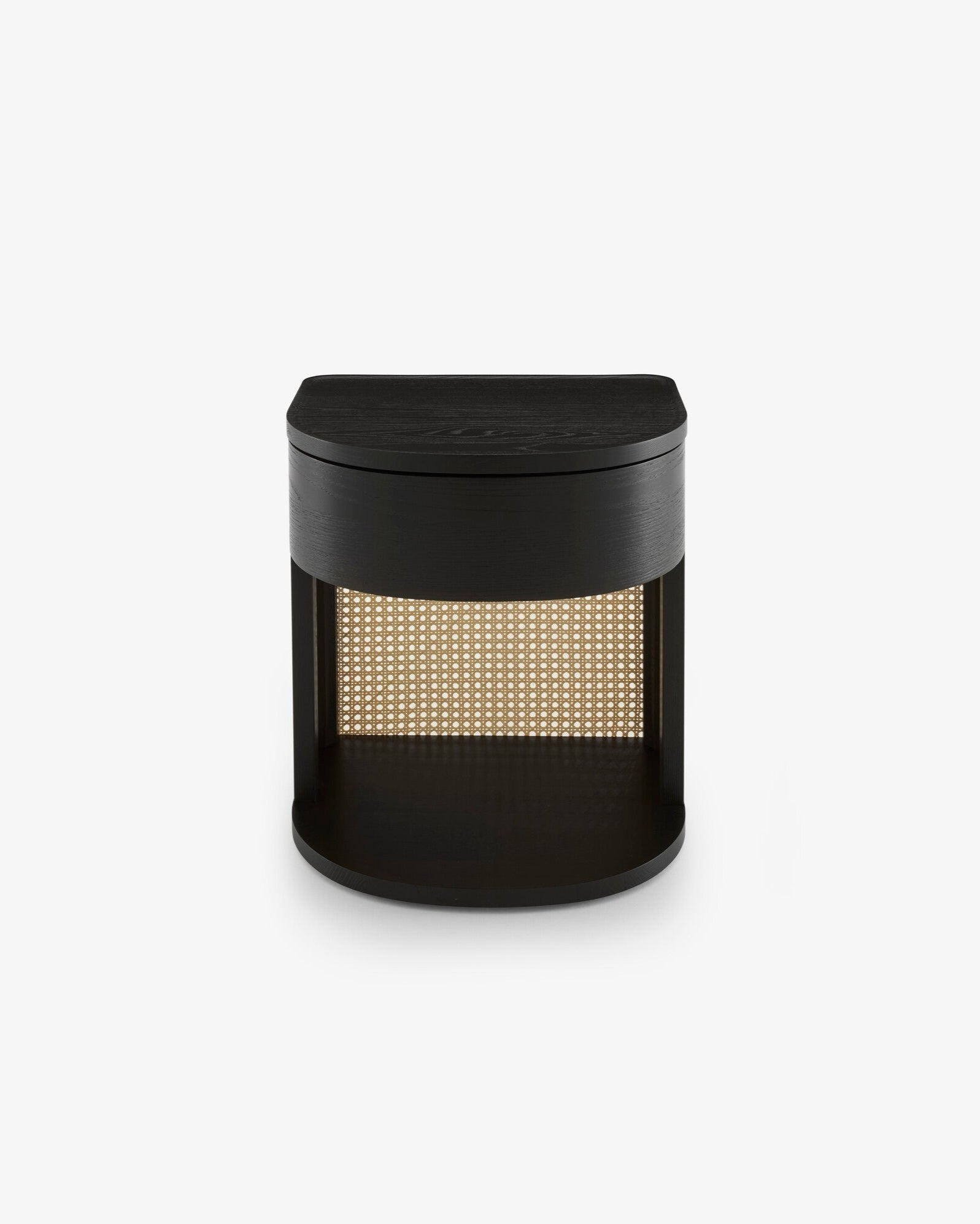 Det buede Tambour nattbordet av Ligne Roset består svart ask med naturlig rotting for å gi en moderne estetikk fra midten av århundre.