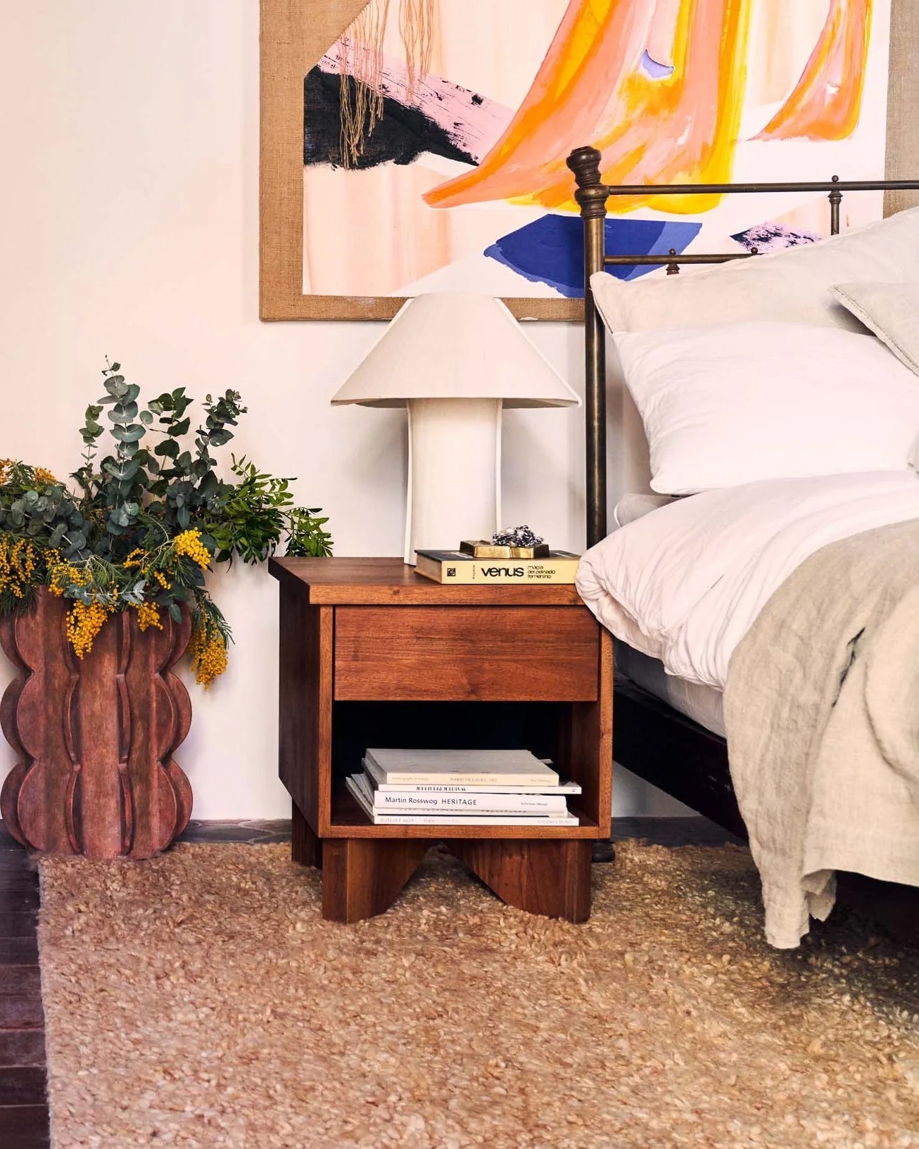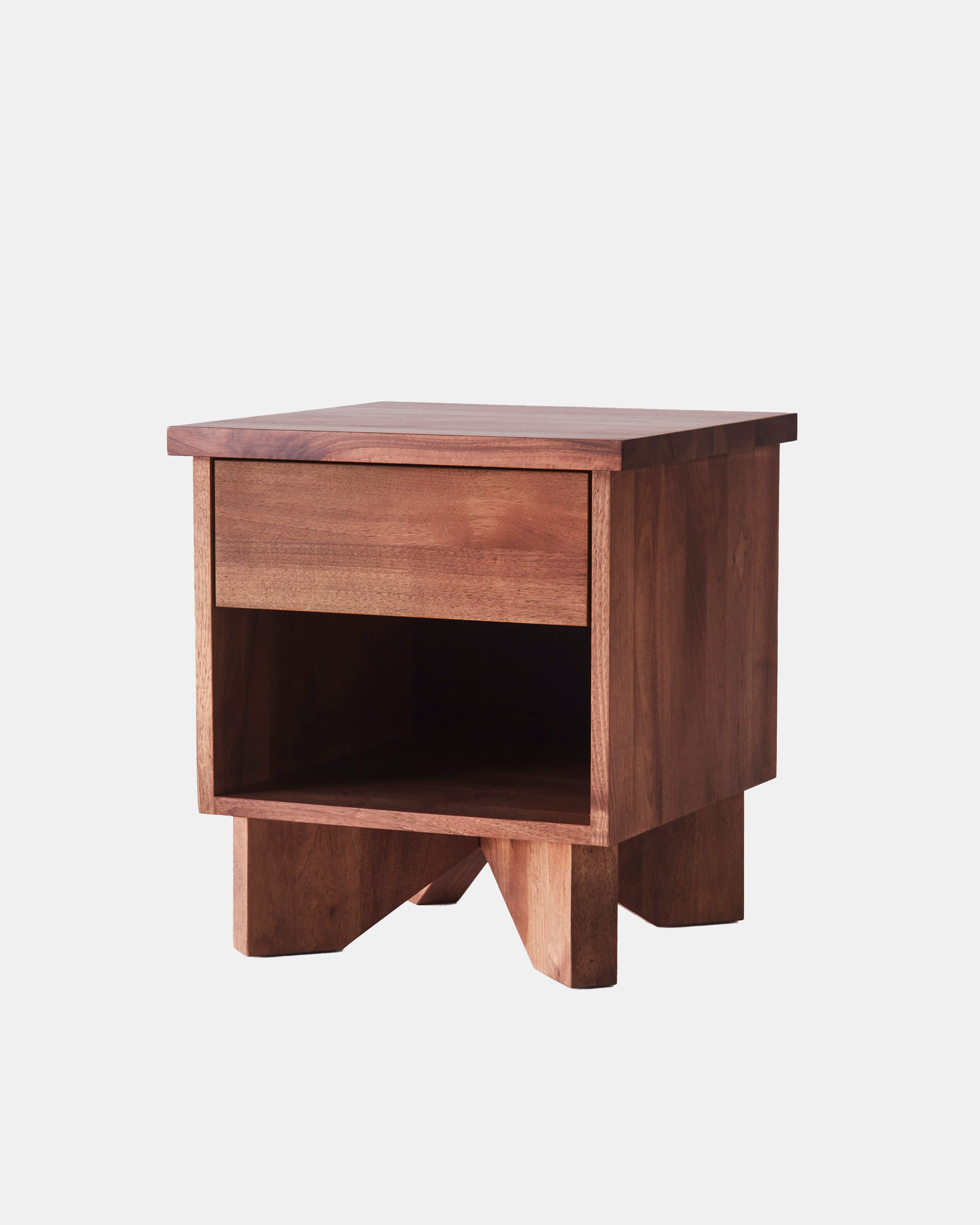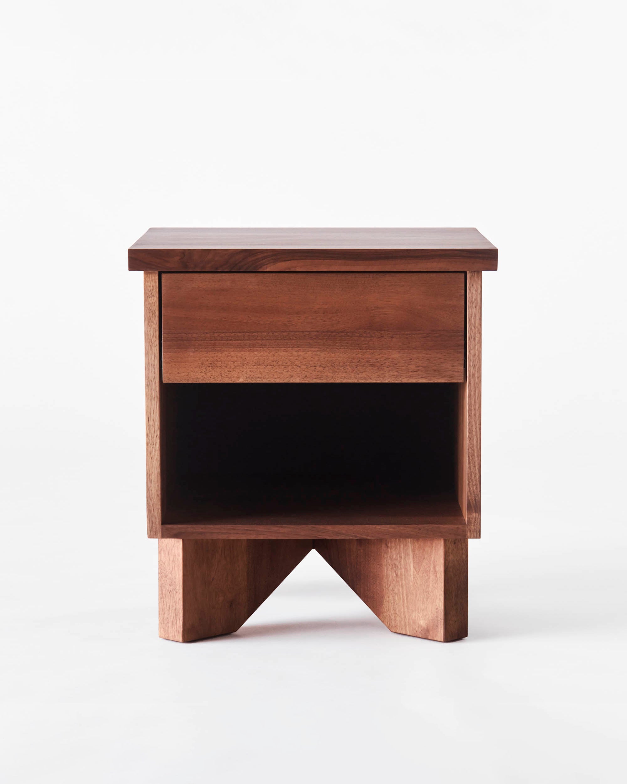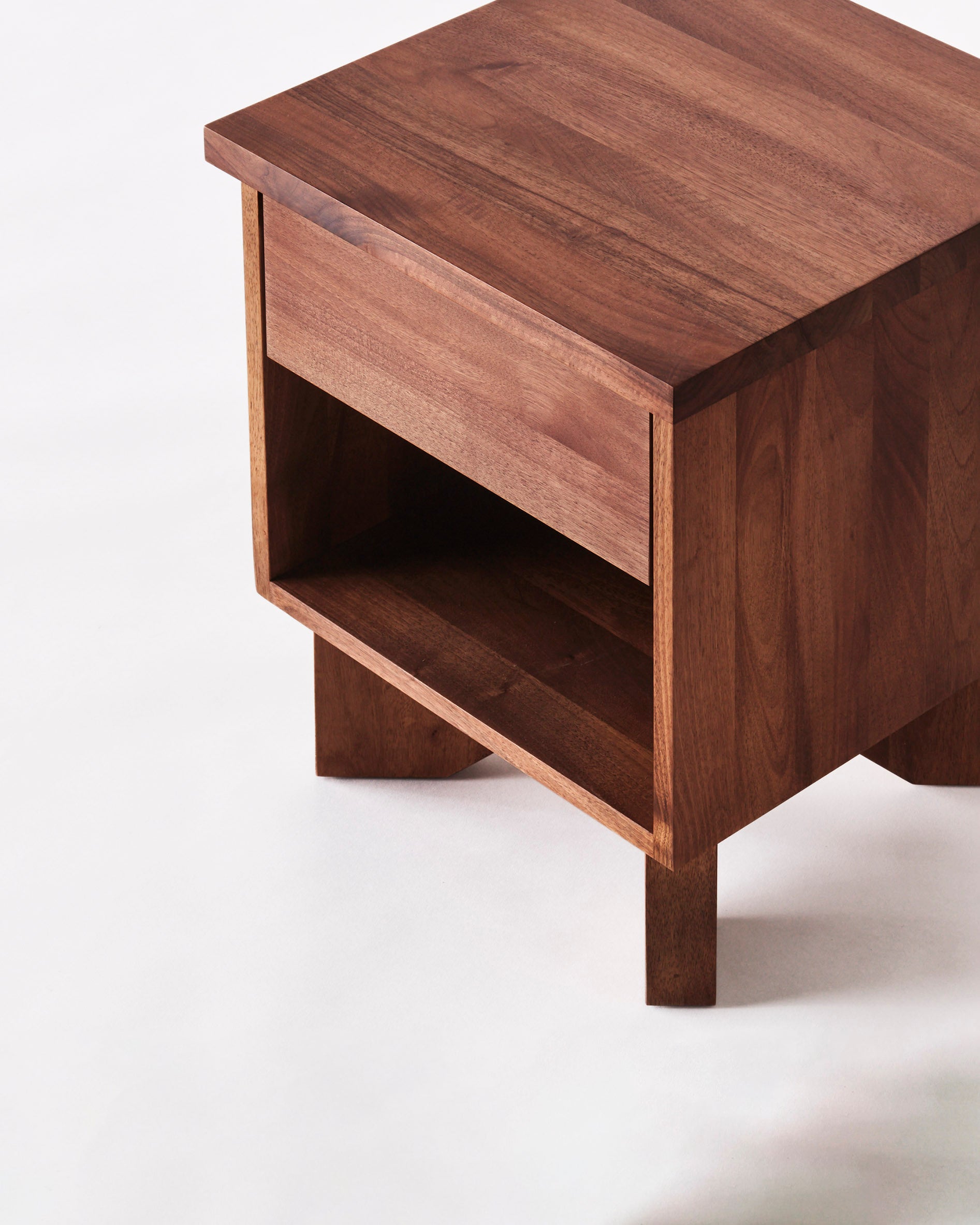 V Nattbord er et flerbruksbord laget av massiv valnøtt. Med mye oppbevaring er dette bordet like funksjonelt på soverommet ditt ved siden av en seng, som i stuen ved siden av en lenestol eller sofa. Nattbordet er beiset og oljet for å få en matt finish.