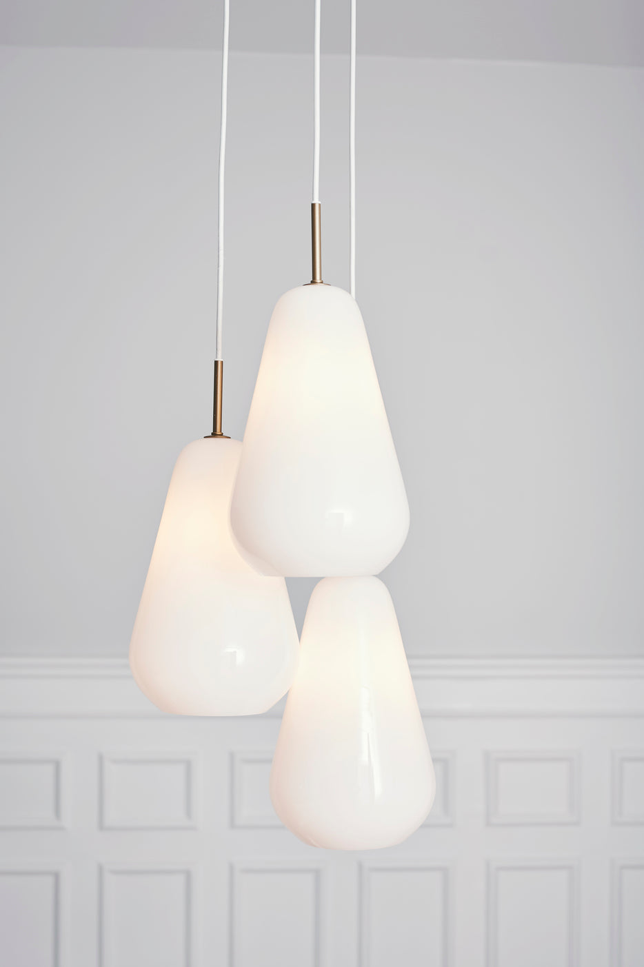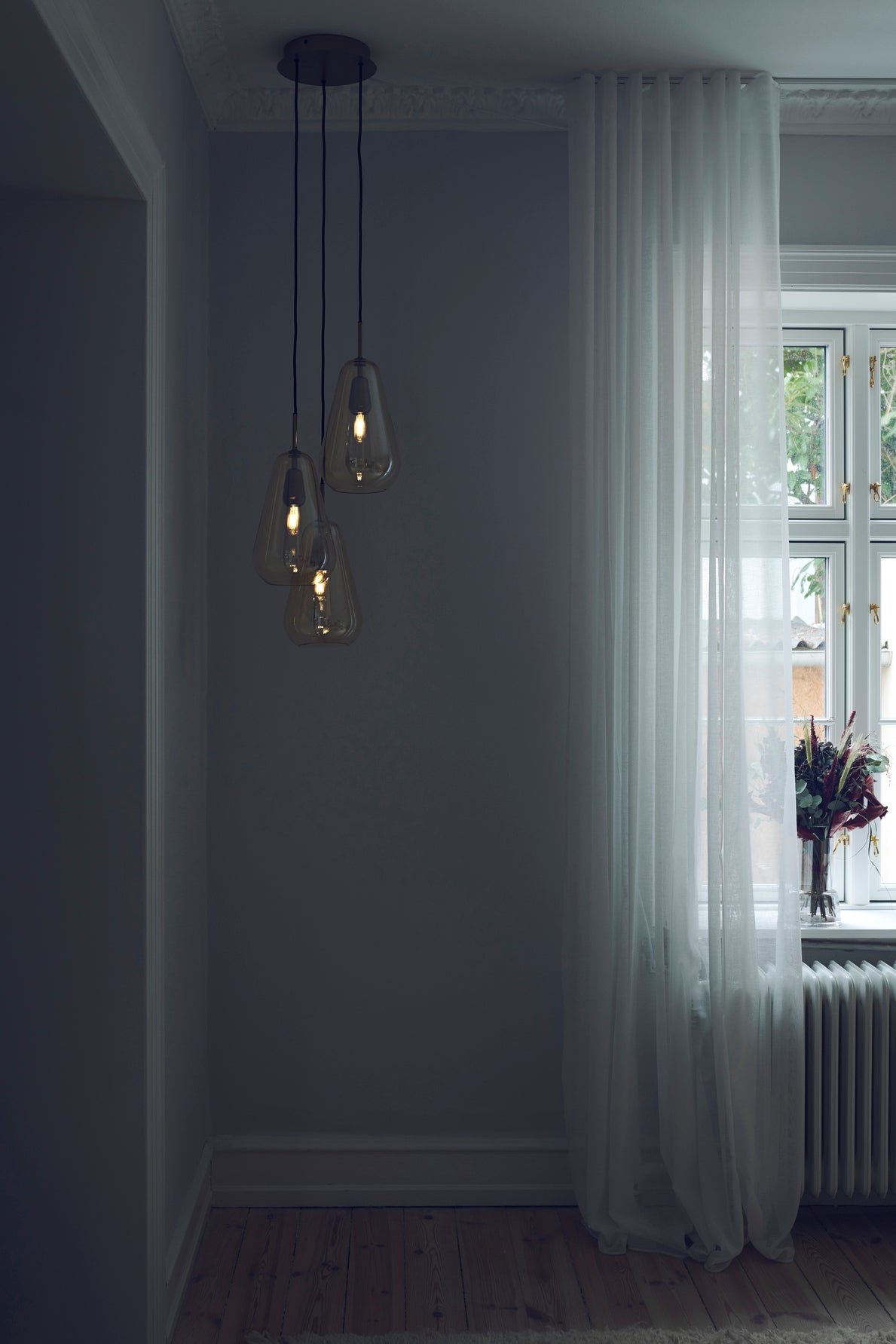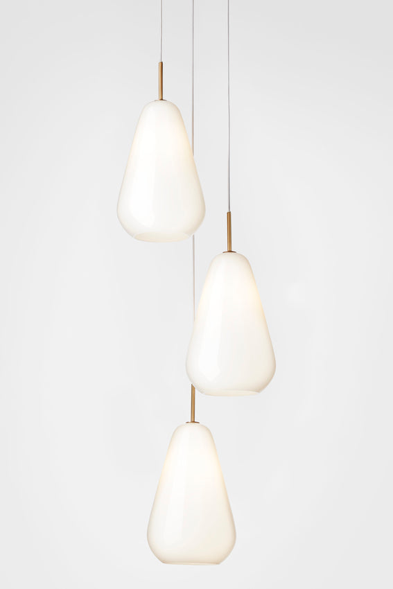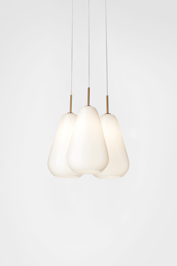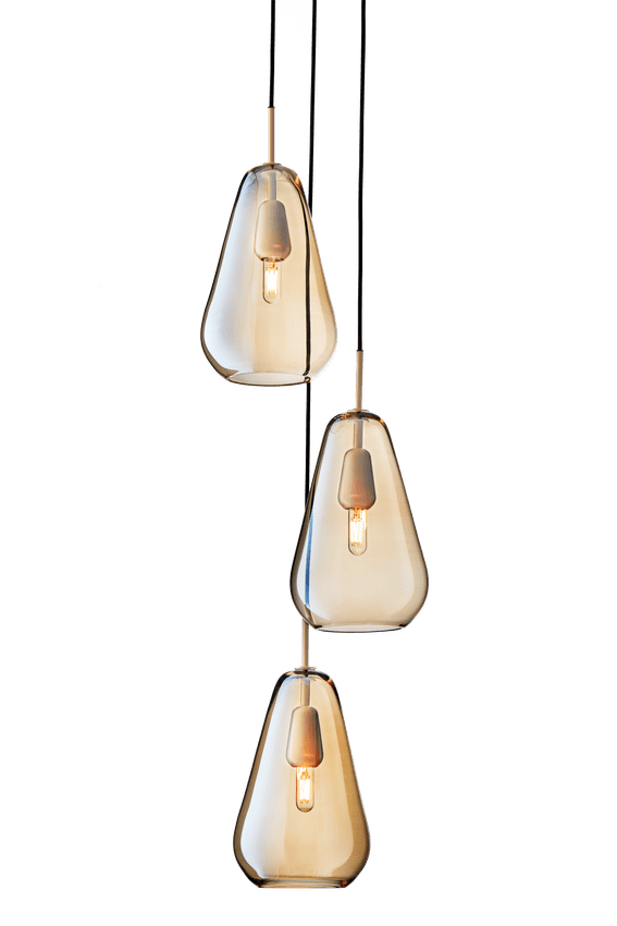 Anoli 3 taklampe er et klyngeanheng som består av 3 individuelle anheng. Med referanser til regndråper en høstdag tar skjermene form, som er laget av munnblåst glass og håndmalt med en gylden glans.