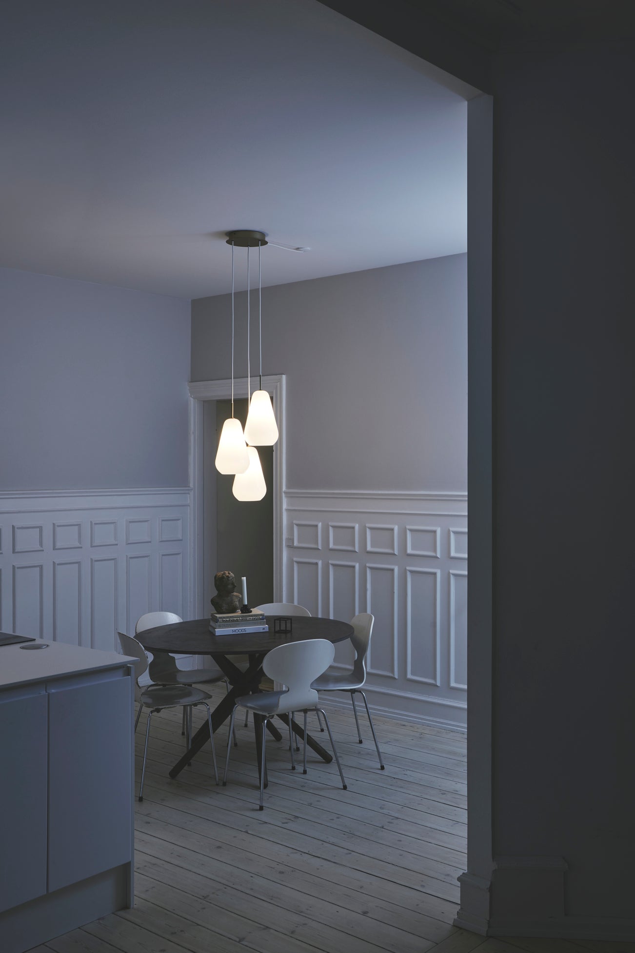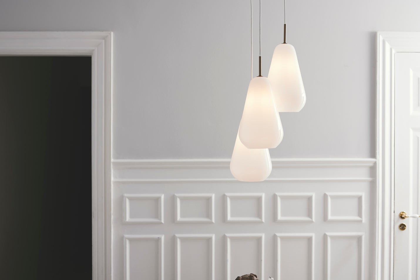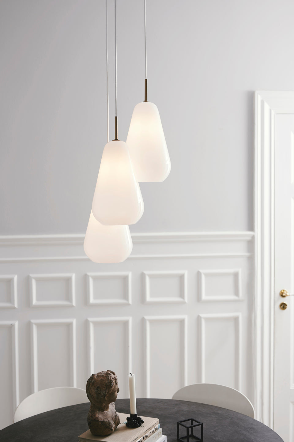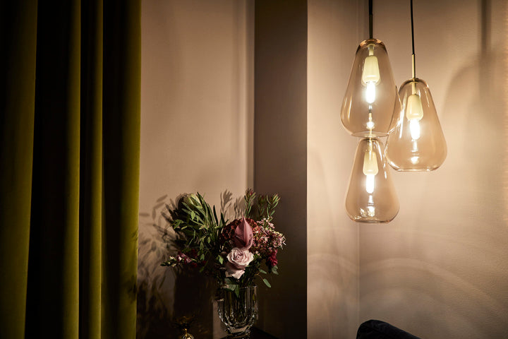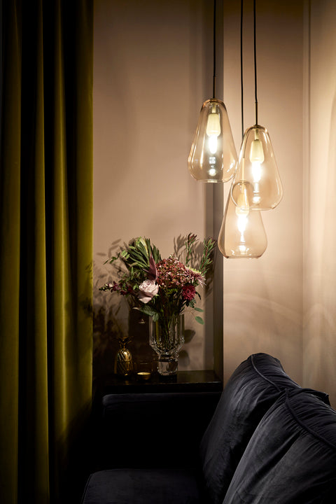 Gjennom glasset presenteres en sokkel i samme organiske dråpeform. Anoli 3 lampe  egner seg veldig godt som stemningsskapende belysning over sofa eller i hjørnet av en stue, eller over spisebordet.