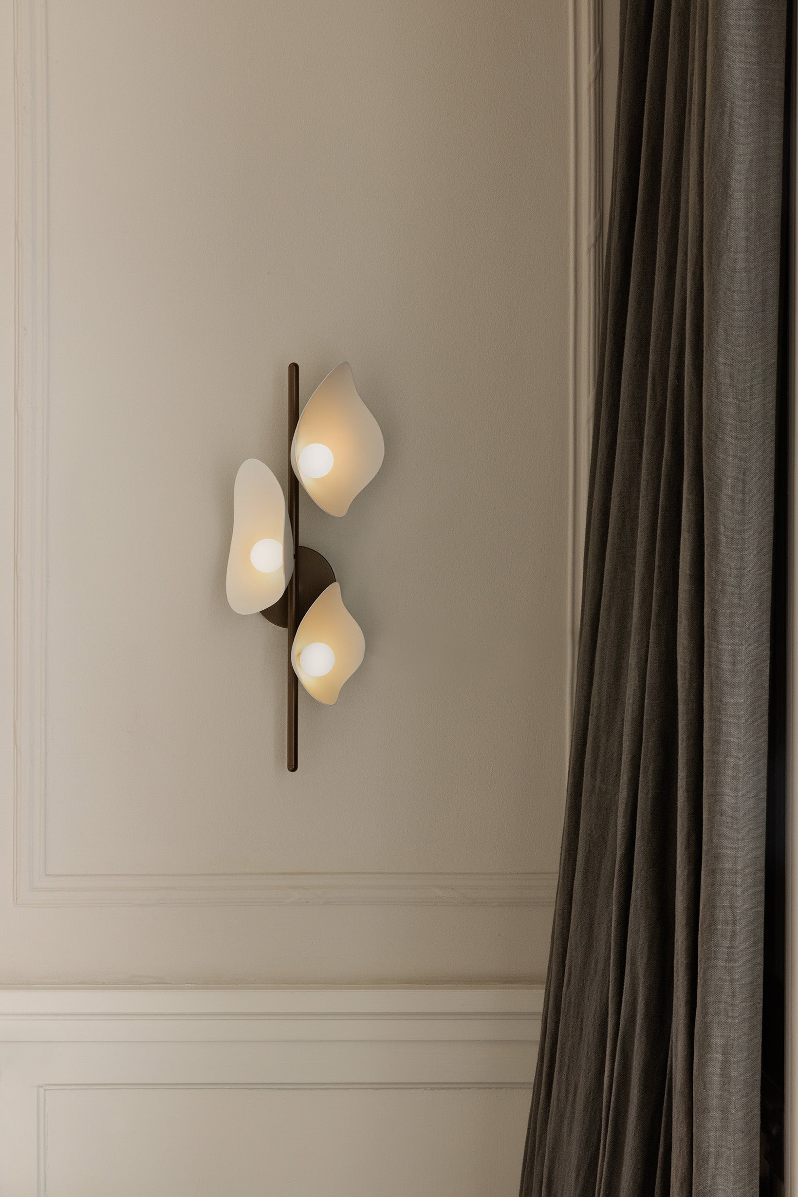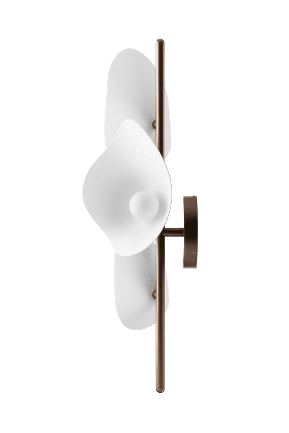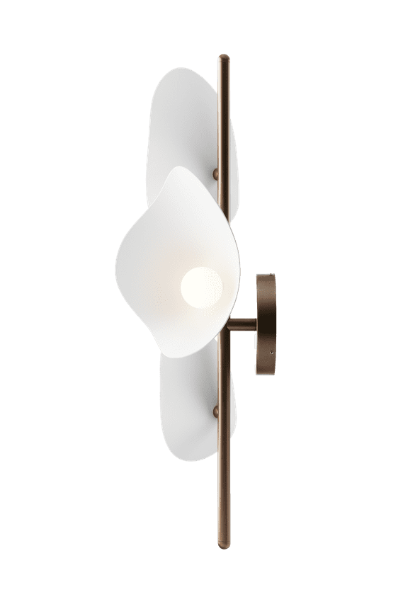 Florii 3 vegglampe er en langstrakt lampe som har et fantastisk design. Den lineære metallstangen i mørk bronse gir en dyp kontrast til de hvite metallnyansene, som utstråler en varm og innbydende glød.