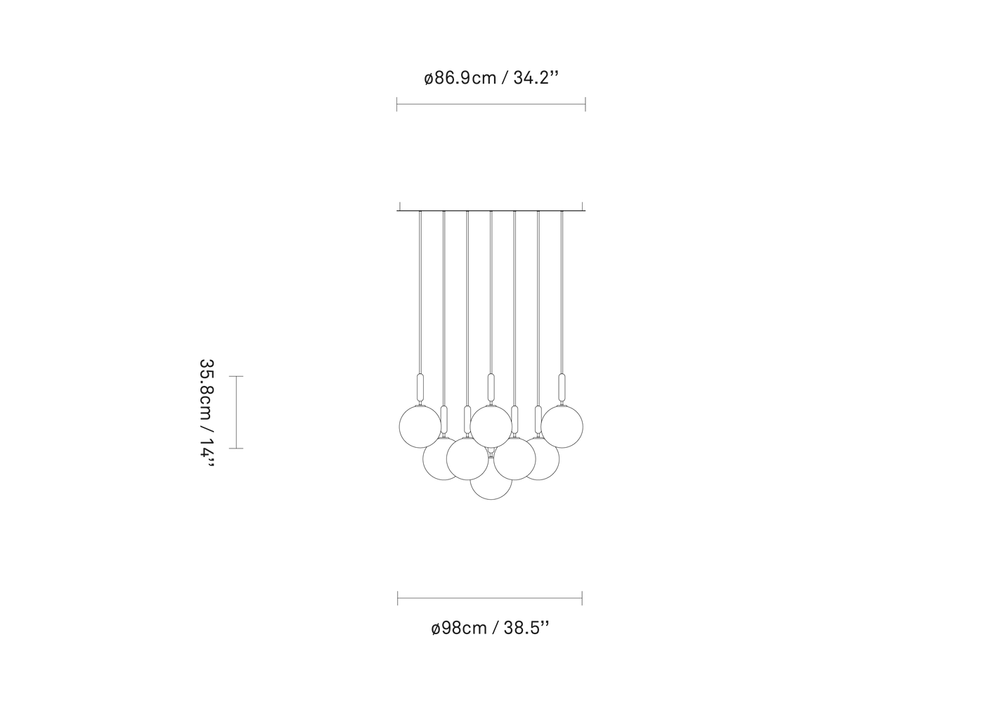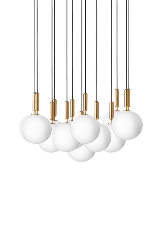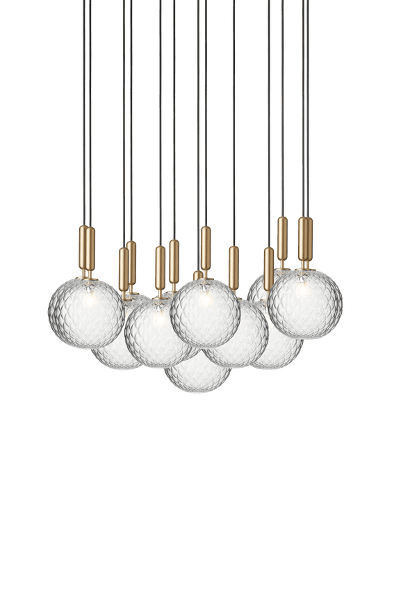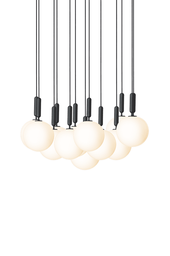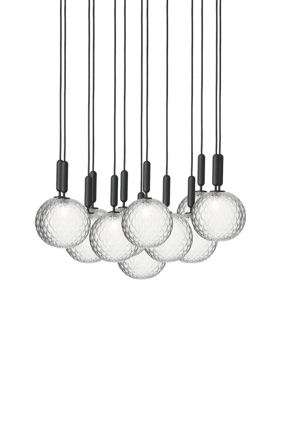 Miira 13 Large er en iøynefallende lysekrone som består av 13 individuelle anheng samlet i én stor takplate, hvorfra lysekroneformasjonen kommer til uttrykk. De 13 anhengene har vekt og fylde, og de store glasskulene gir et kraftigere utseende enn de lette og slanke anhengene fra standard Miira-serien.