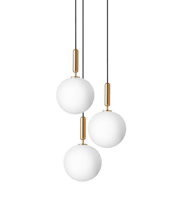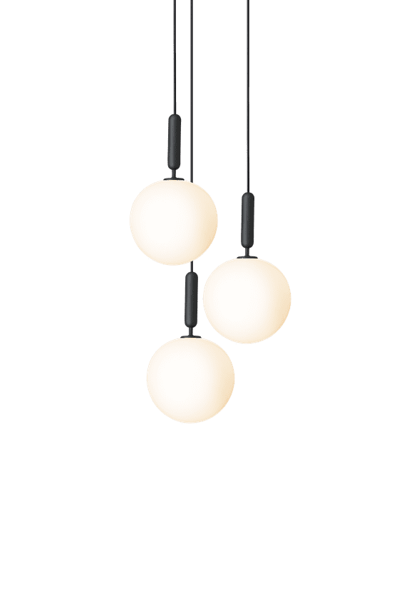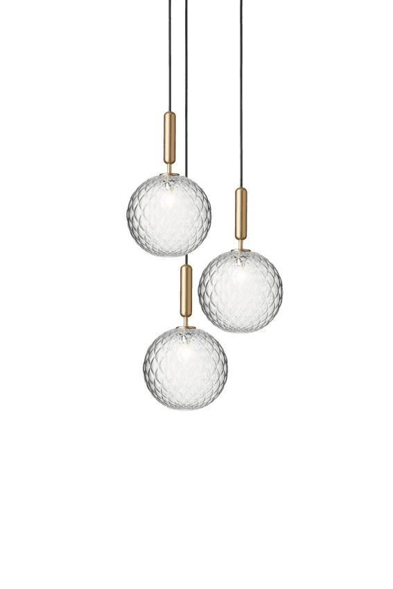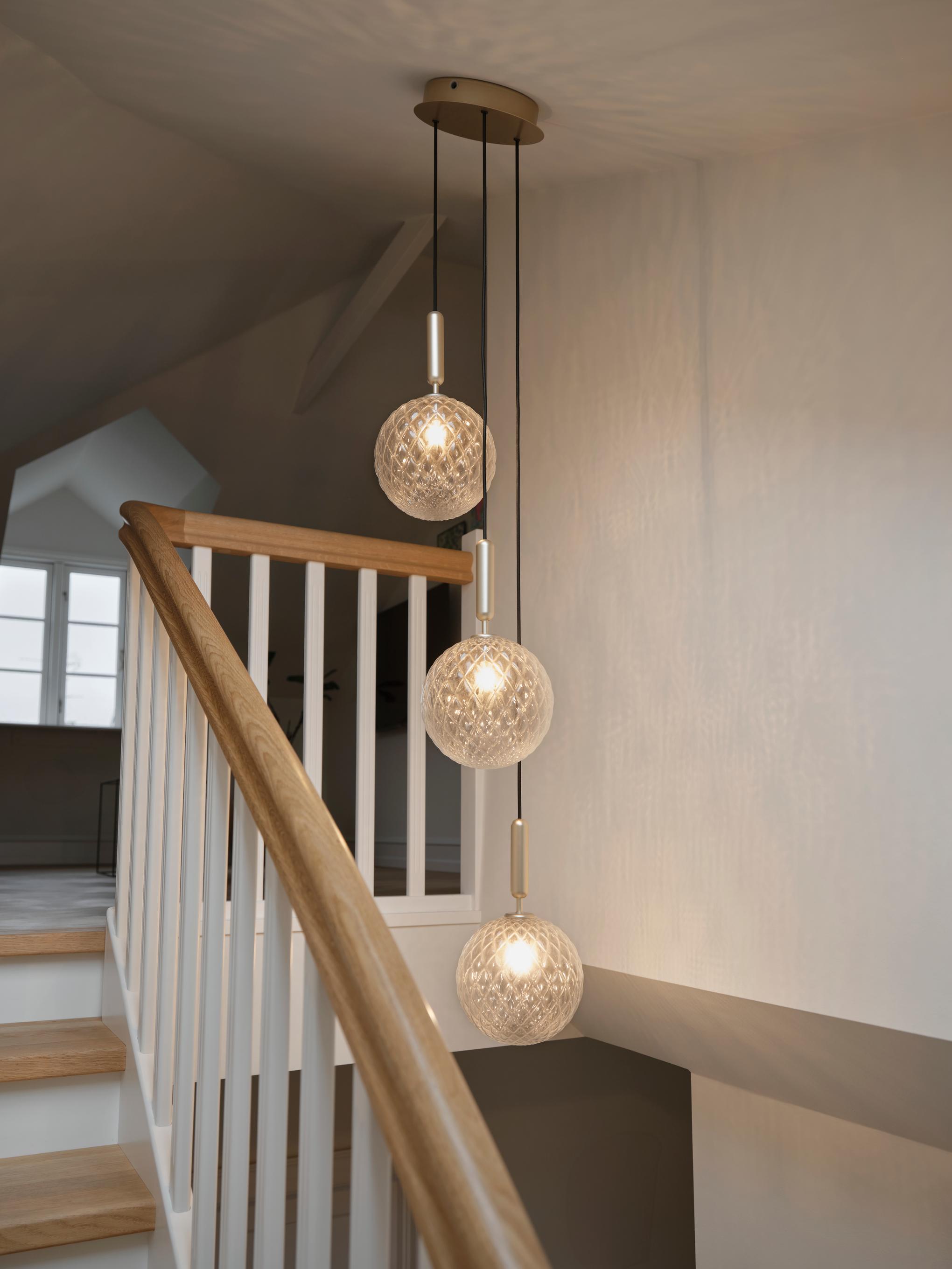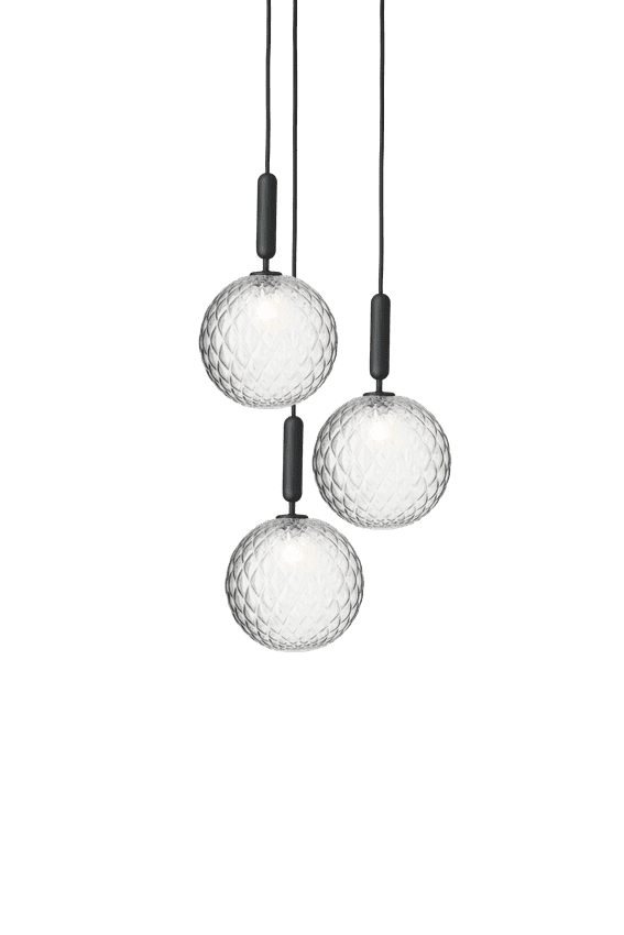 Miira 3 Large er en moderne lysekrone som består av 3 anheng i en multi-lys formasjon. De enkelte anhengene henger ned fra en rund takplate, og de slanke metallstengene og kraftige glasskulene får anhengene til å sprette opp i luften. Miira 3 Large lysekrone skaper en koselig atmosfære med sitt behagelige lys.