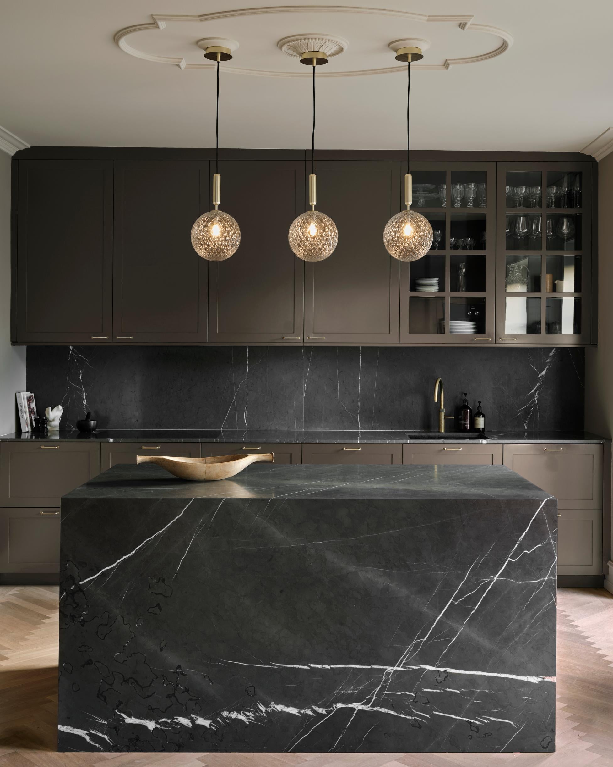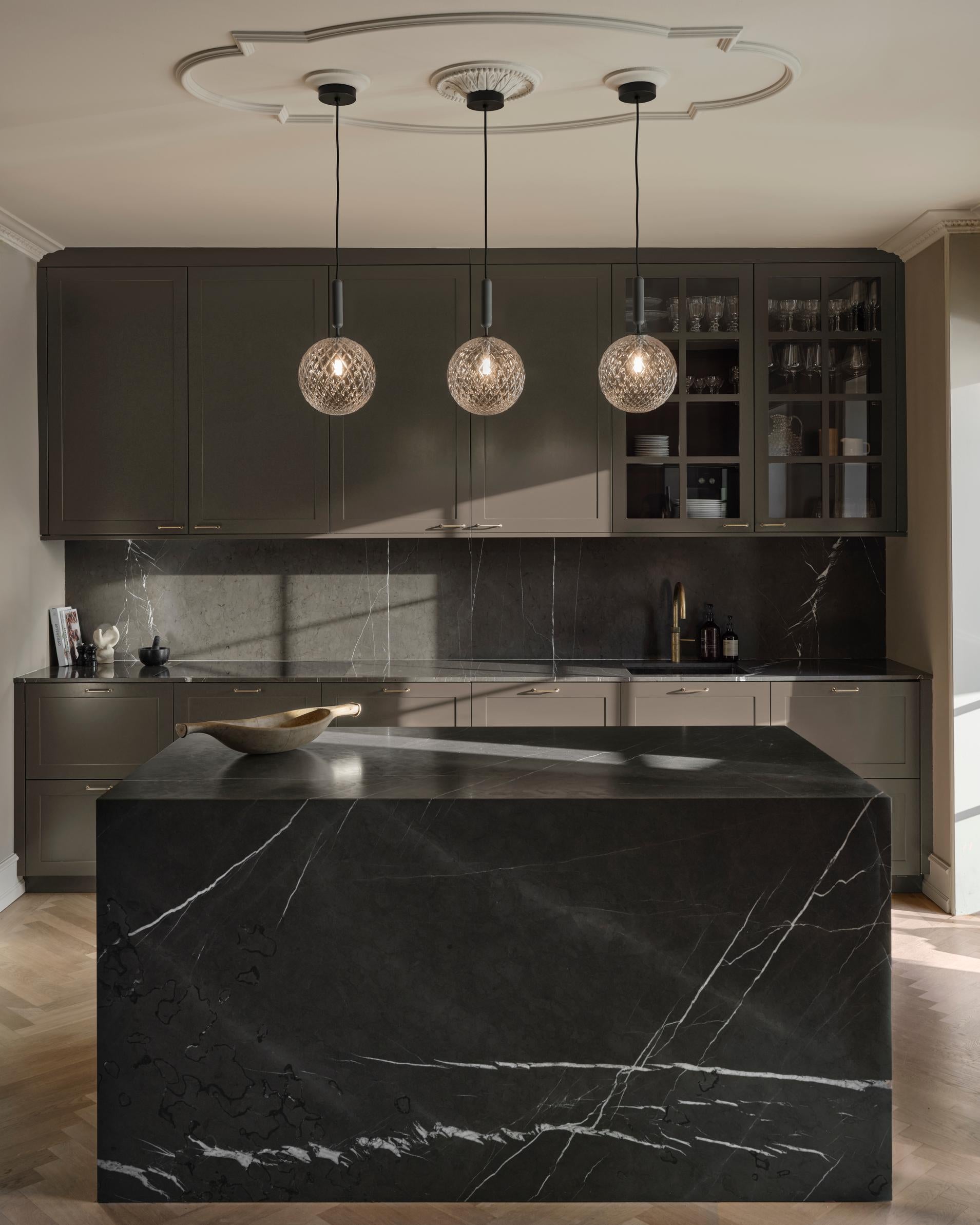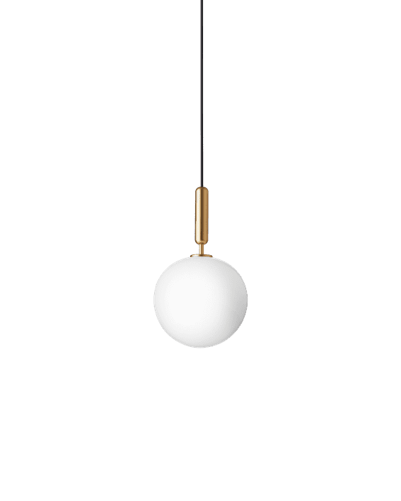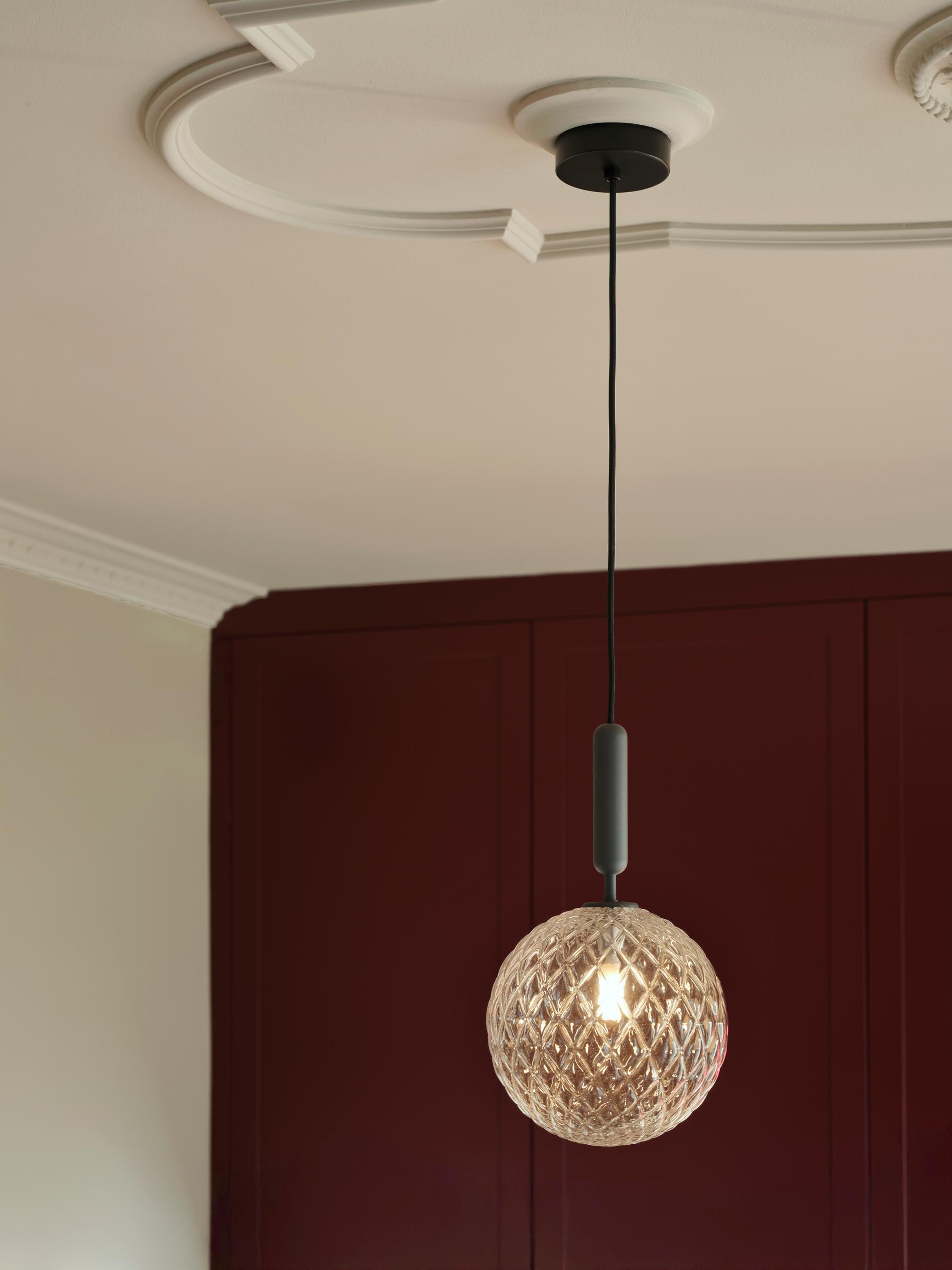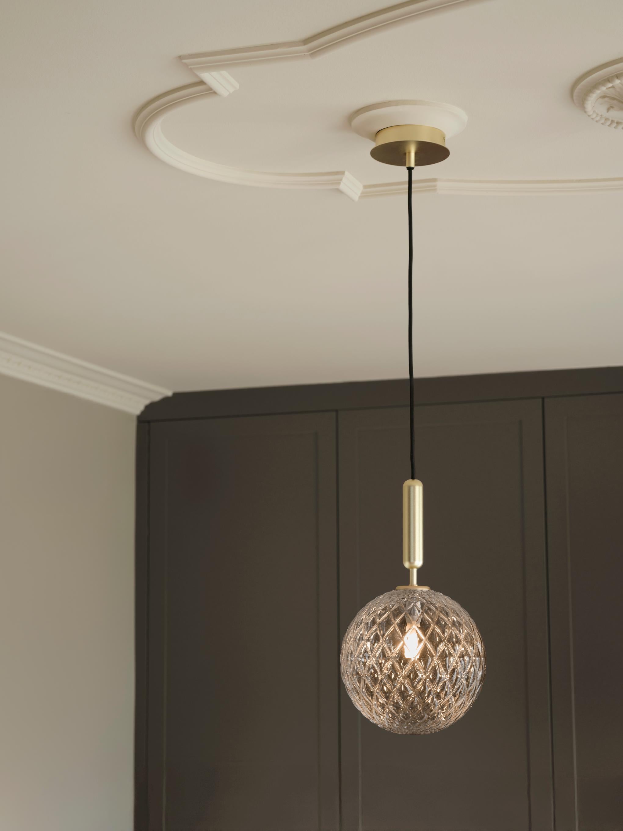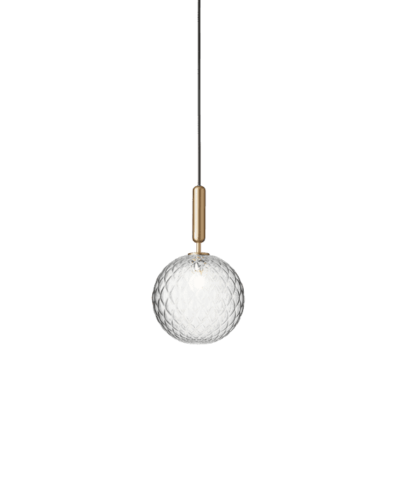 Miira 1 er et allsidig anheng med en messing/metall konstruksjon og en gjennomsiktig glassskjerm med et preget mønster. Den fargede finishen gir et mykt, reflekterende preg, mens det klare optiske glasset skaper et lekent lys.