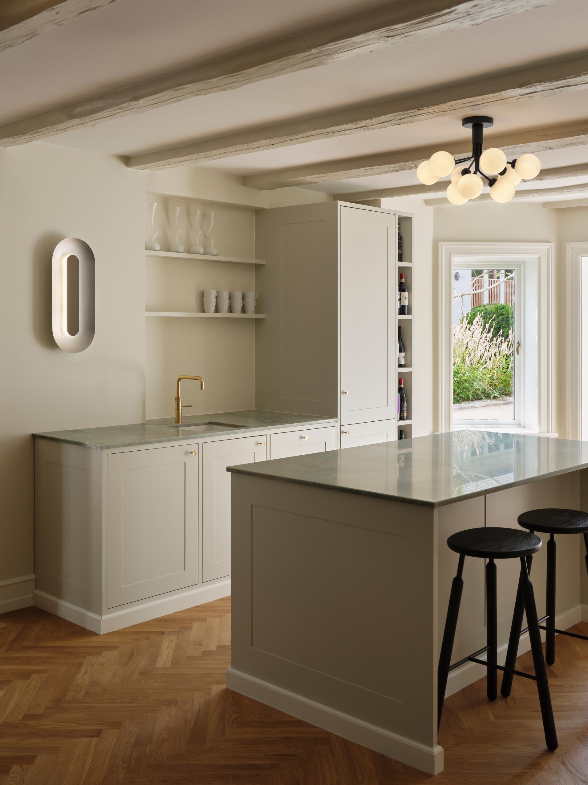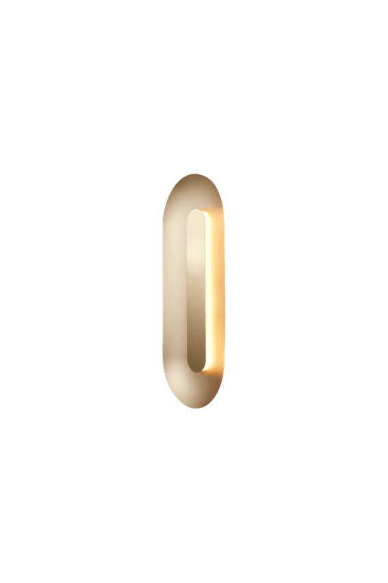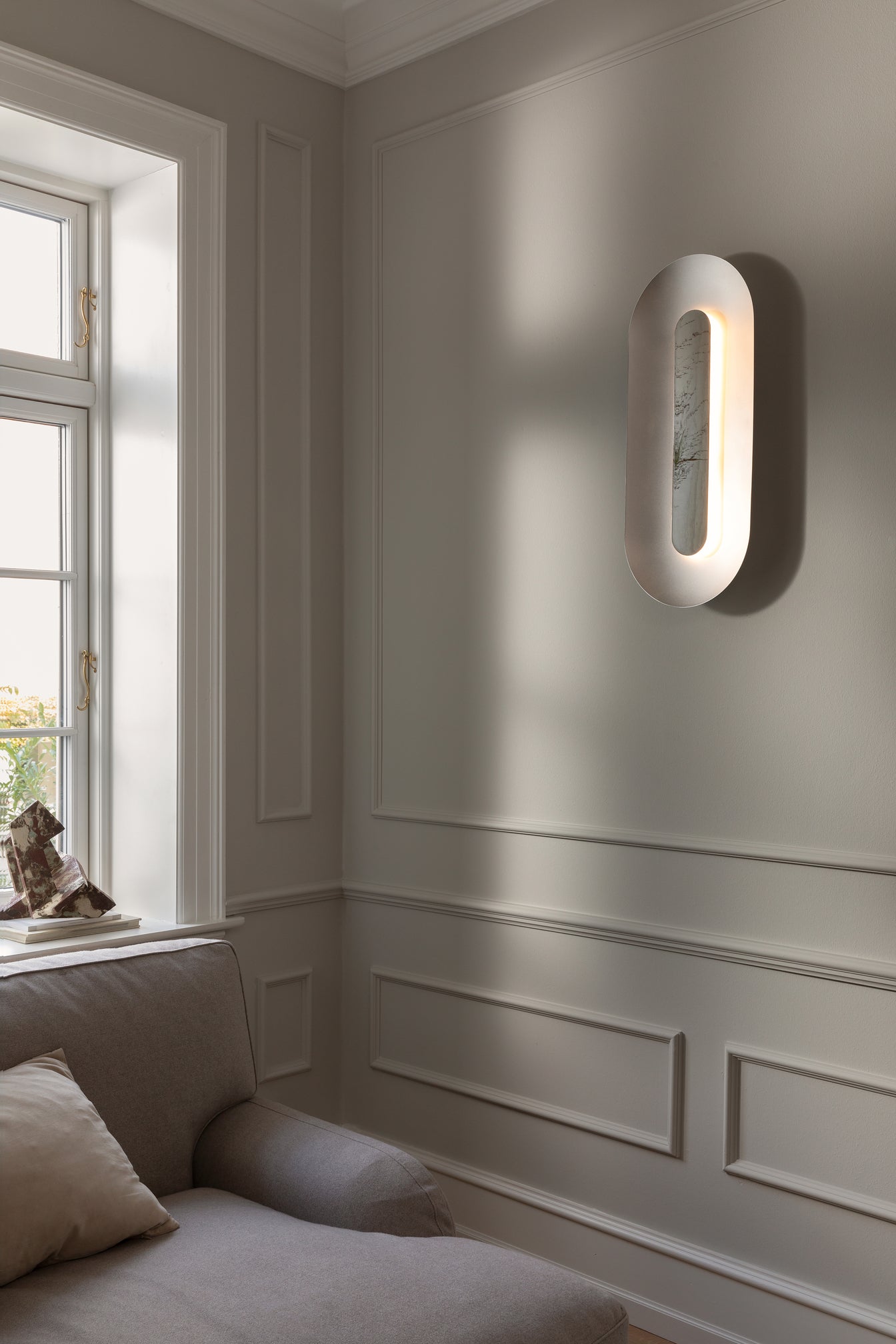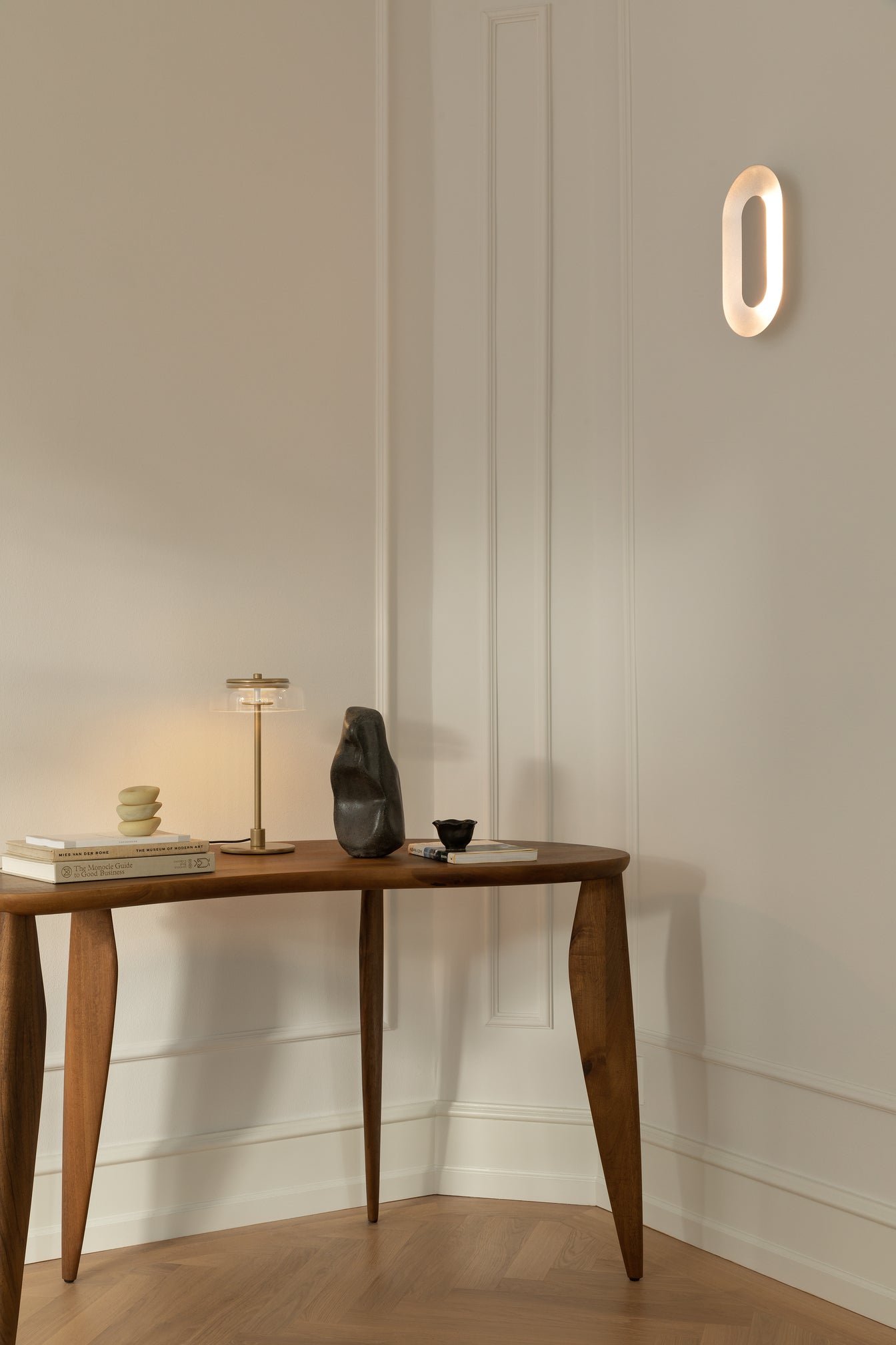 Sasi Small er en dekorativ vegglampe designet med øye for mykt design, en harmonisk fargepalett og nøye utvalgte materialer. Lampen består av en oval skjerm i anodisert aluminium, og en mindre form med speileffekt er plassert i midten. Den blanke skjermen skjuler den integrerte LED-modulen, som sprer og reflekterer et dekorativt lys. Sasi Small vegglampen kan brukes som veggdekorasjon over det lille konsollbordet i hjørnet, hvor Sasi fungerer som en skulptur i interiøret når lampen er slått av.