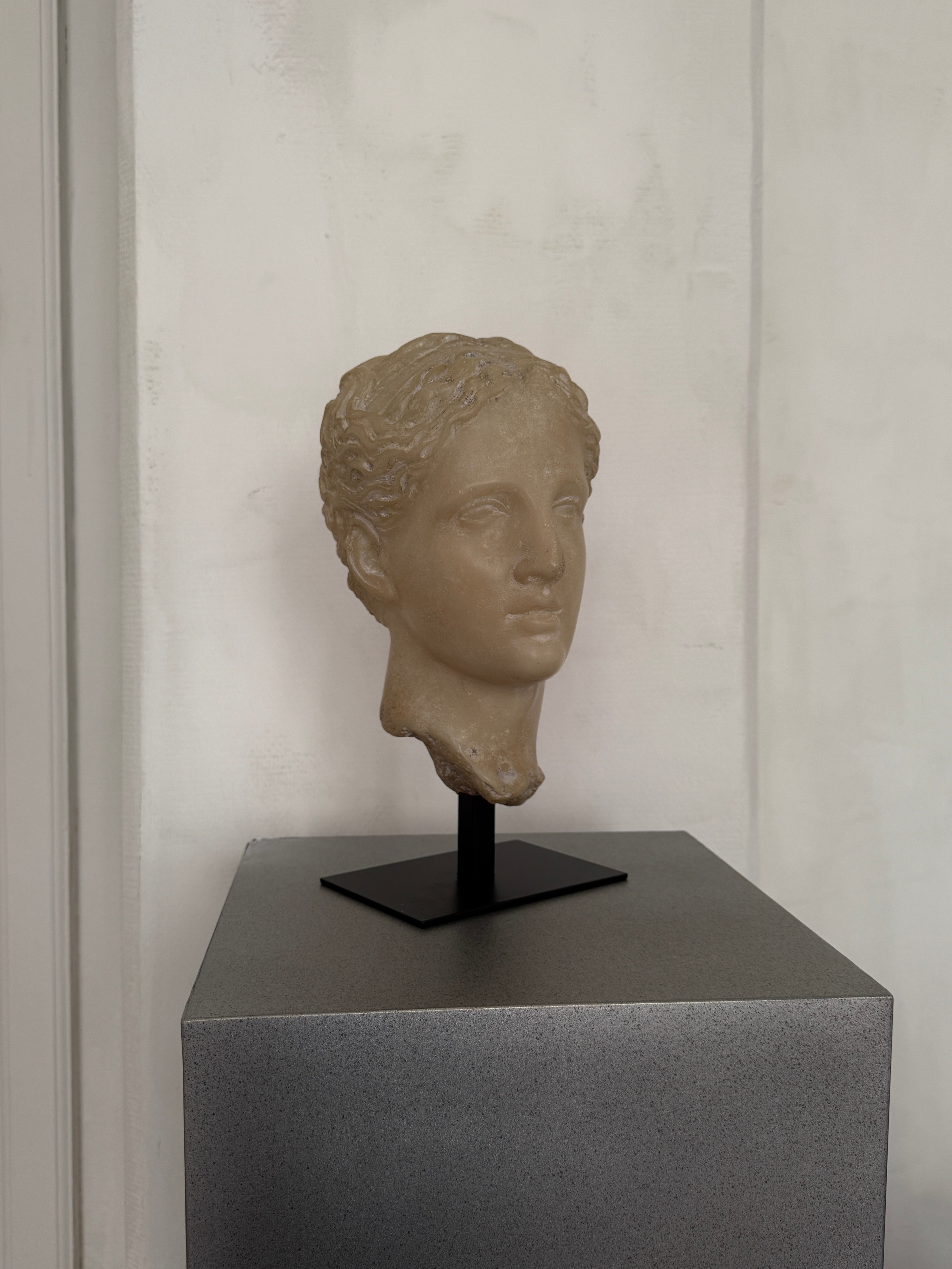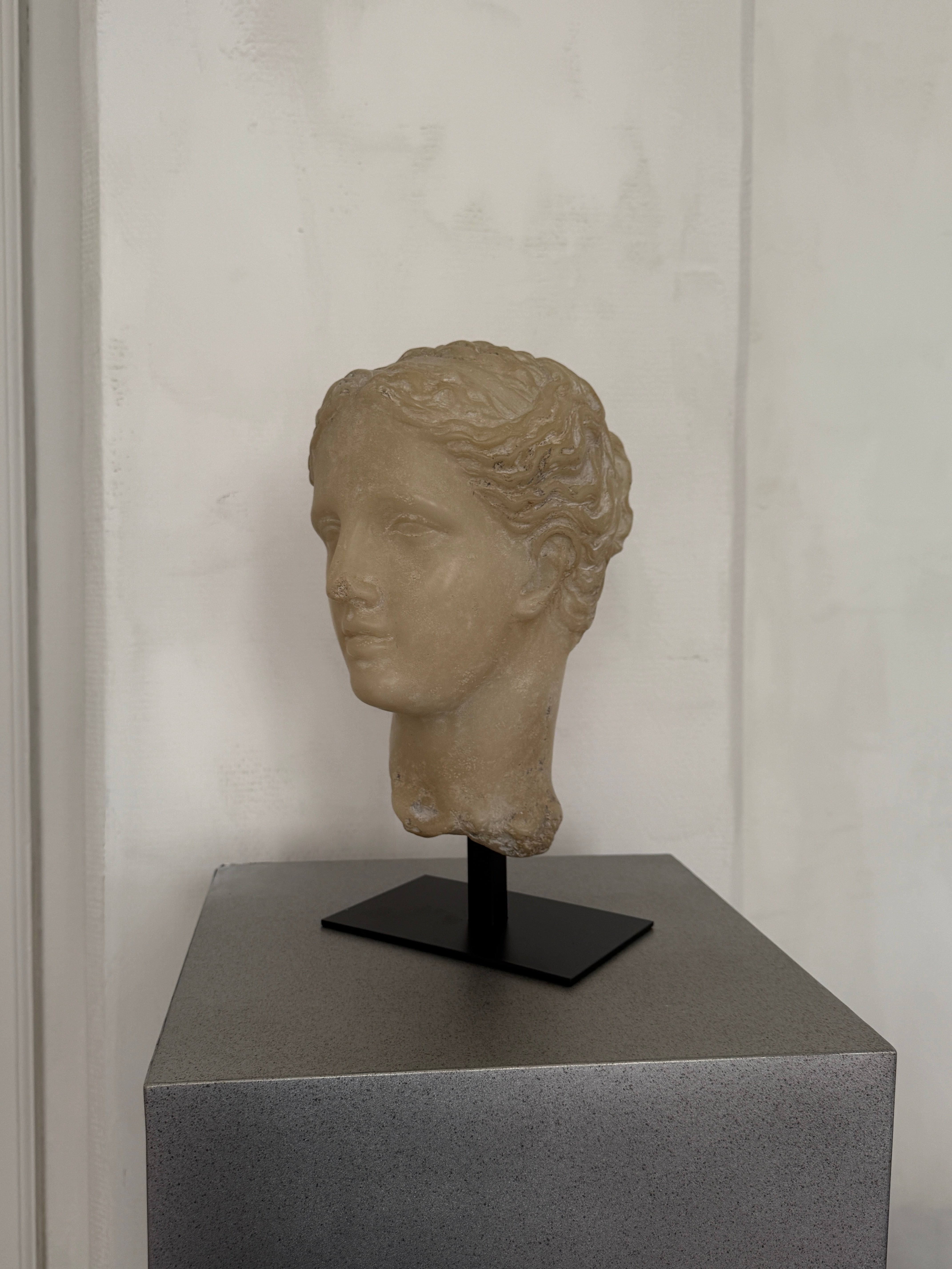 Med sitt uttrykksfulle blikk og subtile detaljer representerer denne bysten det klassiske skjønnhetsidealet – et symbol på kjærlighet, femininitet og kunstnerisk perfeksjon. Den er elegant montert på et sort metallstativ, som gir en moderne kontrast til det antikke uttrykket.