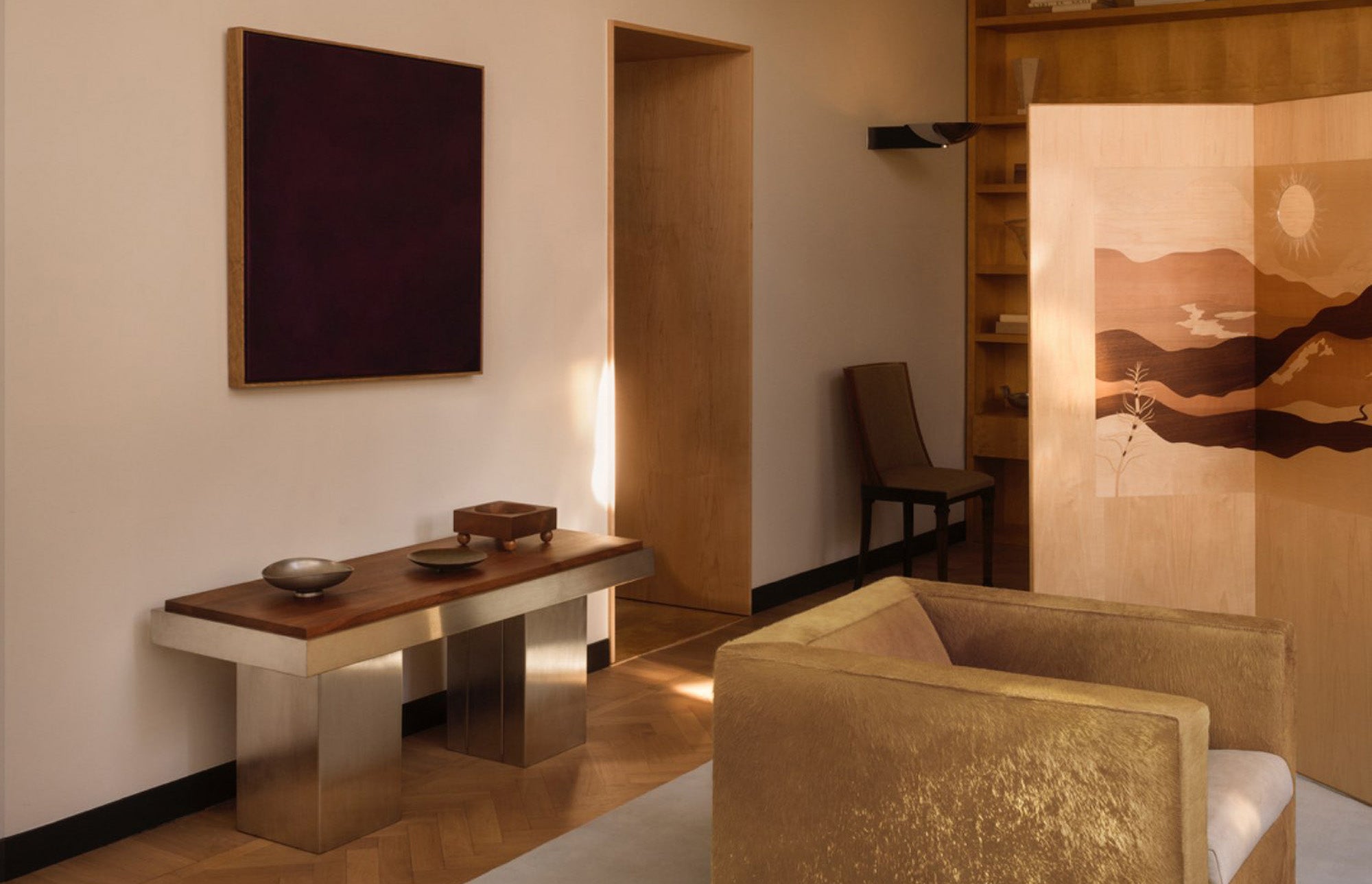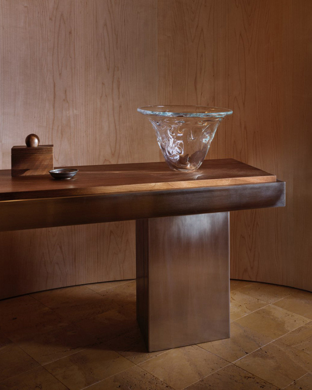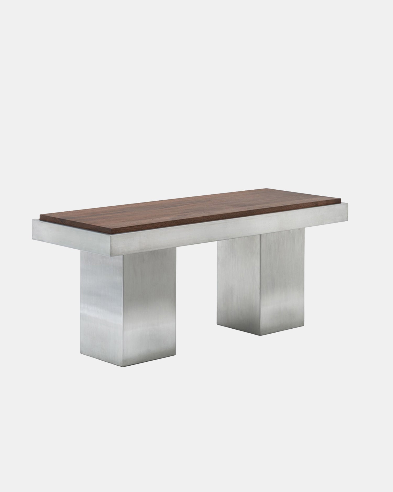 Console Table Low fra Studio Vraco er et minimalistisk konsollbord med rene, geometriske linjer inspirert av Bauhaus. Designet kombinerer et slankt understell i børstet rustfritt stål med en solid bordplate i enten travertin eller valnøtt, noe som gir en balansert kontrast mellom det industrielle og det naturlige.