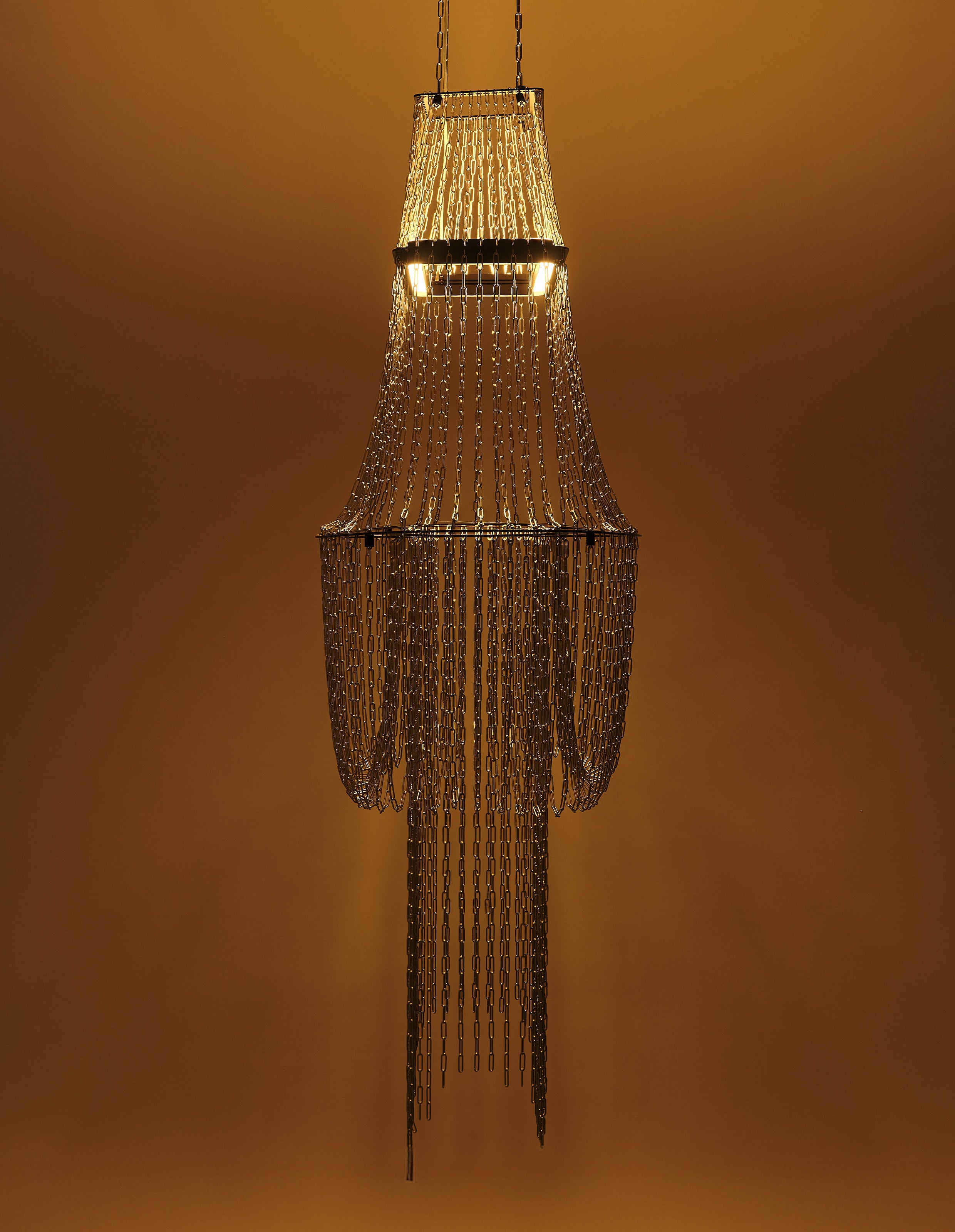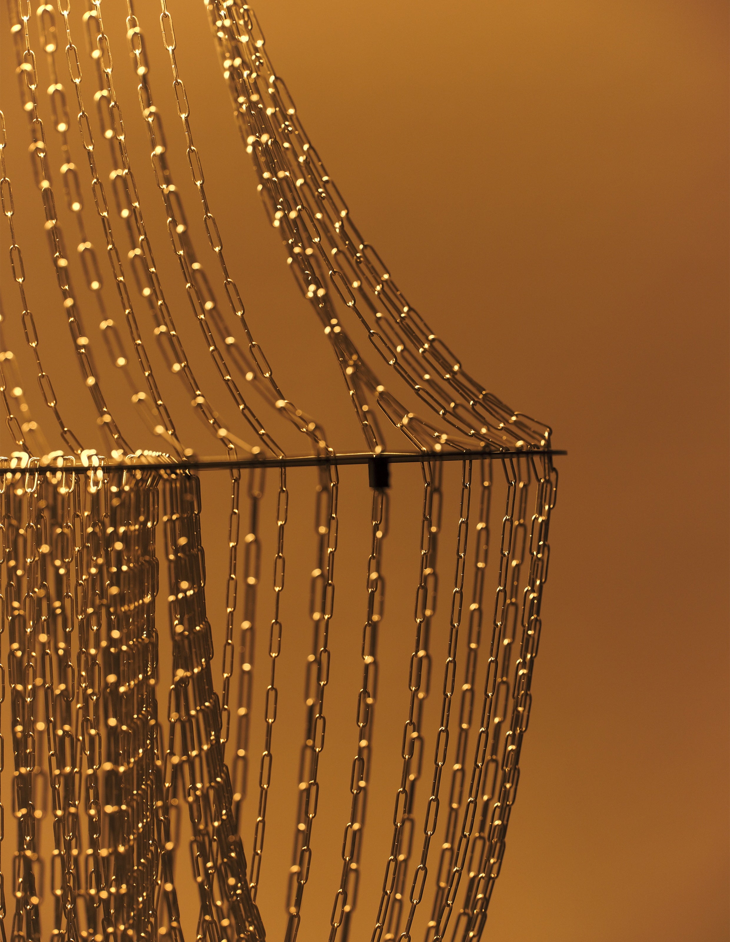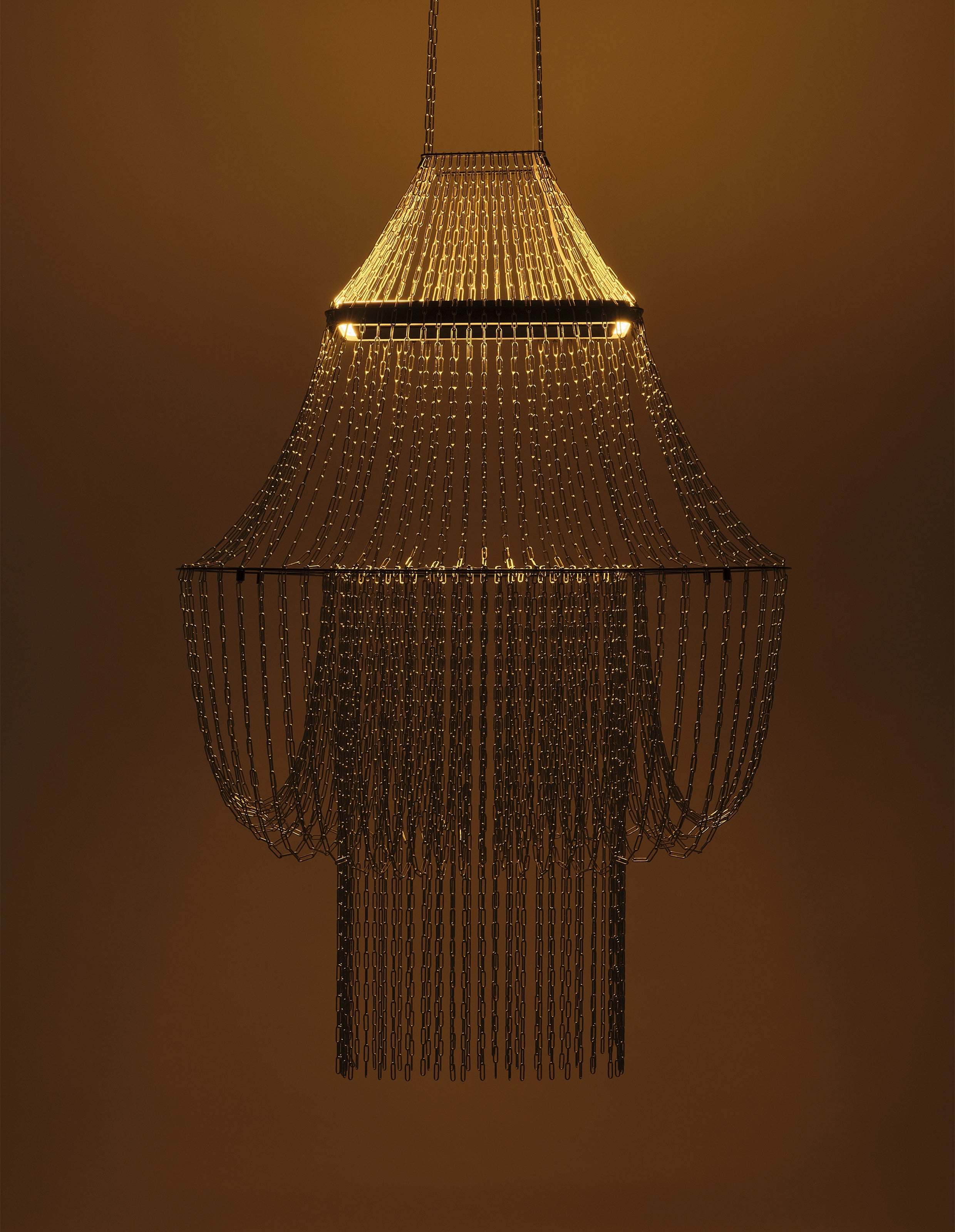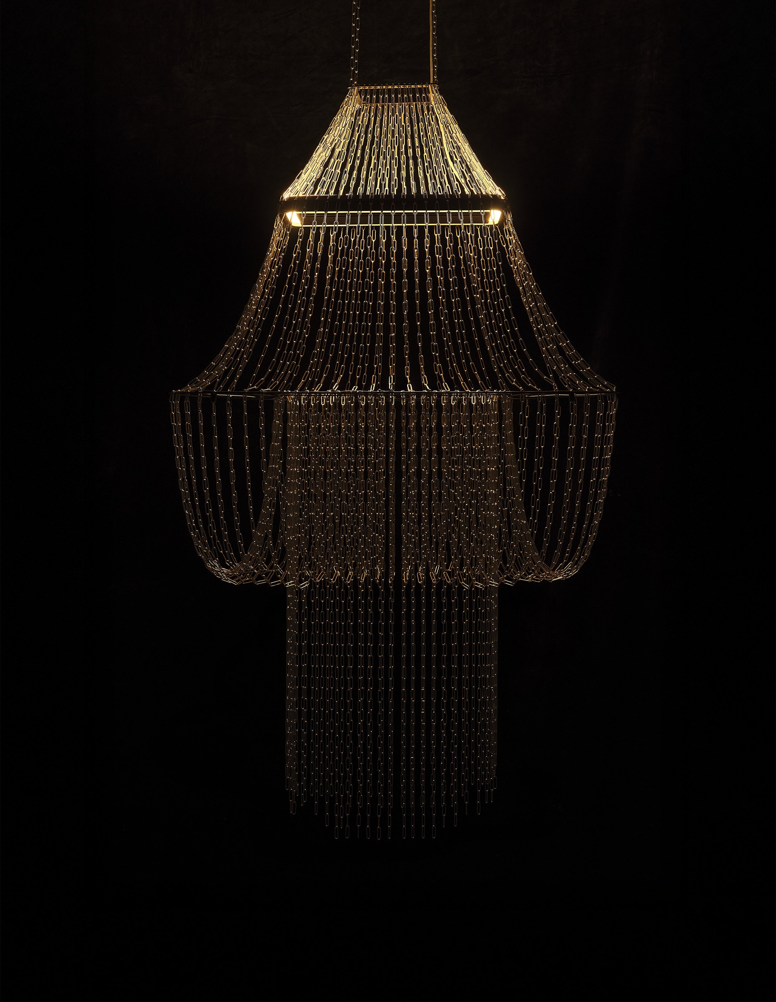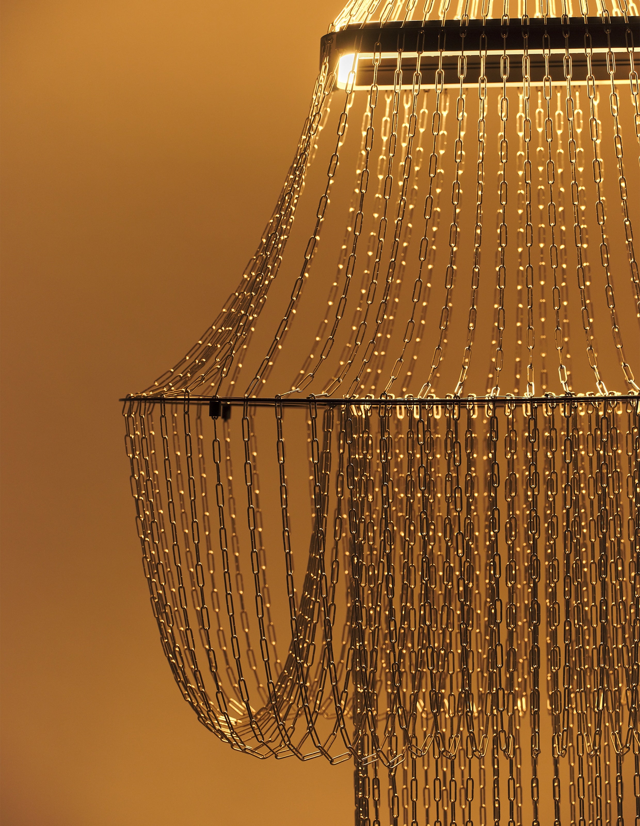 Sammensatt av 6400 lenker i rustfritt stål, fanger den opp lys uten behov for glass eller krystall. Hver kjede blir et resonanspunkt, og reflekterer lysdråper med en nesten flytende subtilitet. Inspirert av tomrommet like mye som av materie, spiller denne monumentale fjæringen på gjennomsiktighet, bevegelse og letthet. Lyset moduleres av to uavhengige, dimbare kretser, opptil 7000 lumen i 2400K, for kraftig, men poetisk belysning.