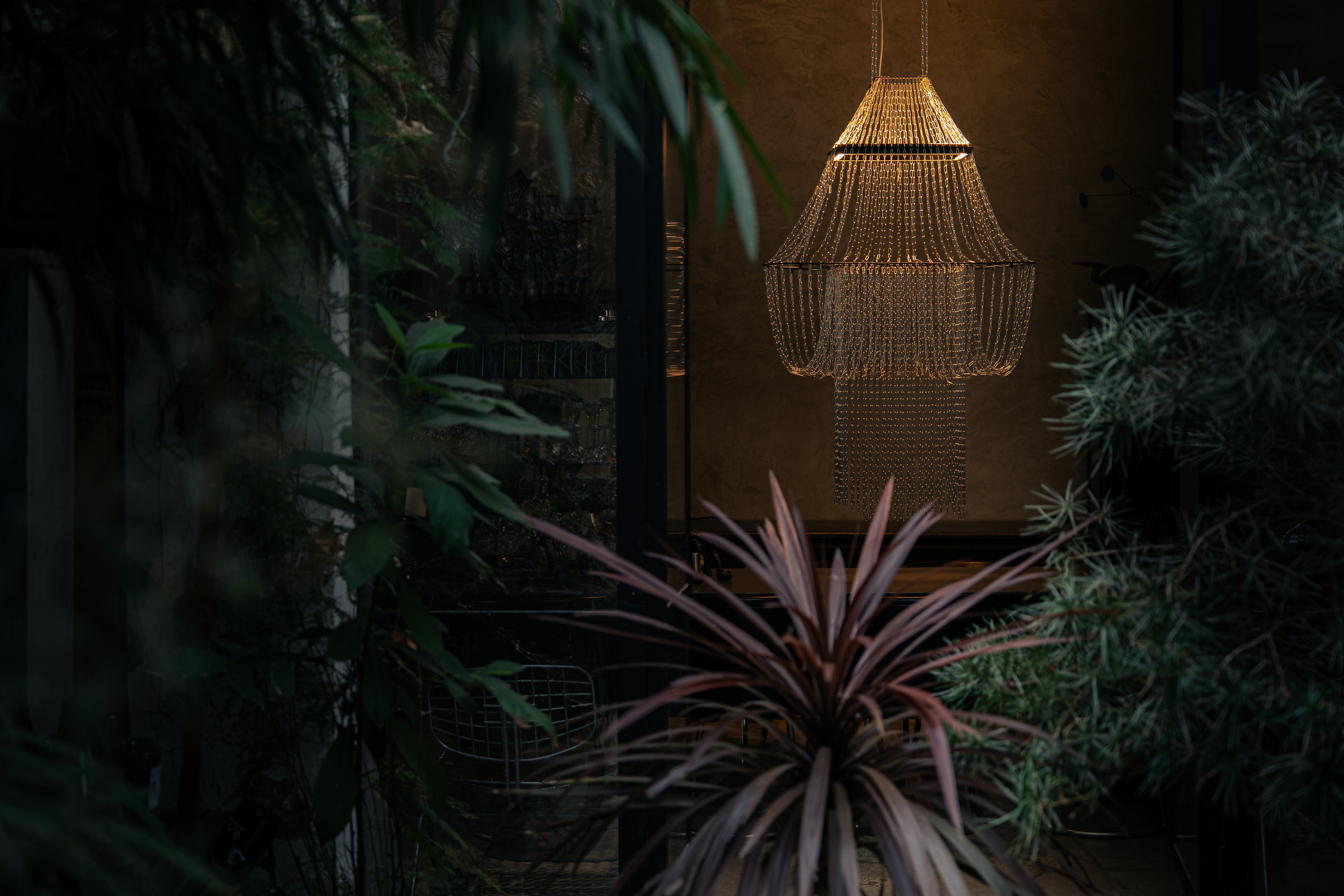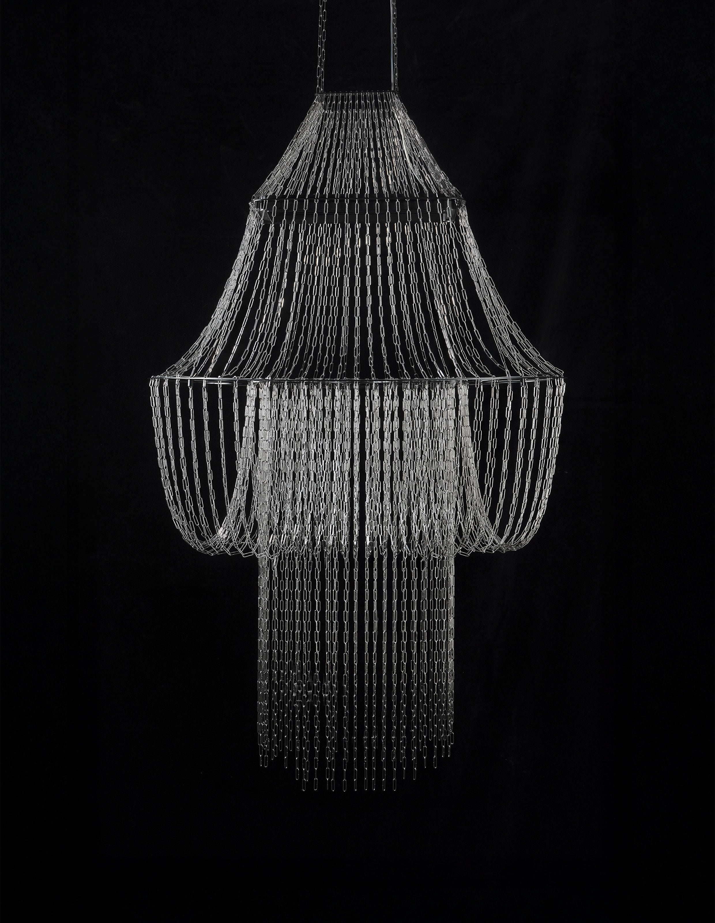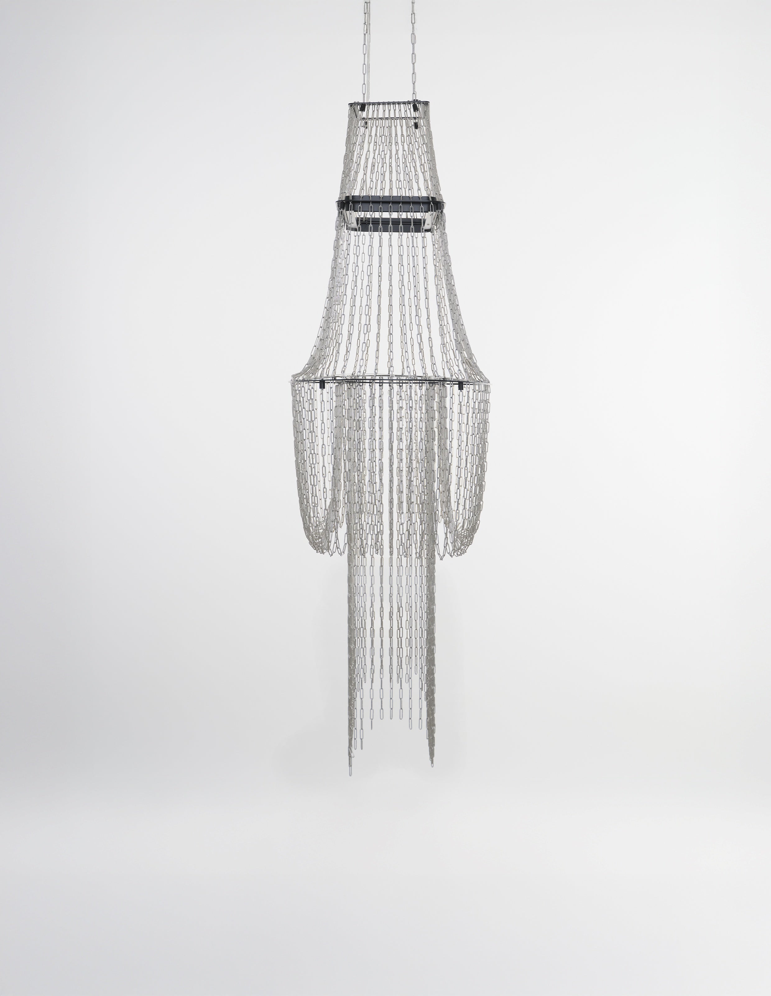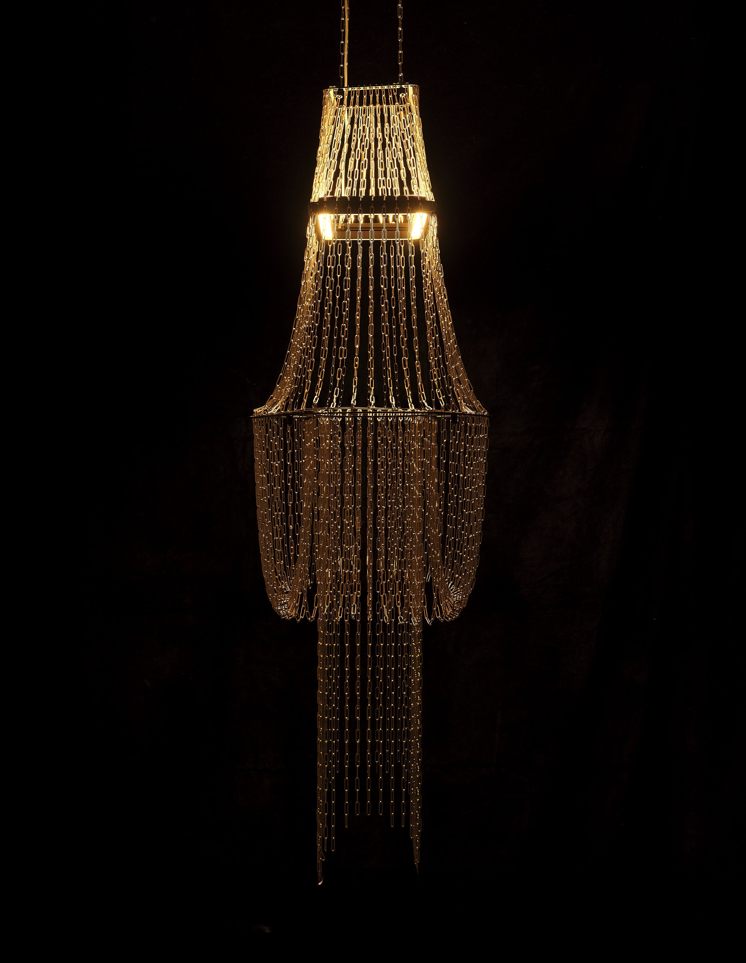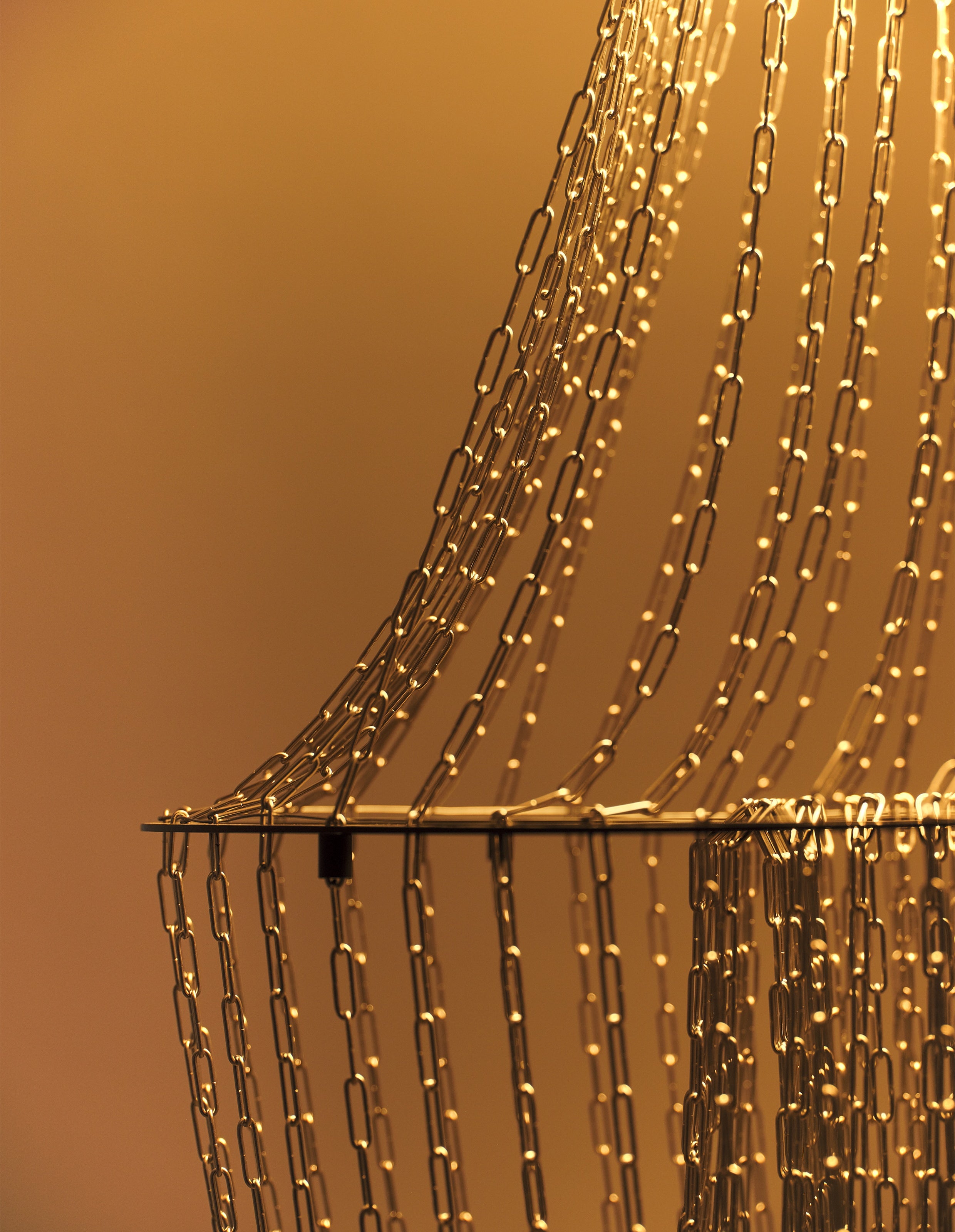 Sammensatt av 6400 lenker i rustfritt stål, fanger den opp lys uten behov for glass eller krystall. Hver kjede blir et resonanspunkt, og reflekterer lysdråper med en nesten flytende subtilitet. Inspirert av tomrommet like mye som av materie, spiller denne monumentale fjæringen på gjennomsiktighet, bevegelse og letthet. Lyset moduleres av to uavhengige, dimbare kretser, opptil 7000 lumen i 2400K, for kraftig, men poetisk belysning.