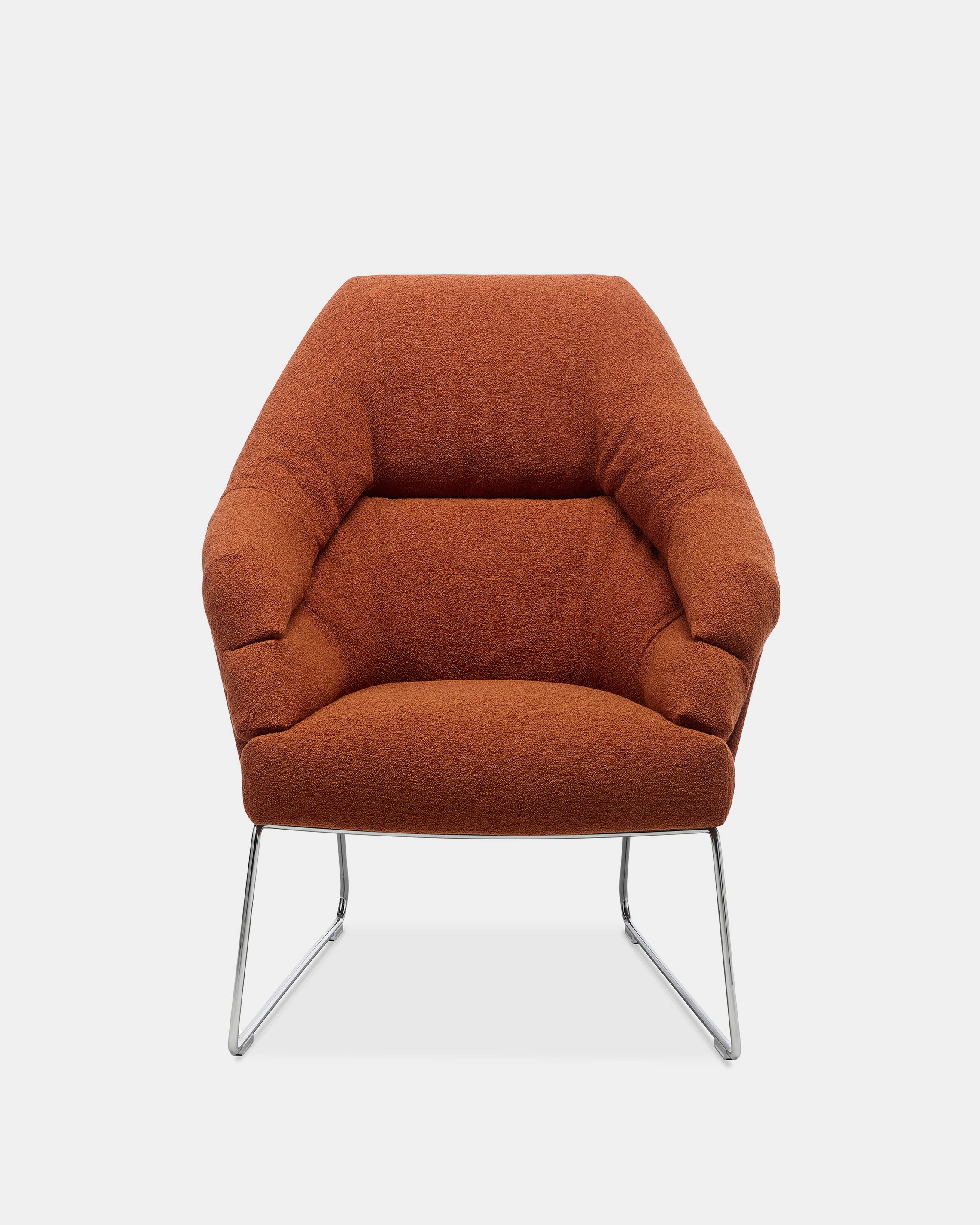 Polstringen er raffinert og moderne, med et visuelt spill mellom kontur og volum. Den vendbare kragen som hviler over ryggstøtten tilfører en subtil letthet og femininitet, og kan enkelt roteres for å skape personlige fargekombinasjoner – en elegant detalj som lar deg tilpasse stolen etter både rom og stemning.