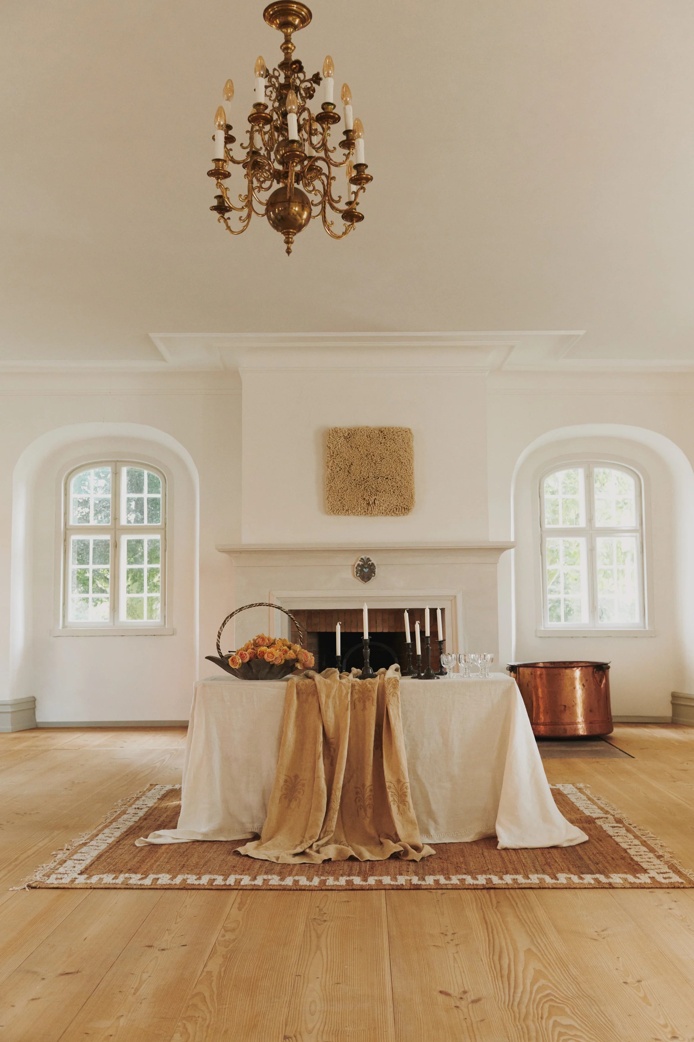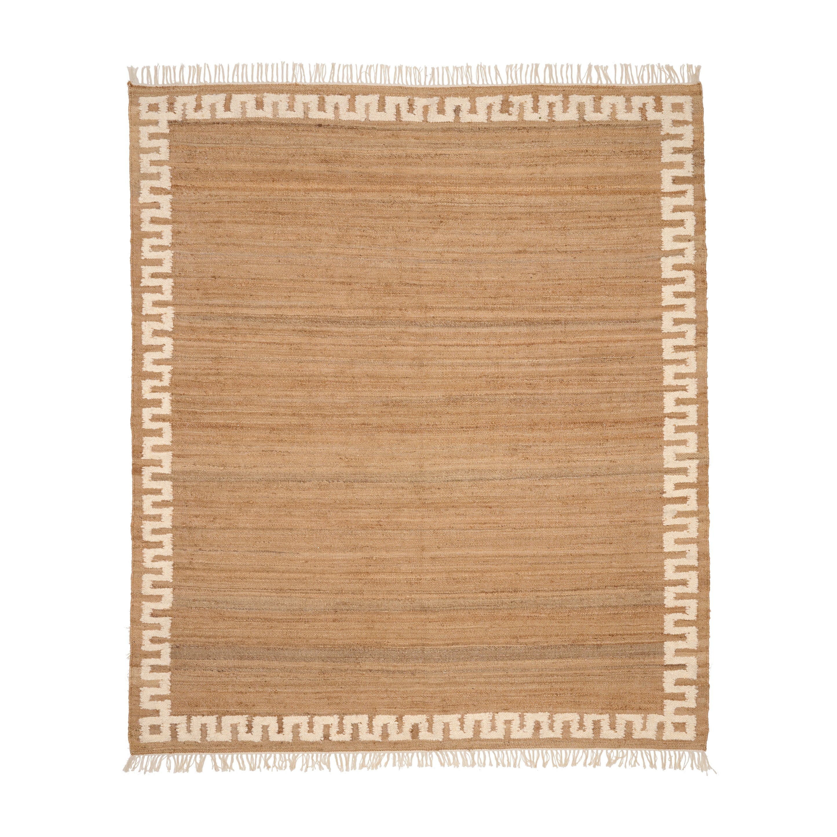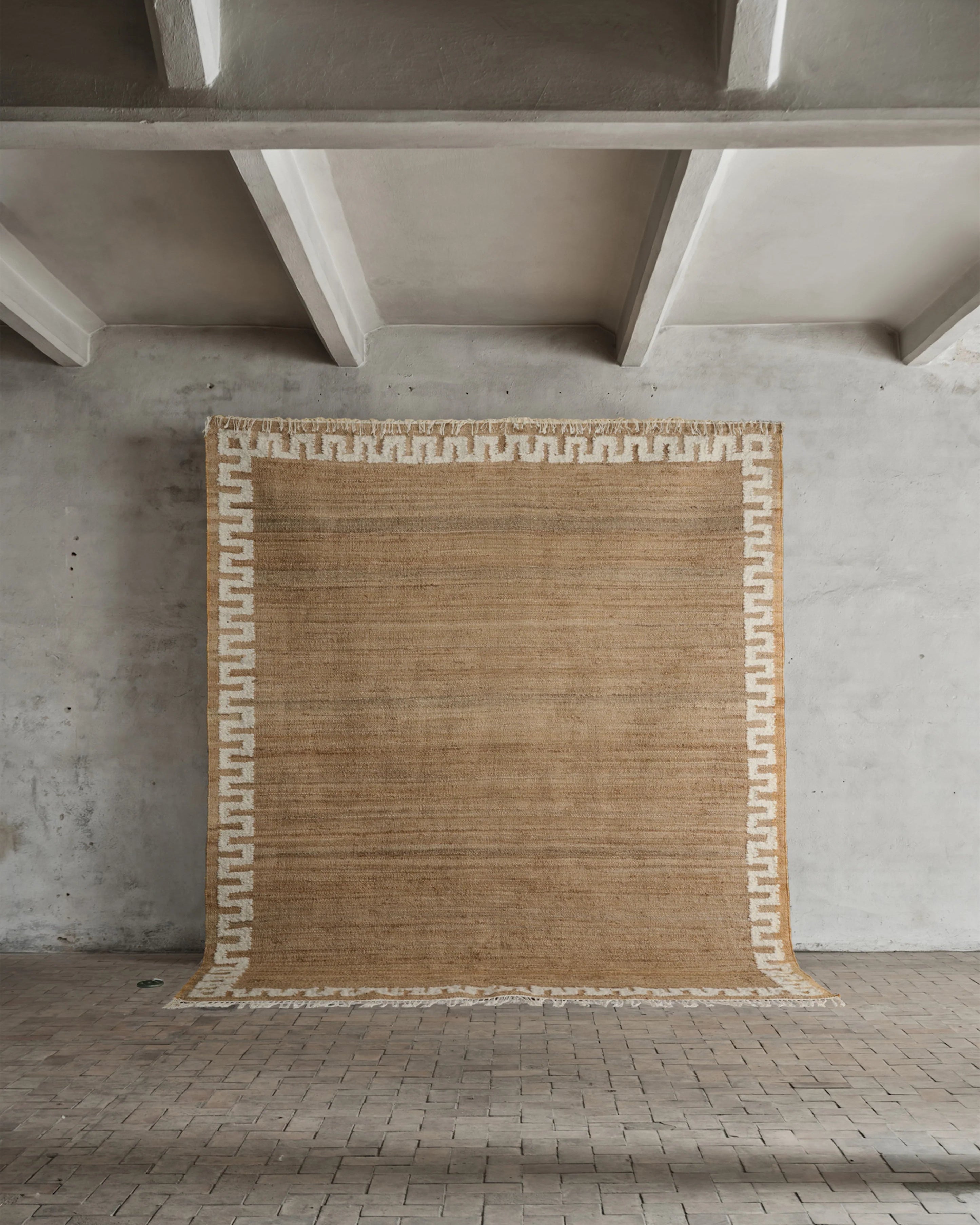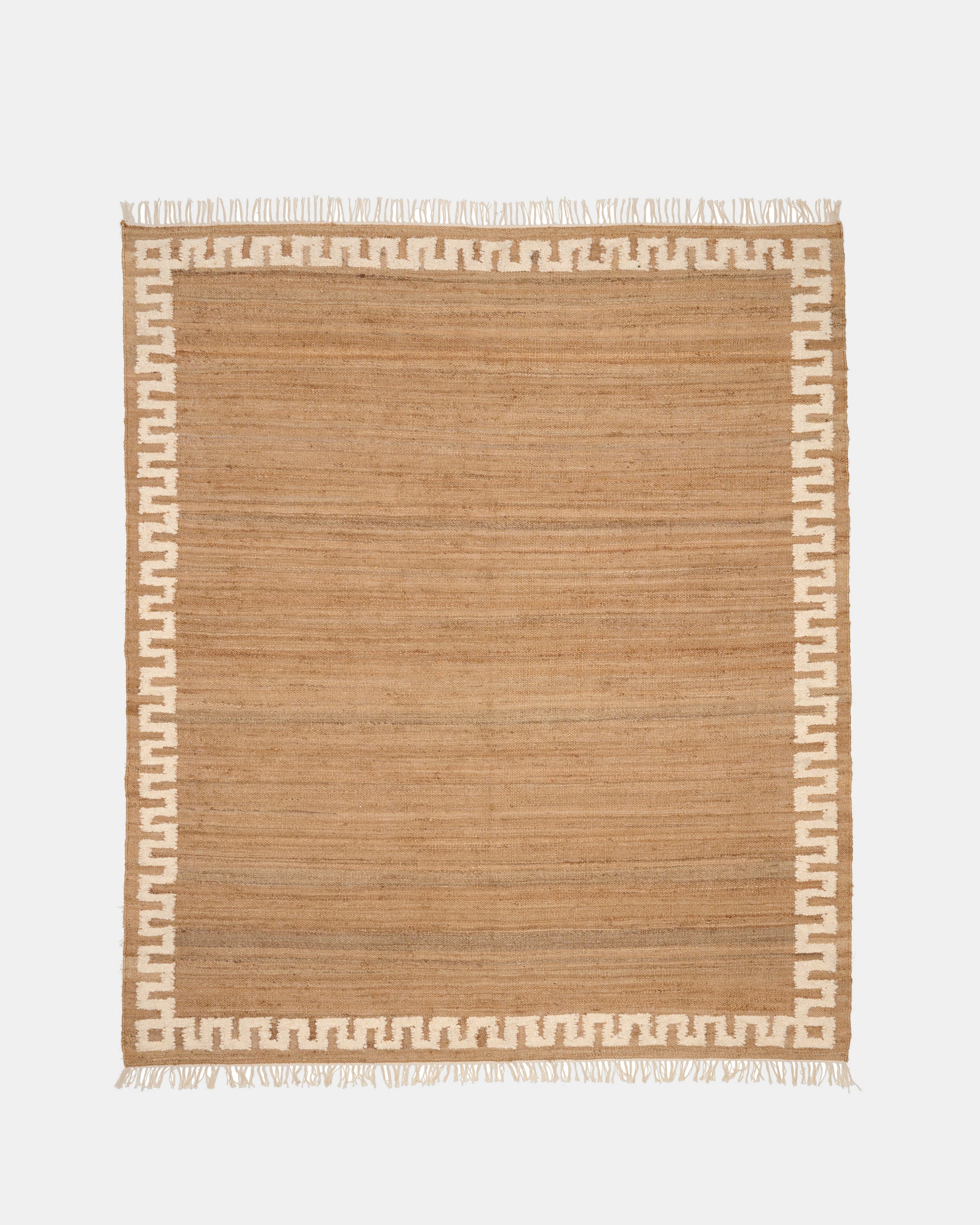 Dette håndvevde juteteppet uttrykker stille luksus gjennom sin rike tekstur og raffinerte enkelhet. Laget av 100 % naturlige fibre, har det en varm, jordnær tone som fremheves av en markant, strukturert kant – som gir et grafisk uttrykk og løfter det organiske materialet.