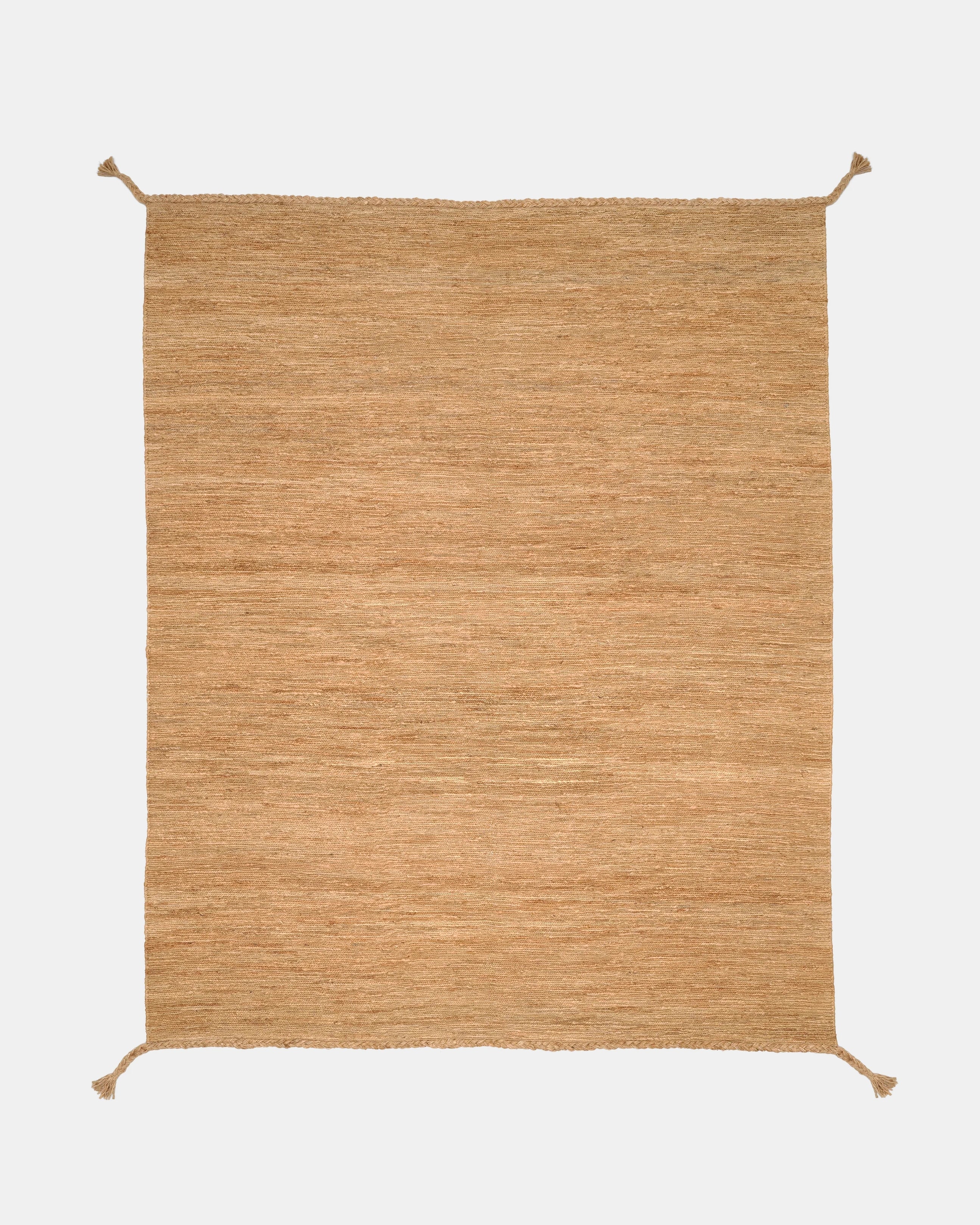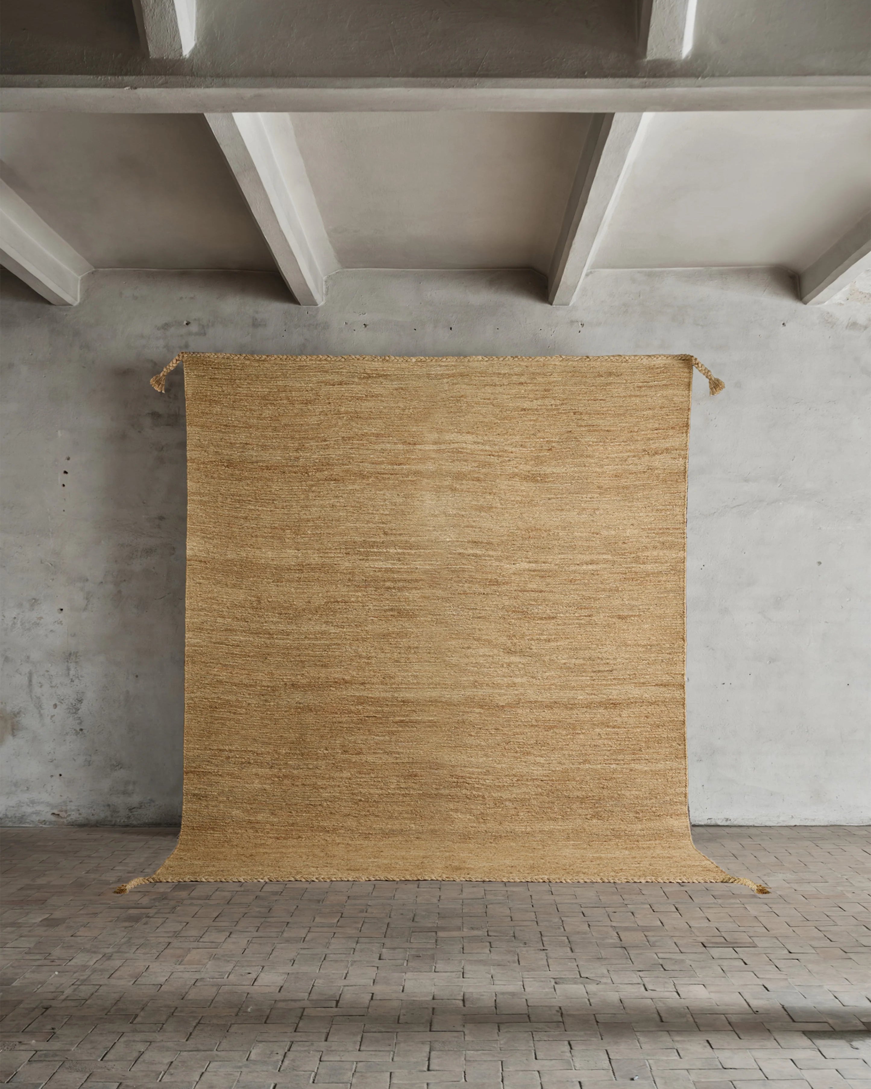 Dette håndvevde juteteppet uttrykker stille luksus gjennom sin rike tekstur og raffinerte enkelhet. Laget av 100 % naturlige fibre, har det en varm, jordnær tone som fremheves av en markant, strukturert kant – som gir et grafisk uttrykk og løfter det organiske materialet.