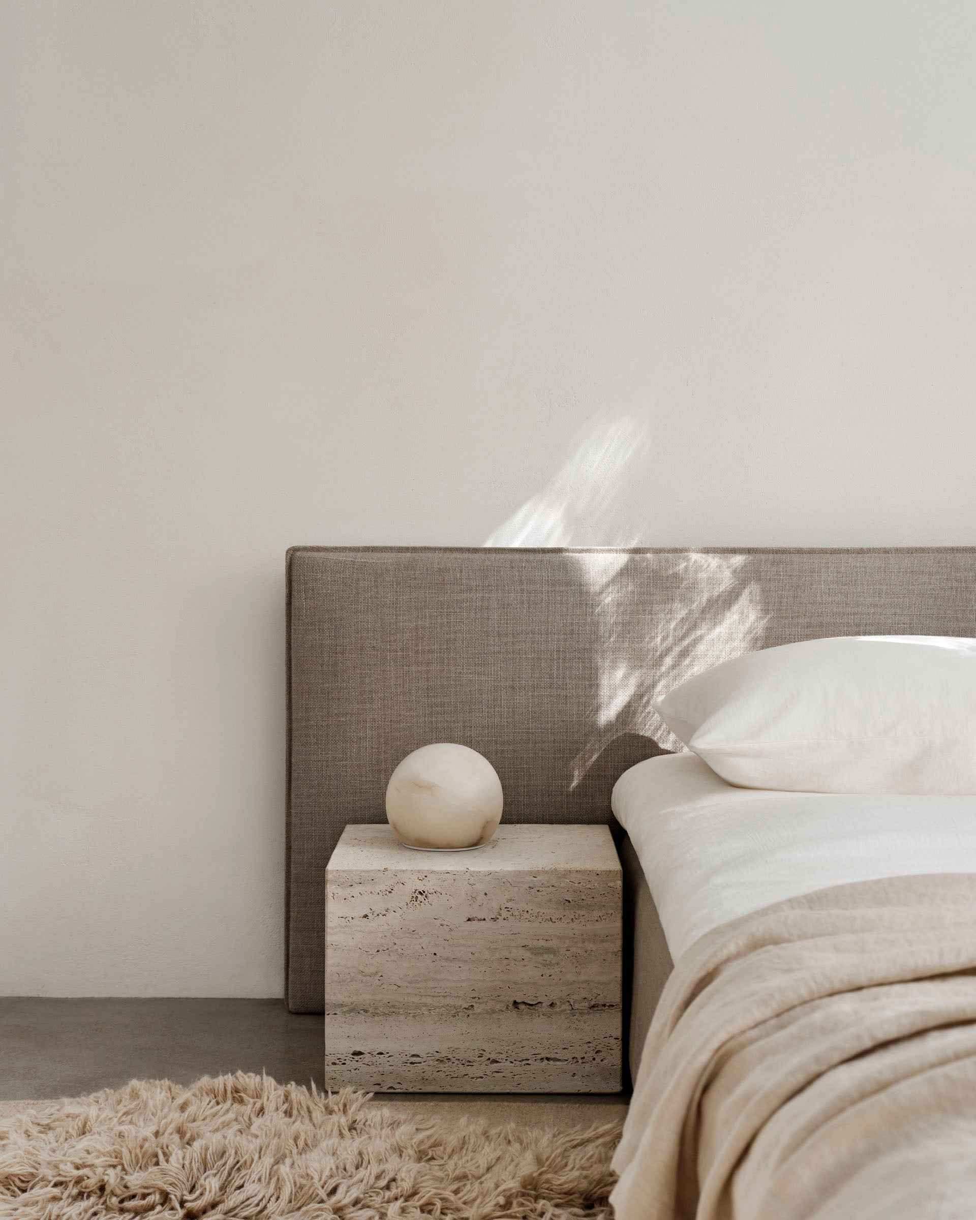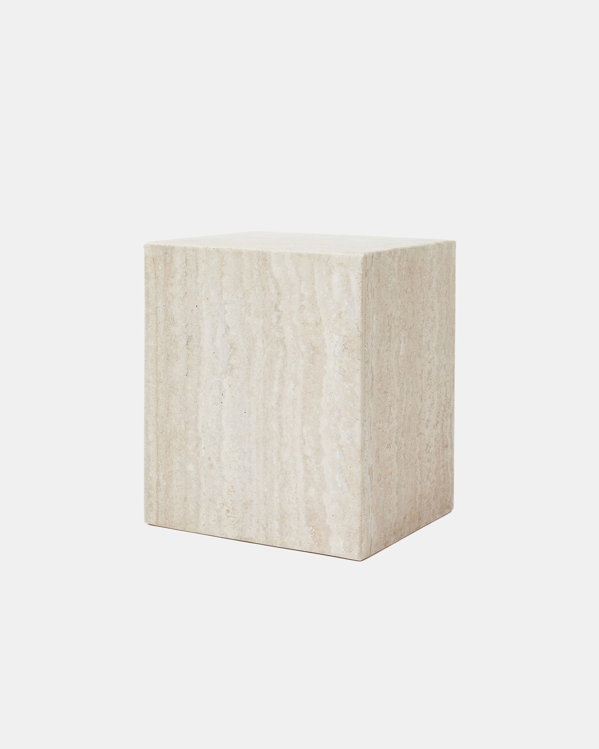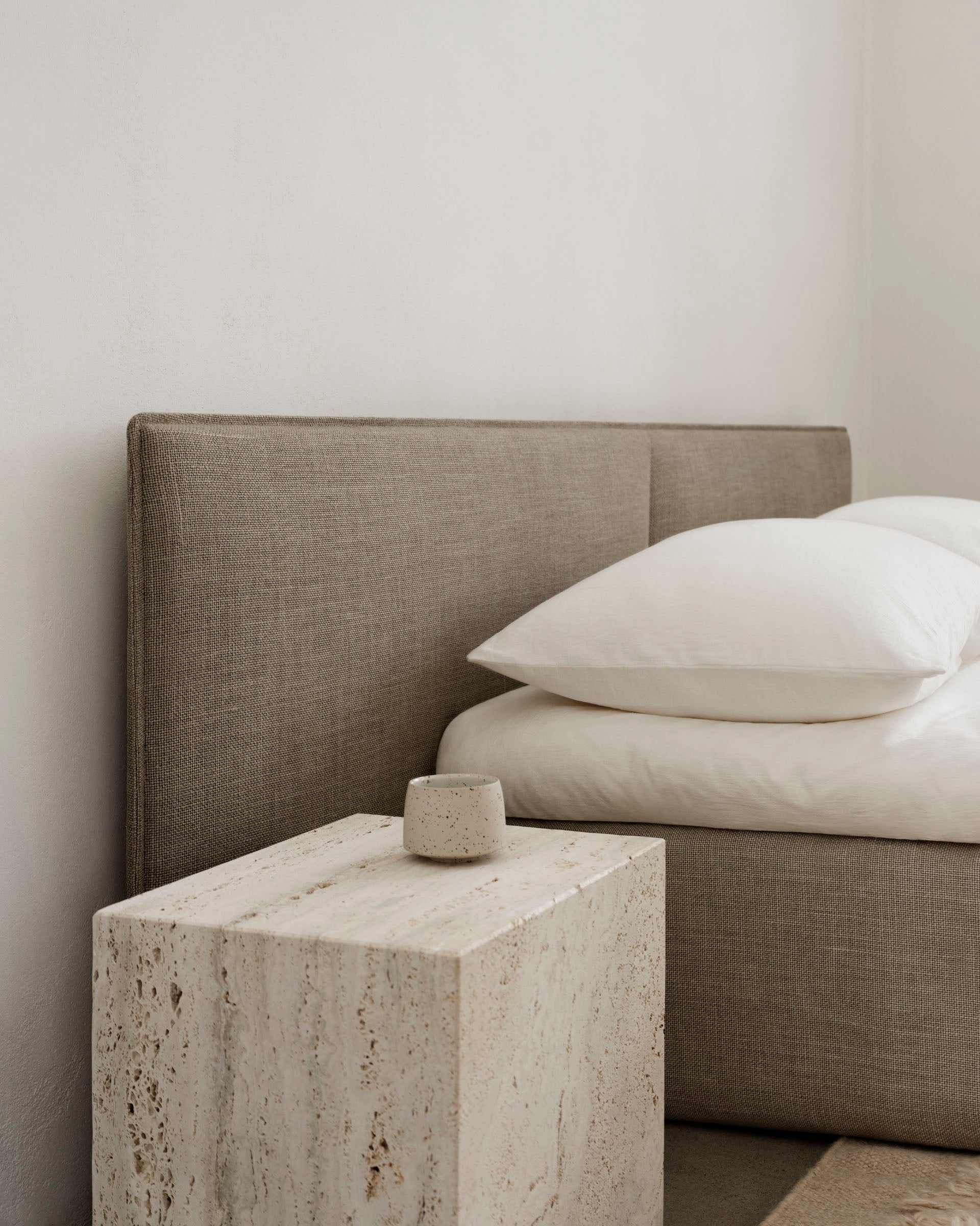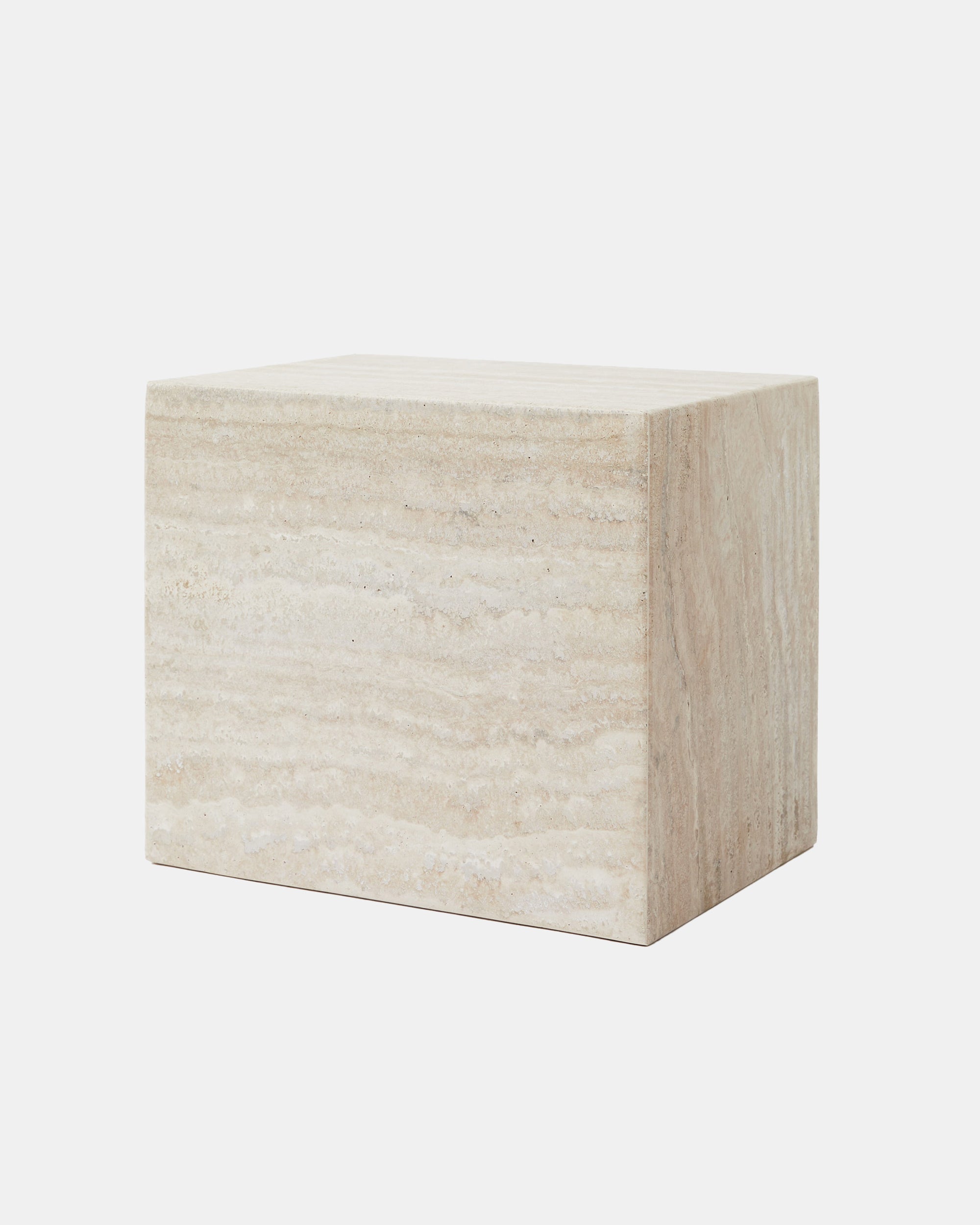 The Nightstand Travertine fra Studio Vraco er et kompakt nattbord med en tydelig, arkitektonisk form, utført i massiv italiensk travertin. Den monolittiske silhuetten fremhever materialets naturlige struktur, og gir et uttrykk som balanserer råhet og eleganse.