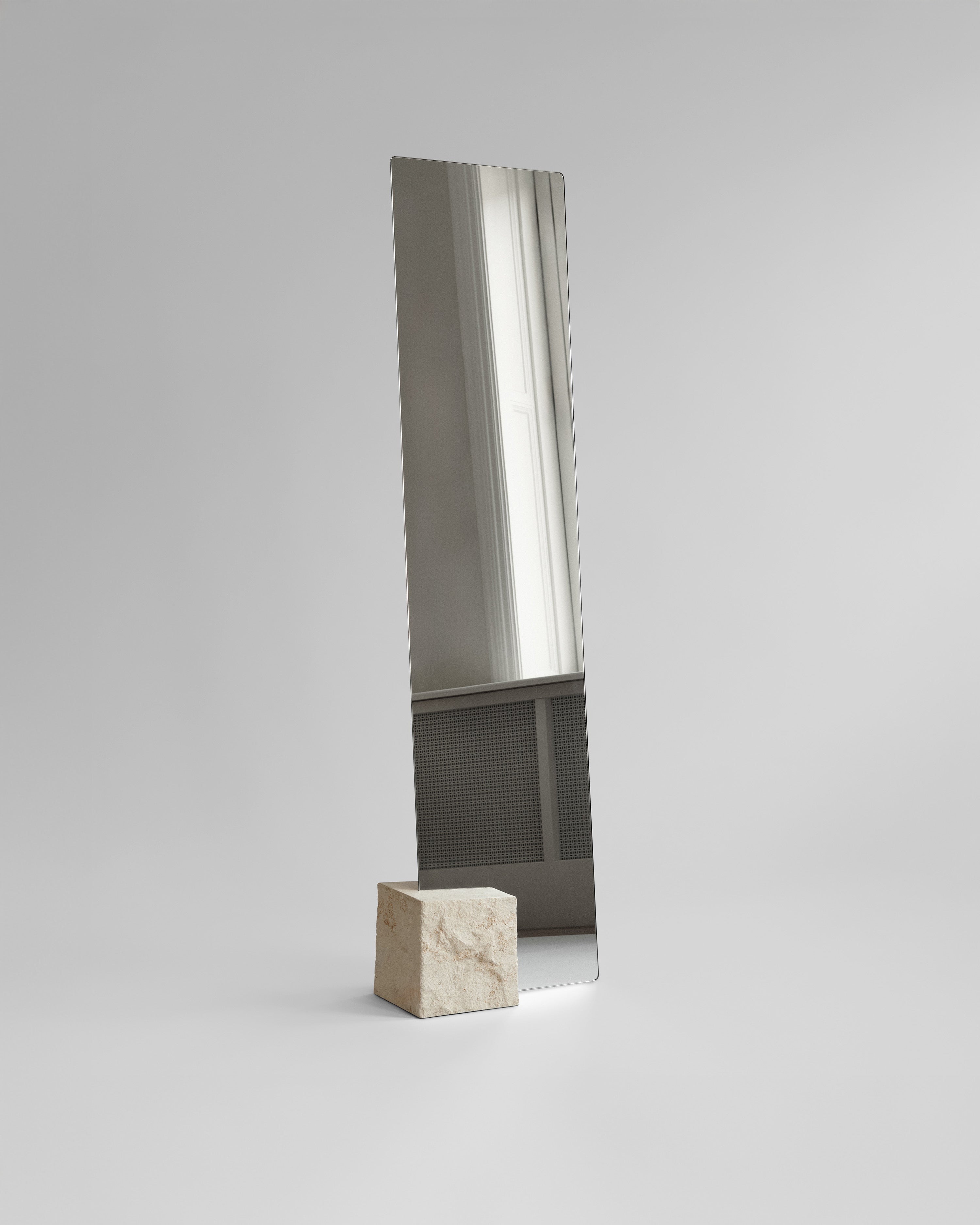Et slankt, rektangulært speil er plassert i en solid base av kalkstein, der møtet mellom speil og stein skaper en tydelig og balansert helhet. Kalksteinens håndbearbeidede overflate gir naturlig struktur og karakter, og tilfører dybde og et ærlig uttrykk til designet.
