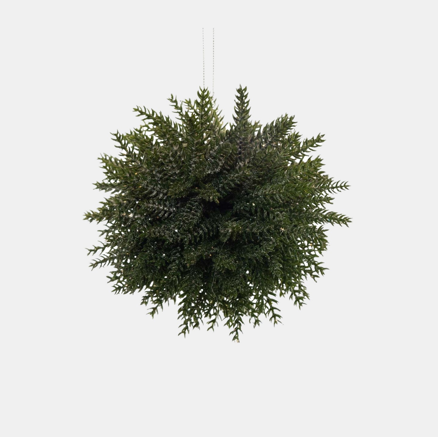 Søt liten julekule av små gran-grener dekket av litt snødekor og sølvglitter. Dekorative i både vinduer, bord og på juletreet.