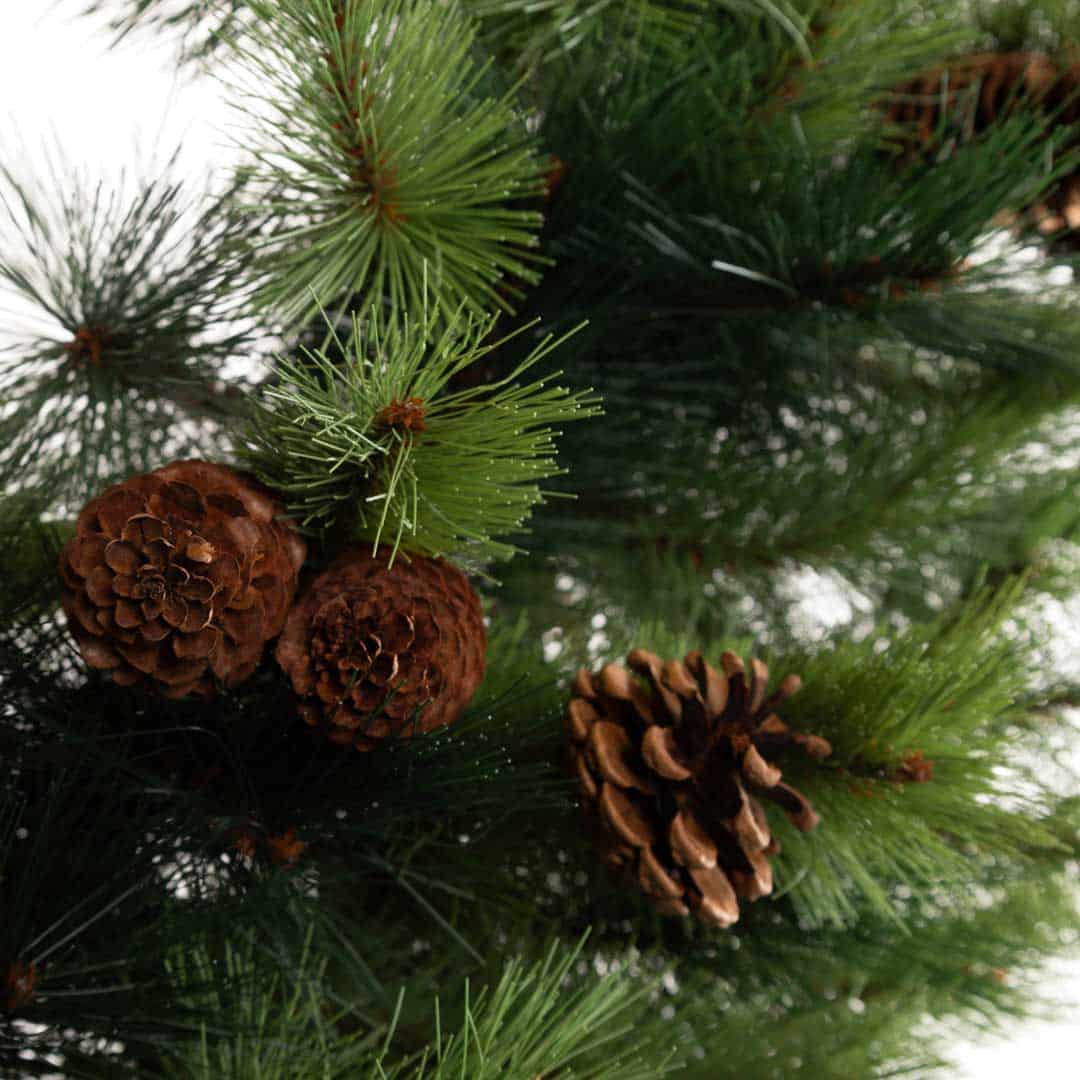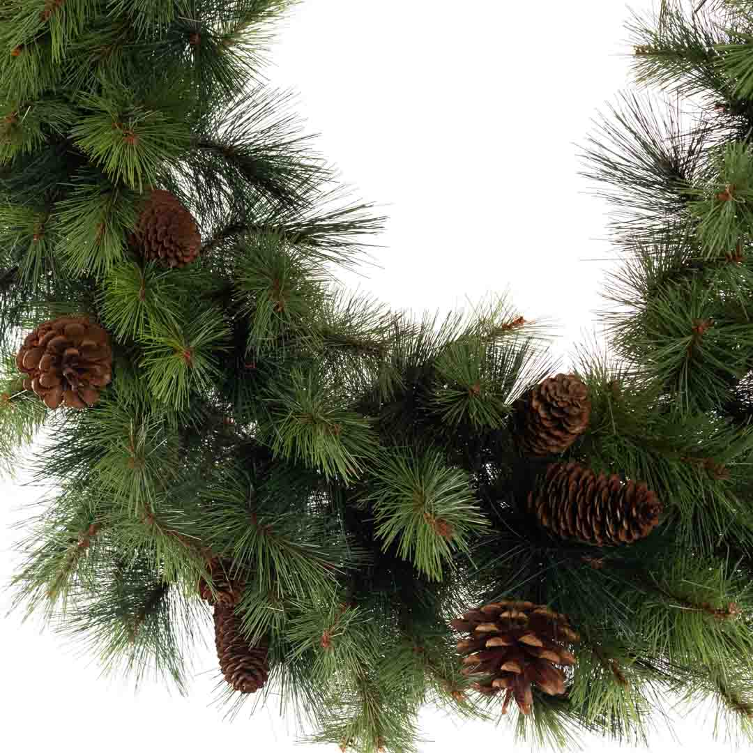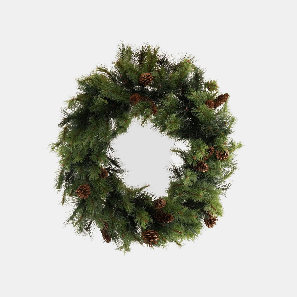 Kunstig julekrans i furu med ekte kongler. Fyldig og variabel i grønnfargene. Fås i 3 forskjellige størrelser: Ø60cm, Ø90cm, Ø120cm.