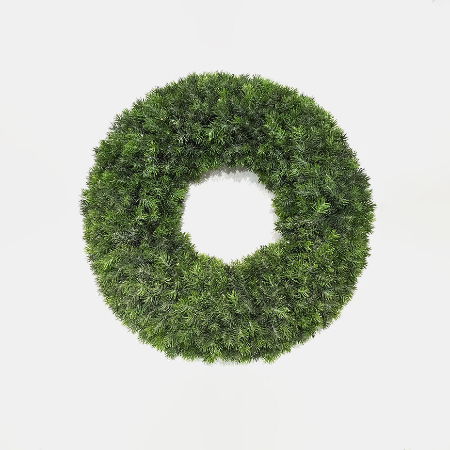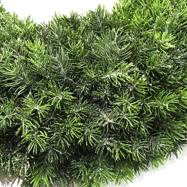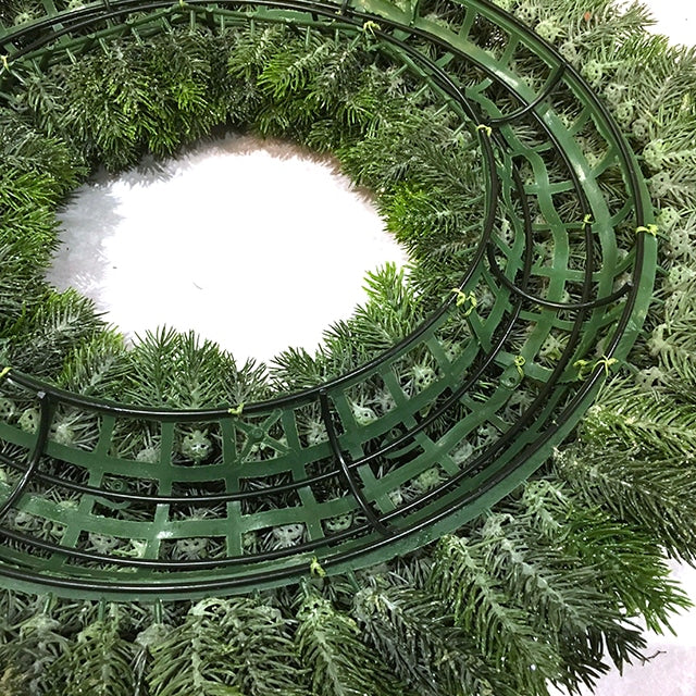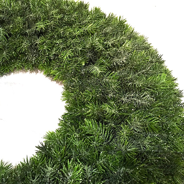 Tett, fyldig krans i gran. Variabel i grønnfarger med sølvglitter som dekor.