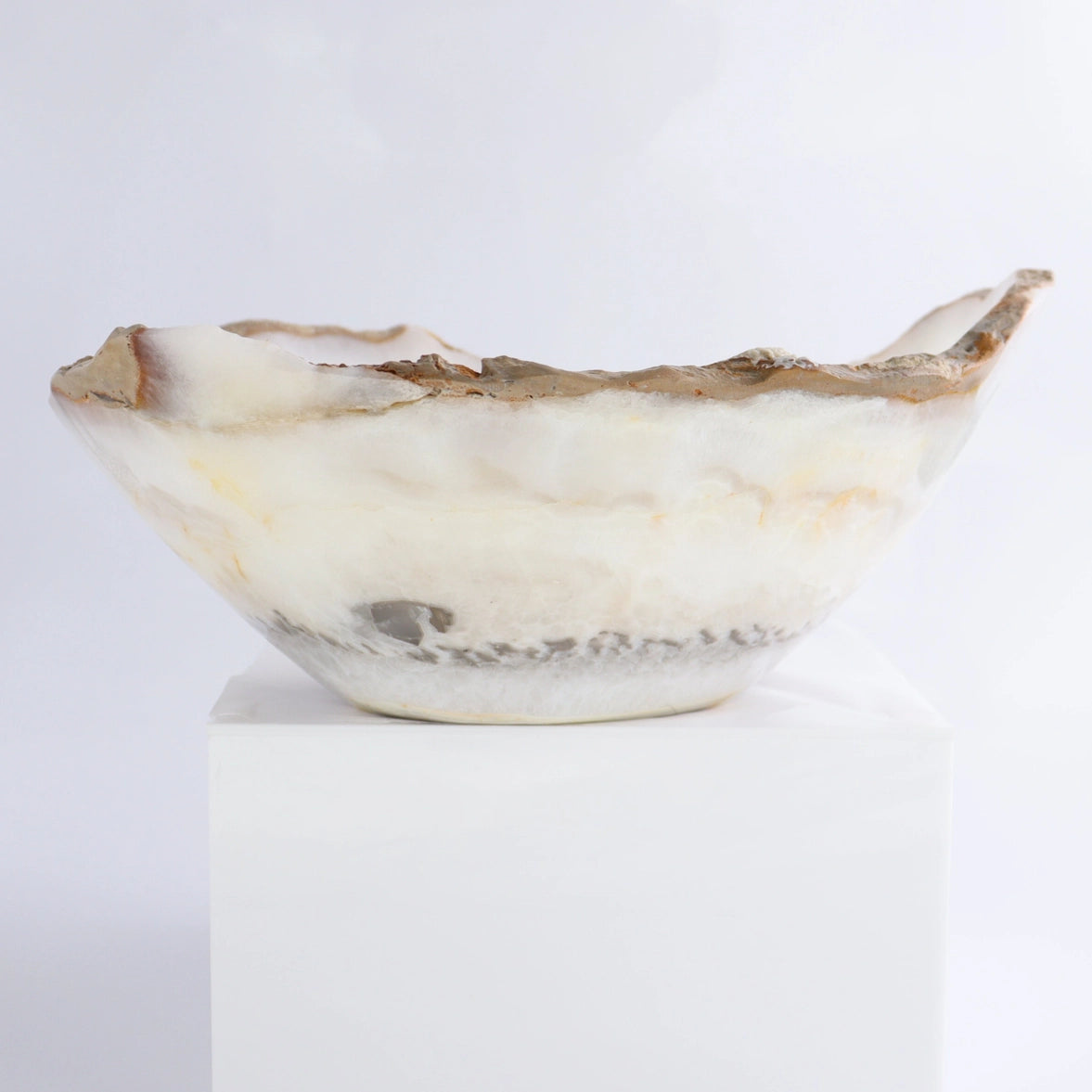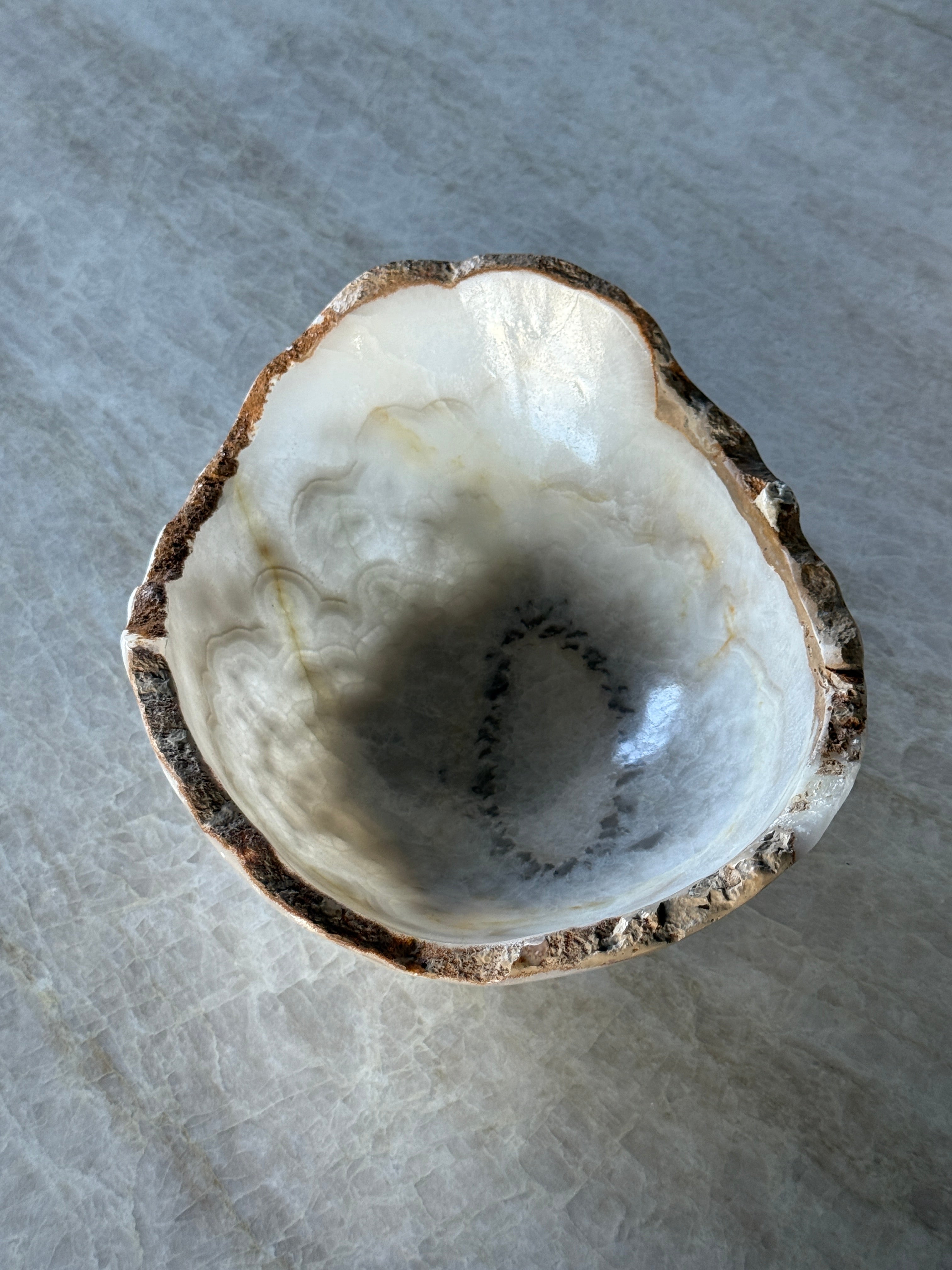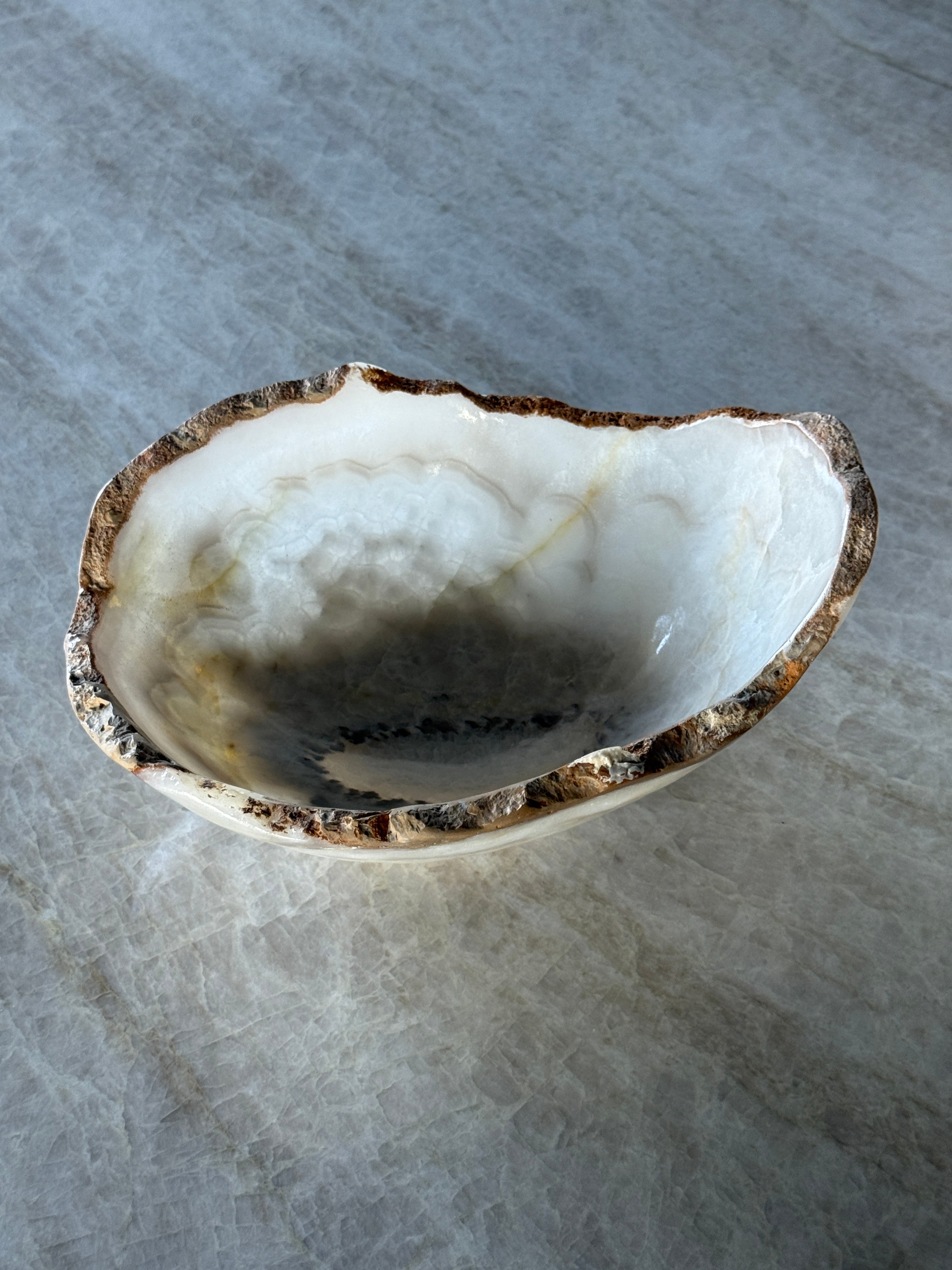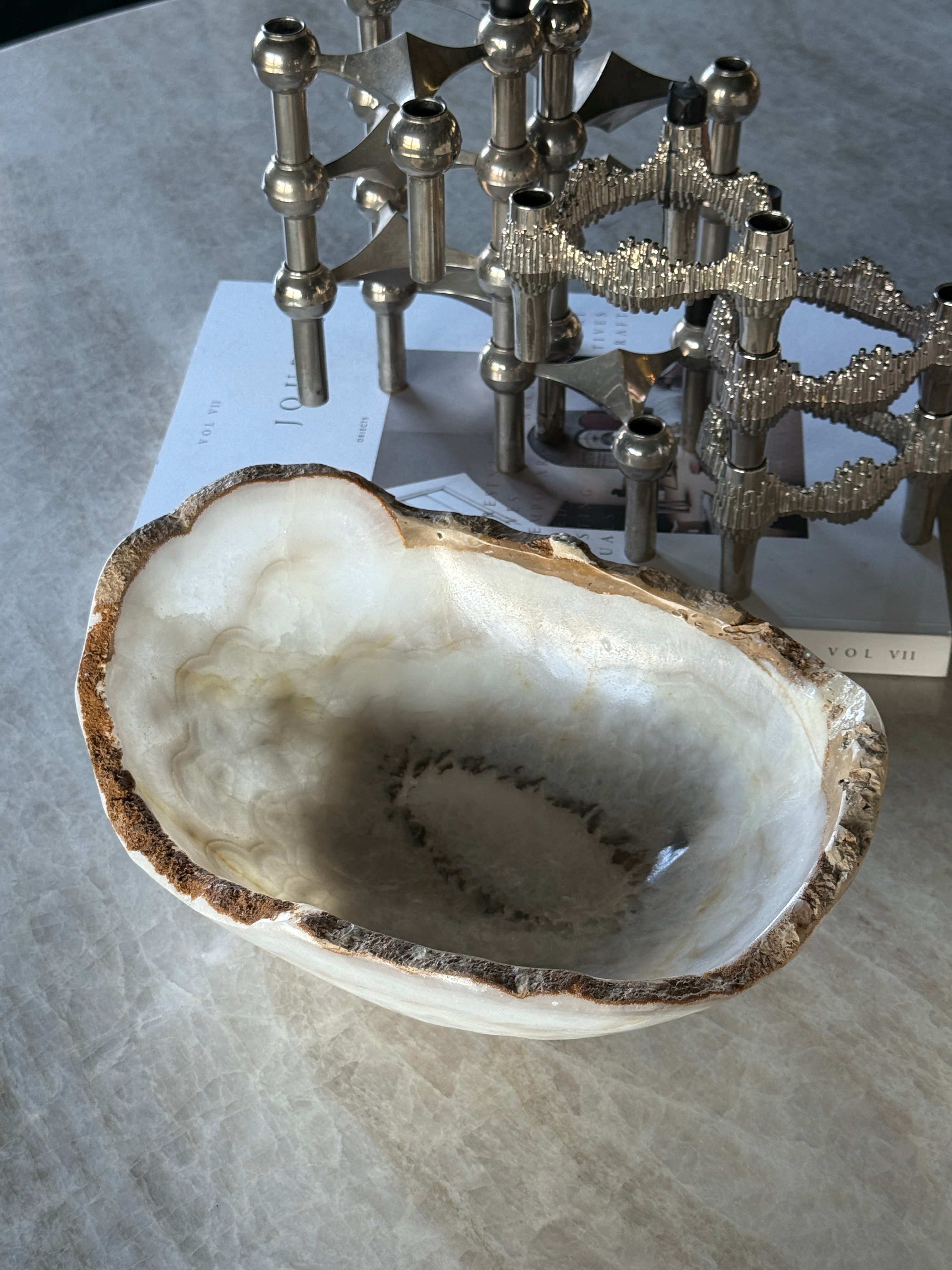 En unik vakker håndlaget skål i ren lys onyx! Et perfekt element som er like fin til dekor som til servering eller oppbevaring!