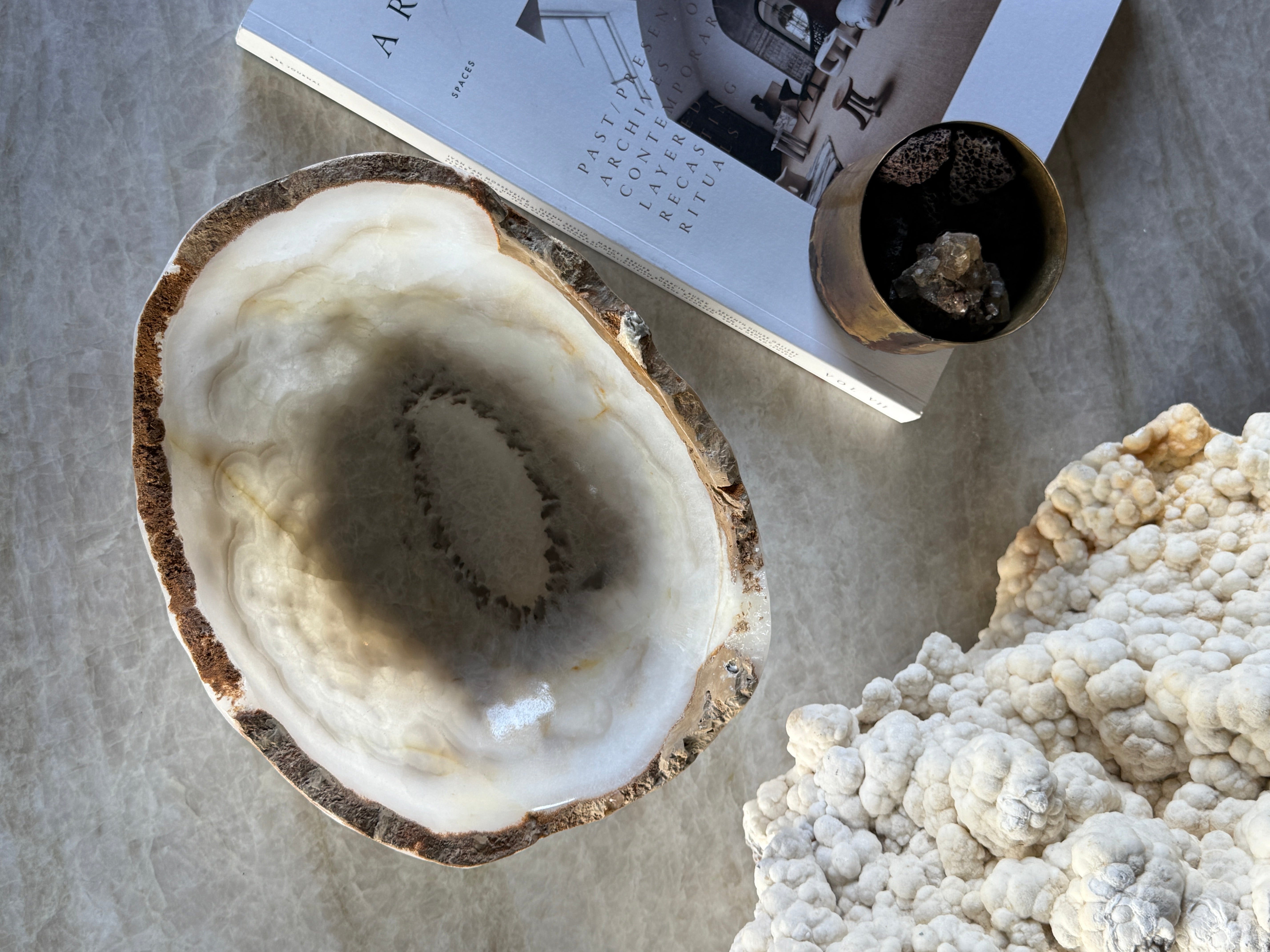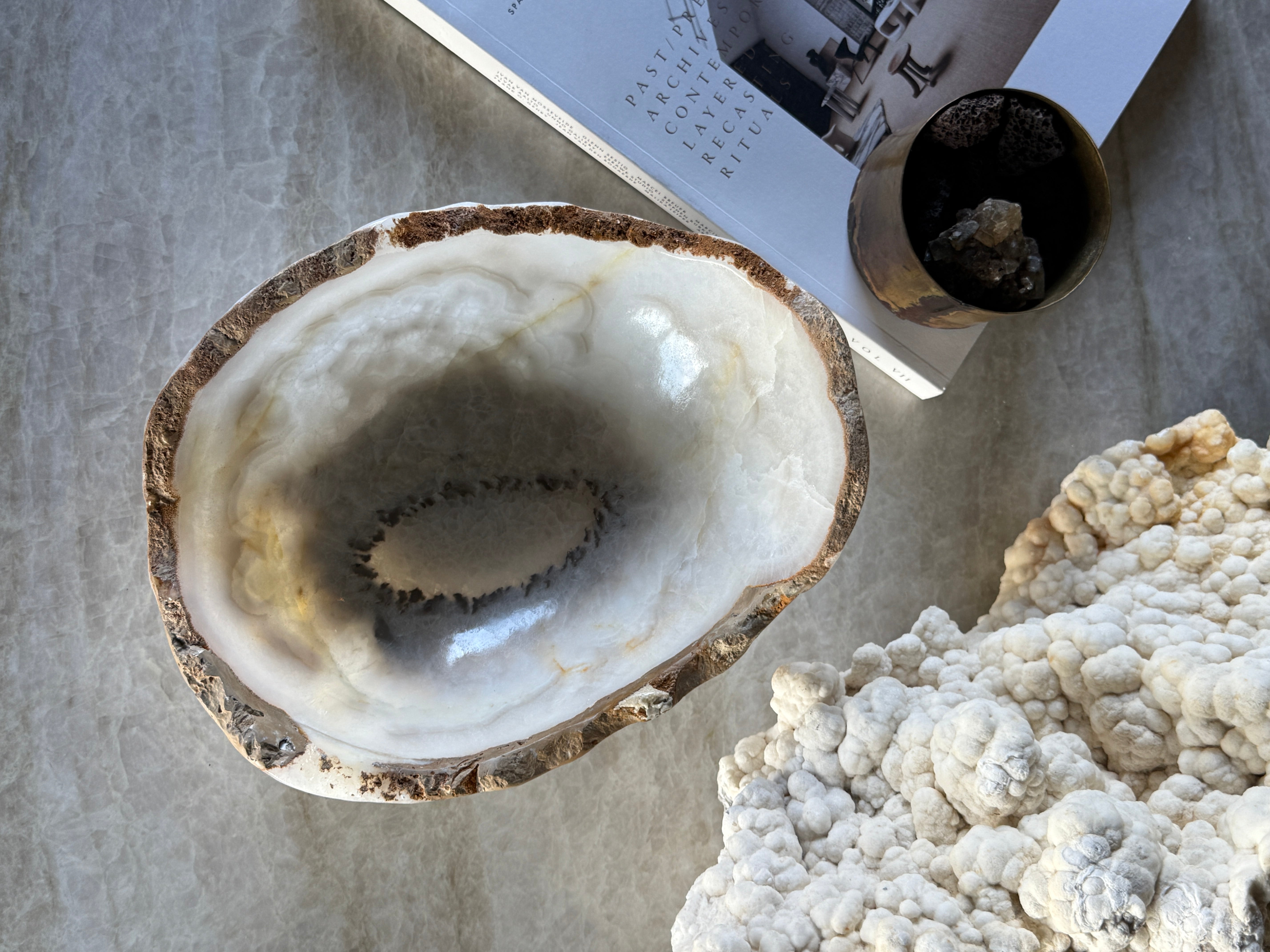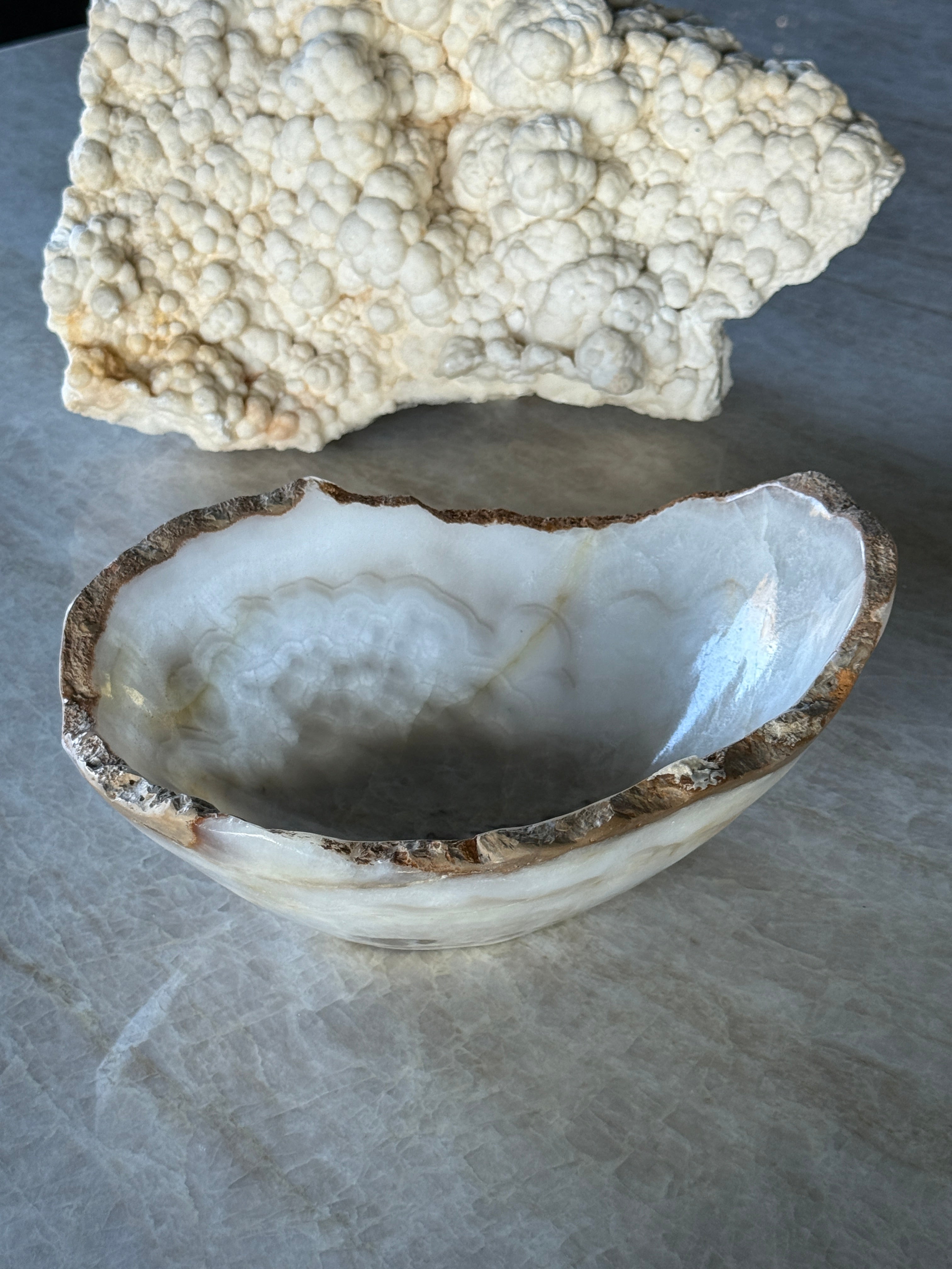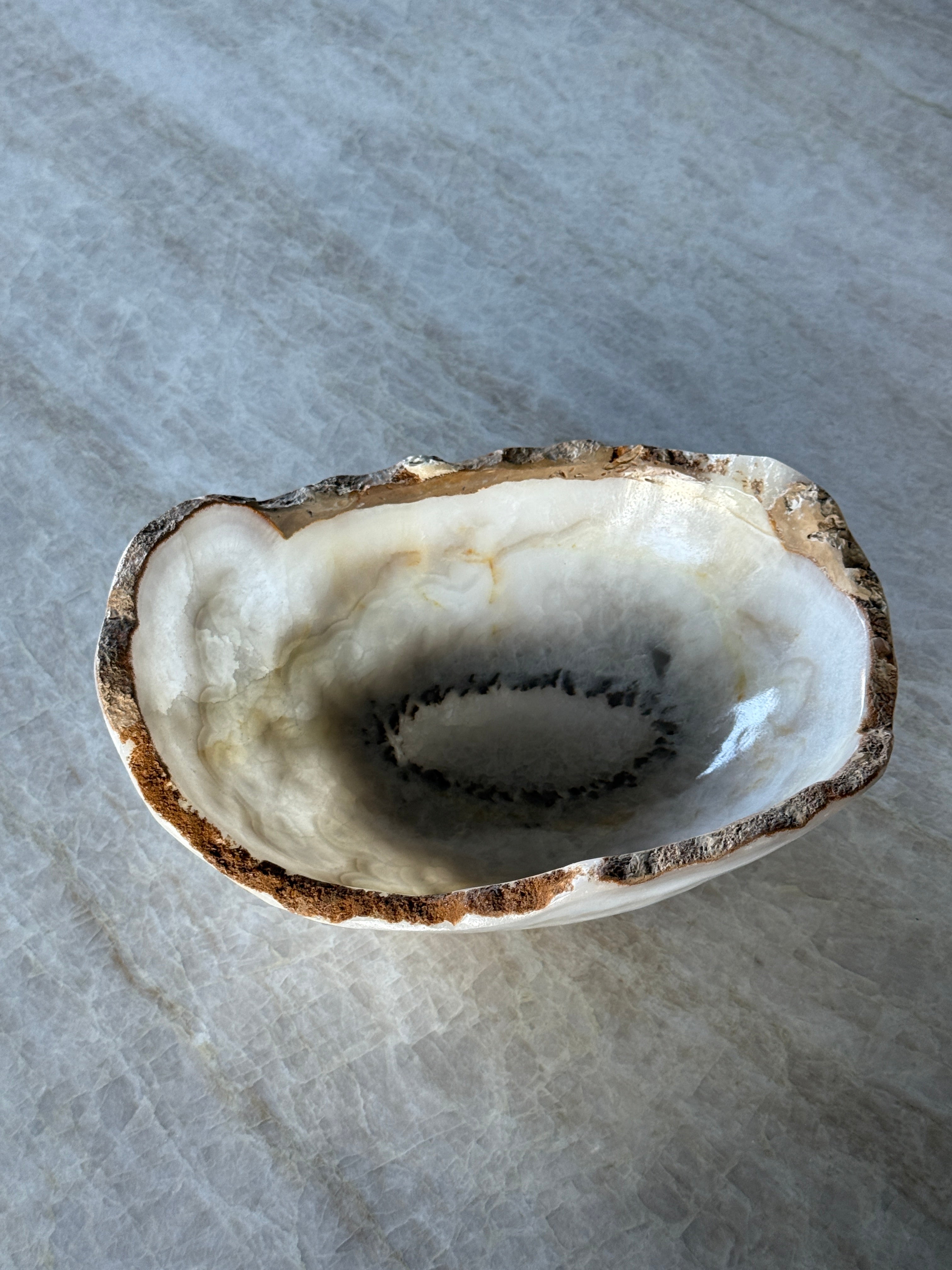 En unik vakker håndlaget skål i ren lys onyx! Et perfekt element som er like fin til dekor som til servering eller oppbevaring!